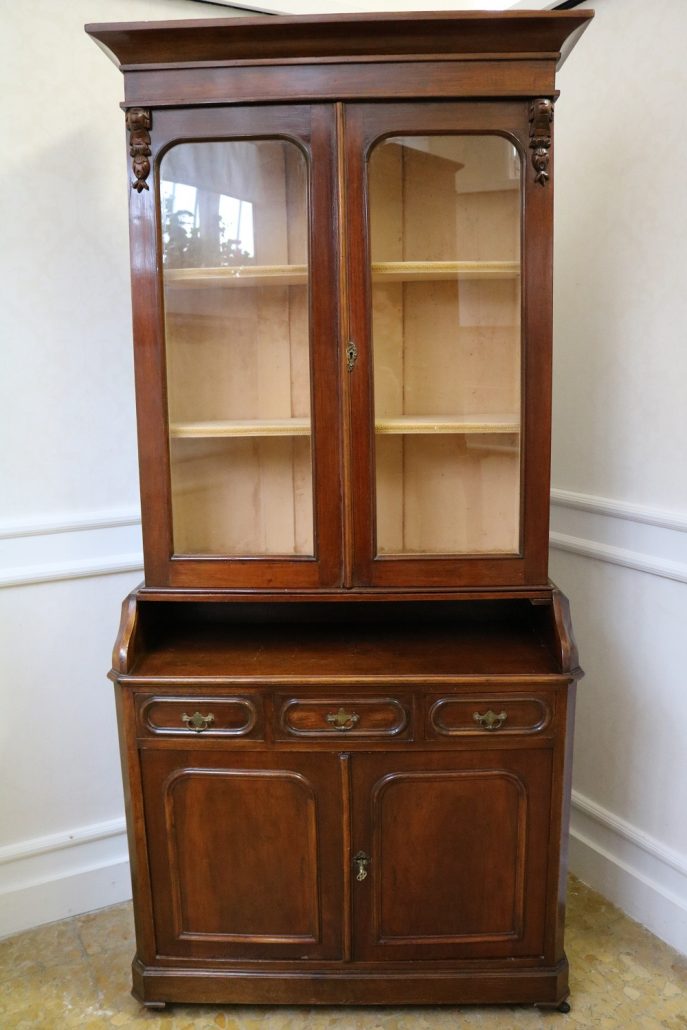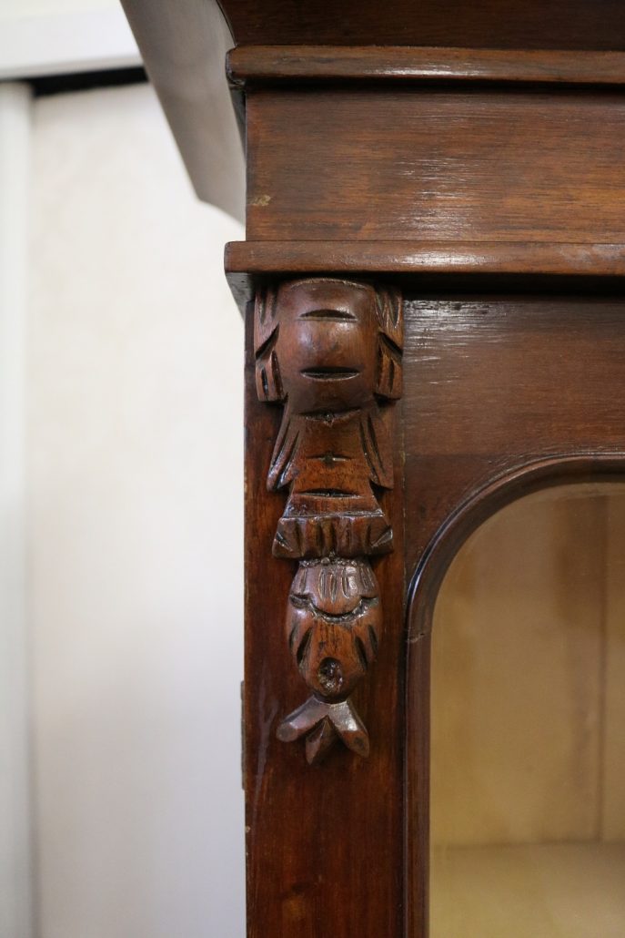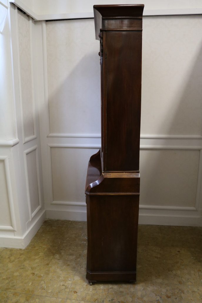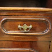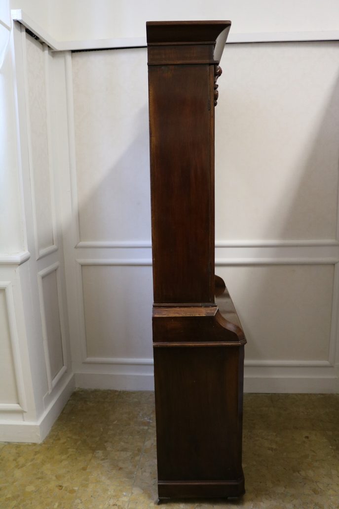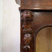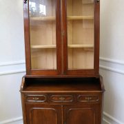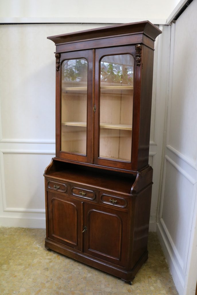 Credenza, libreria in mogano. Arredo composto da due parti, l’alzata con due ante con vetro mentre la base con vano a giorno, tre cassettini e due ante. Il mobile presenta una decorazione piuttosto ricca composta da intagli di frutti e foglie, cornici e modanature lungo tutta la superfice. I piedi, modanati, presentano le classiche rotelle, particolarità che caratterizza il mobile anglosassone. Gli interni, muniti di ripiani, sono rivestiti in tessuto rifinito da passamaneria. Anche la maniglieria presenta stilemi tipici dell’ Inghilterra con la maniglietta pendente su placca sagomata.