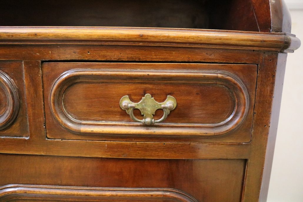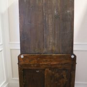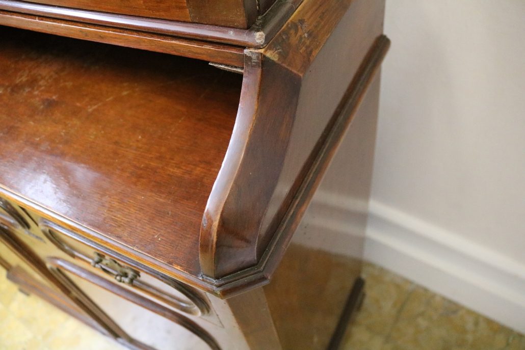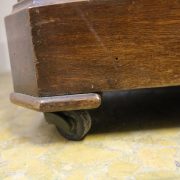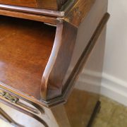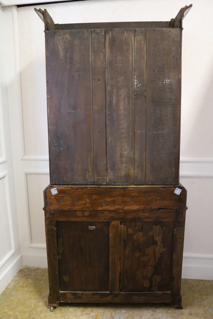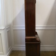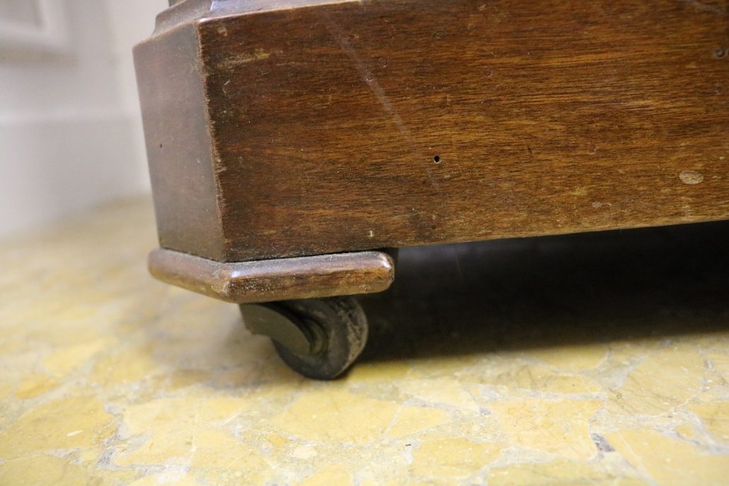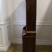 Credenza, libreria in mogano. Arredo composto da due parti, l’alzata con due ante con vetro mentre la base con vano a giorno, tre cassettini e due ante. Il mobile presenta una decorazione piuttosto ricca composta da intagli di frutti e foglie, cornici e modanature lungo tutta la superfice. I piedi, modanati, presentano le classiche rotelle, particolarità che caratterizza il mobile anglosassone. Gli interni, muniti di ripiani, sono rivestiti in tessuto rifinito da passamaneria. Anche la maniglieria presenta stilemi tipici dell’ Inghilterra con la maniglietta pendente su placca sagomata.