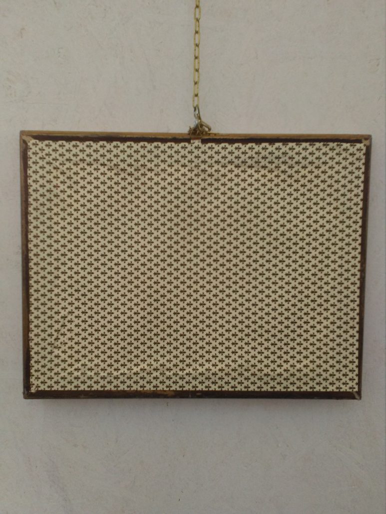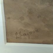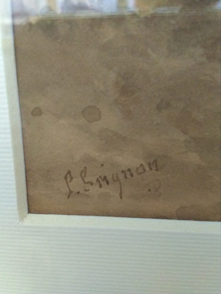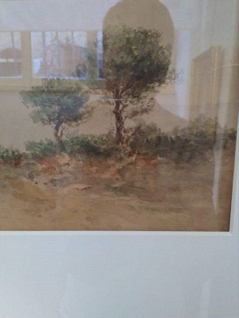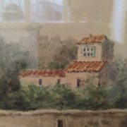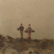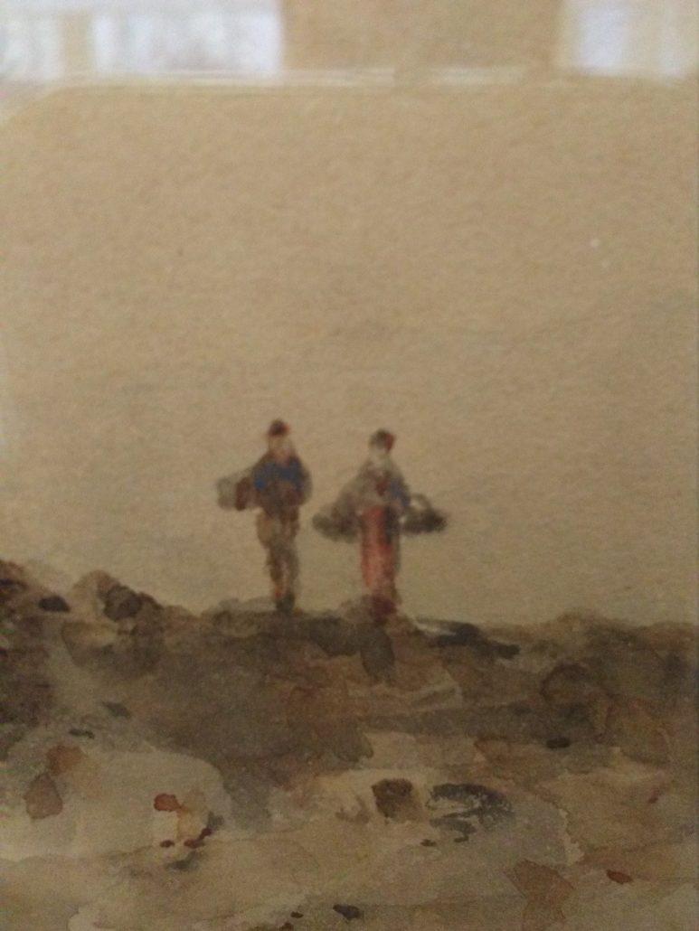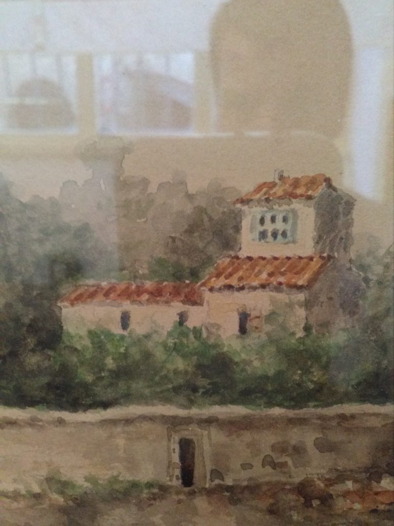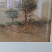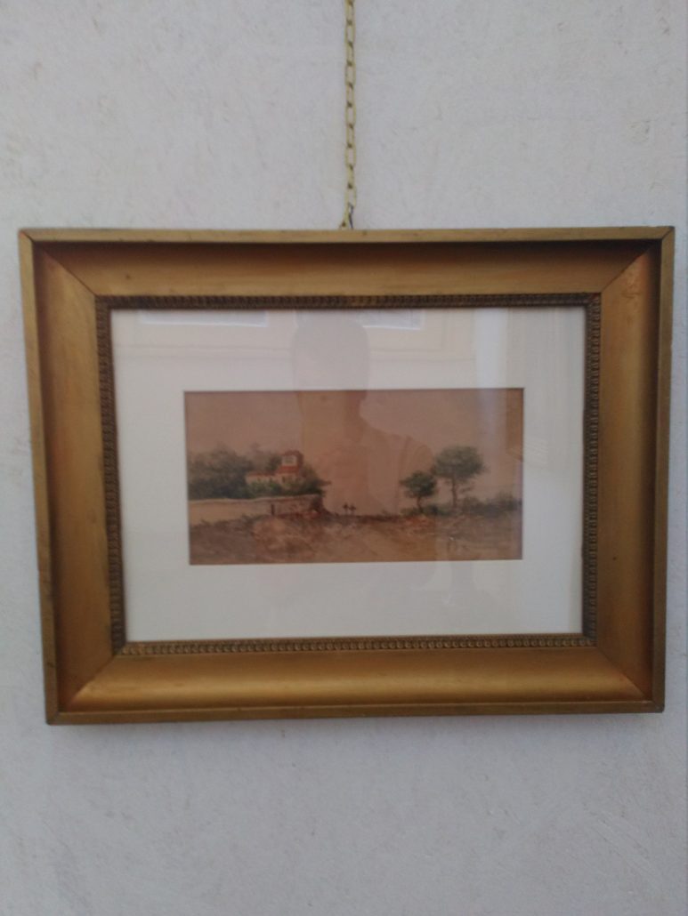 Dipinto, acquarello su carta, “Paesaggio”. Di buona mano pittorica, questa opera presenta dettagli ricercati e minuziosi. Un casolare si staglia su di un cielo al crepuscolo, mentre sulla strada procedono due viandanti.