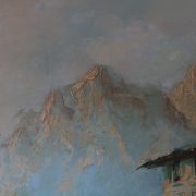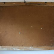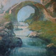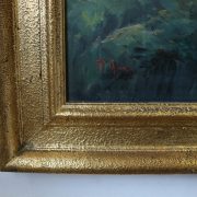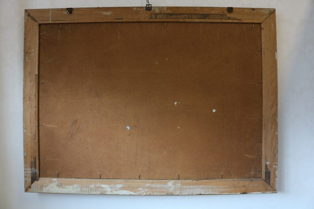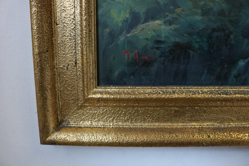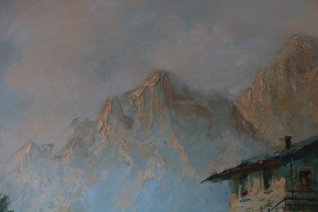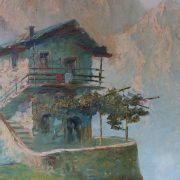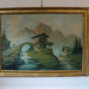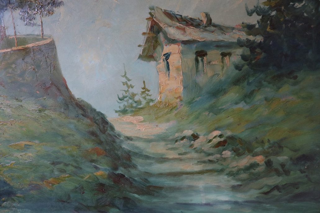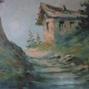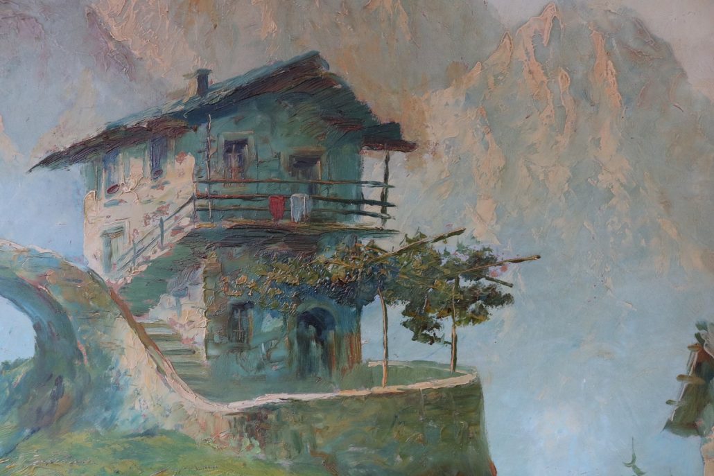 Dipinto, olio su masonite, “Paesaggio con baita”. Opera di fantasia dove l’autore si destreggia nell’uso del colore a olio, molto materico, in una infinità di sfumature, rendendo il dipinto molto piacevole e di bell’impatto visivo. Al centro è posta una baita in pietra e legno, costruita su di un promontorio roccioso aggettante su un torrente. Un grazioso ponte ad arco, collega l’edificio all’altra sponda. Tutto immerso in una vegetazione alpina ed illuminato da una romantica luce mattutina. Presentato in cornice dorata coeva.
