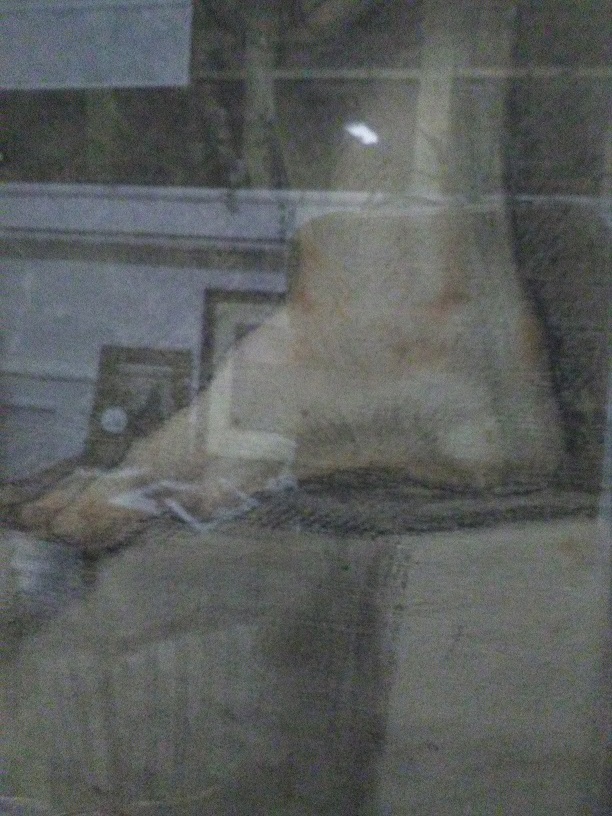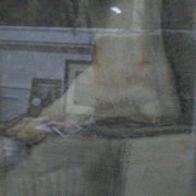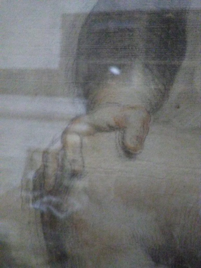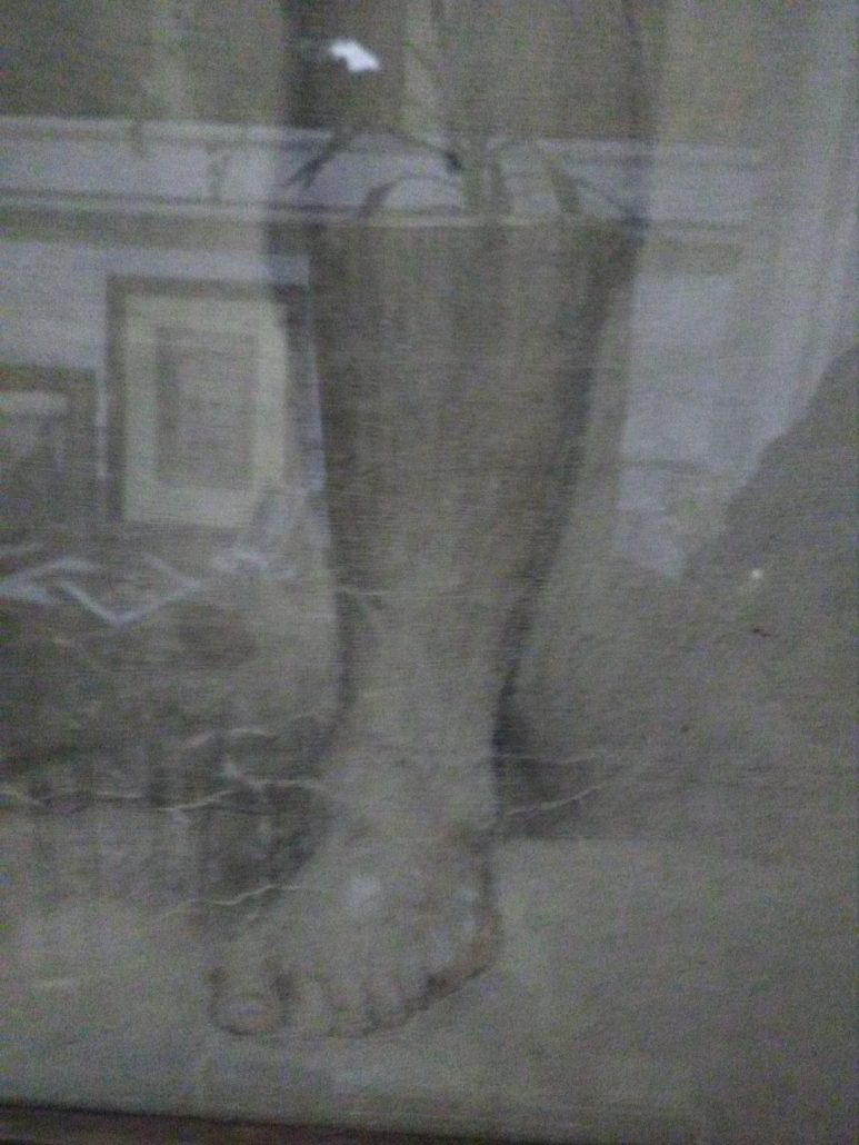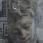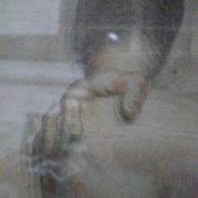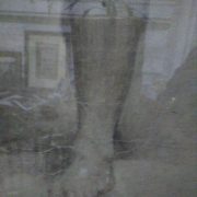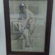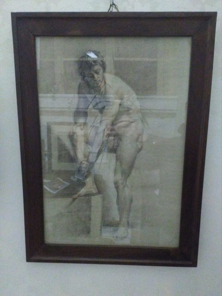 Disegno a matita, “studio di nudo”. L’opera ritrae un giovane modello, dai capelli arruffati, nel pieno della sua virilità. L’uomo poggia il piede destro su uno scalino e chinato si tiene la caviglia. Questa posizione si rifà a modelli classici, e sembra immortalare il momento in cui un atleta si prepara ad una competizione. L’artista, di abile mano, è riuscito a mettere ben in evidenza l’anatomia del corpo umano. Attraverso l’uso del chiaro scuro con il tratteggio, evidenziando con colpi di sanguinia, sembra immortalare la forza che scaturisce dalla tensione dai muscoli. Minuziosi i dettagli, quali il viso, i capelli, le dita; tutto evidenza una grande maestria esecutiva.