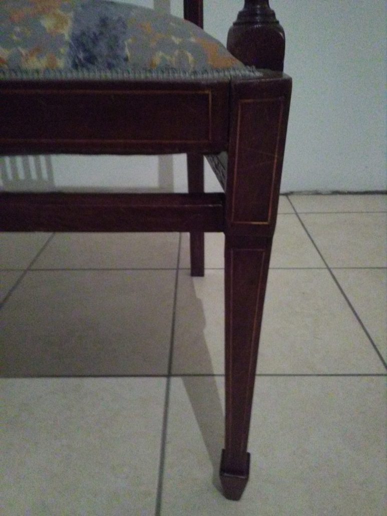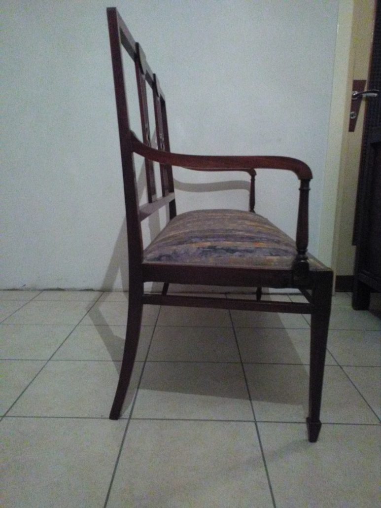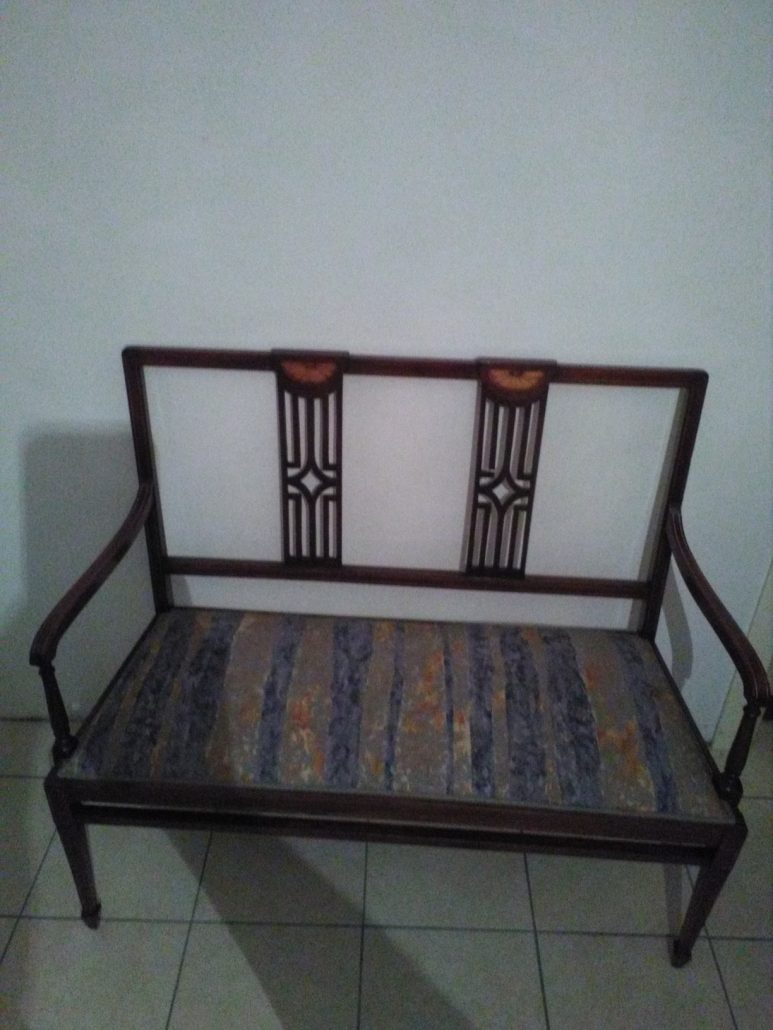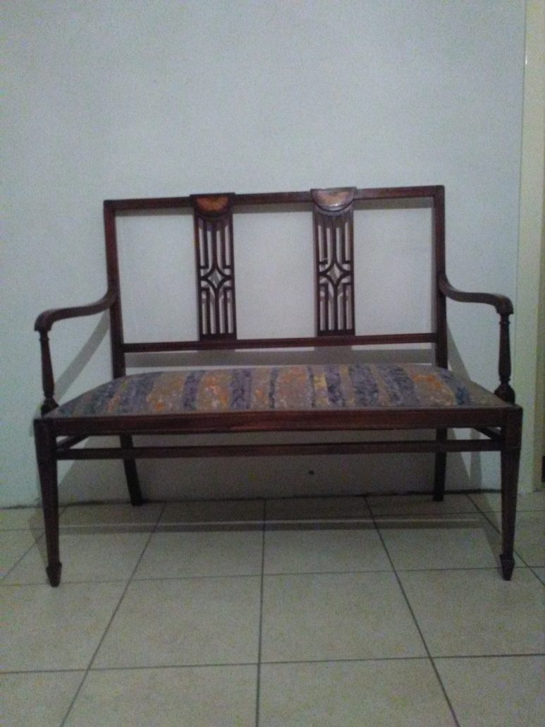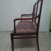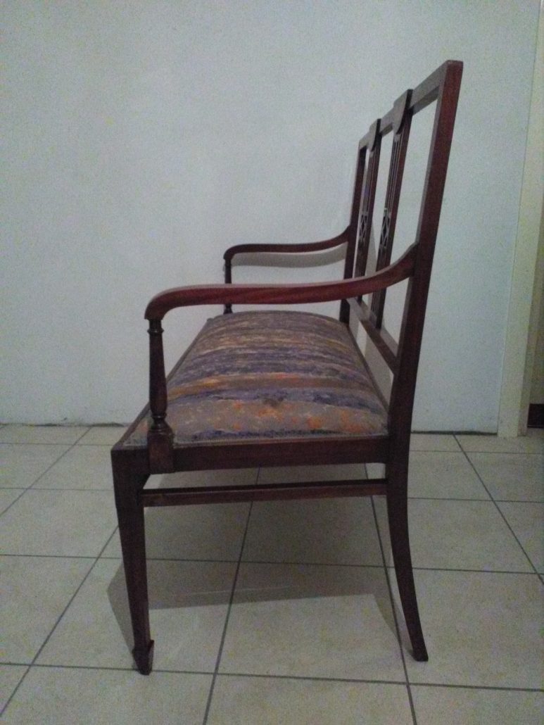 Divanetto in mogano con intarsi in acero. Quattro gambe a obelisco rovesciato, unite tra loro da traversi, sostengono il sedile imbottito. Da quest’ultimo, si ergono i braccioli a balaustro torniti, reggenti, il bracciolo innestato nello schienale a giorno, suddiviso con due cartelle traforate con motivi geometrici. Arredo caratterizzato da linee semplici, forme sobrie e molto eleganti arricchite da particolari decorativi di squisita fattura come: filettature in acero lungo tutti i profili, intarsi di gusto inglese e giochi di pieni e vuoti nello schienale a giorno.