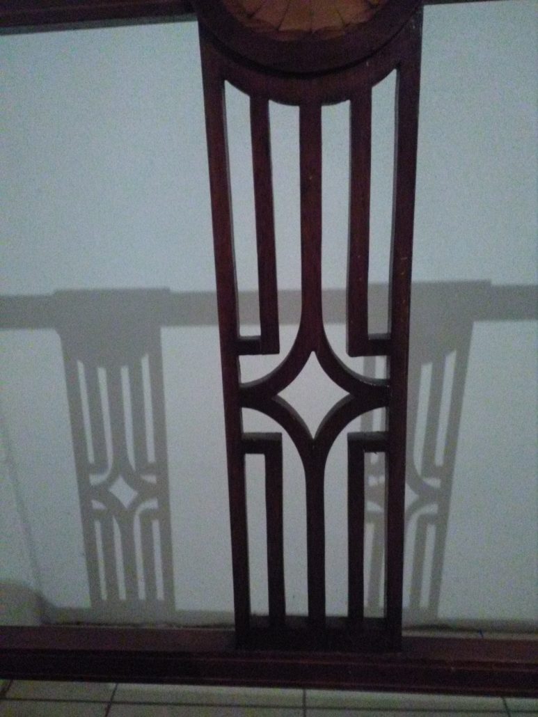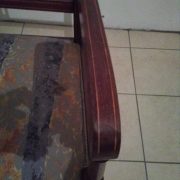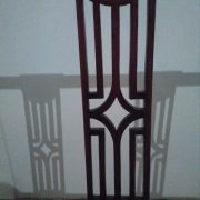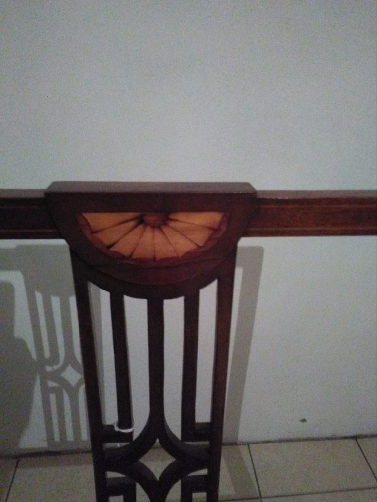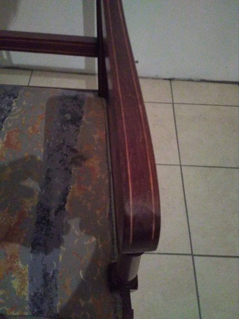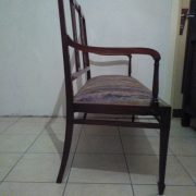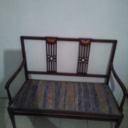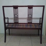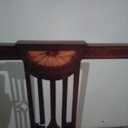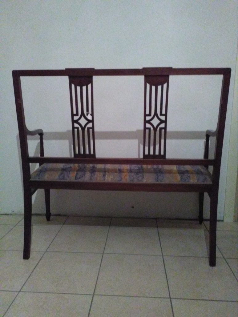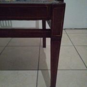 Divanetto in mogano con intarsi in acero. Quattro gambe a obelisco rovesciato, unite tra loro da traversi, sostengono il sedile imbottito. Da quest’ultimo, si ergono i braccioli a balaustro torniti, reggenti, il bracciolo innestato nello schienale a giorno, suddiviso con due cartelle traforate con motivi geometrici. Arredo caratterizzato da linee semplici, forme sobrie e molto eleganti arricchite da particolari decorativi di squisita fattura come: filettature in acero lungo tutti i profili, intarsi di gusto inglese e giochi di pieni e vuoti nello schienale a giorno.