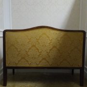 Arredo dalla sobria eleganza, veniva utilizzato per arredare ingressi, vestiboli, sale d’aspetto. L’ essenza di noce, utilizzata in notevole sezione, rende questo divano robusto e massiccio, mentre la linea leggera e sinuosa, impreziosita solo da piccoli elementi intagliati, quasi solo accennati, lo rende molto piacevole e leggero.