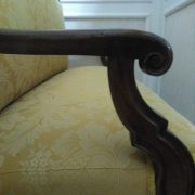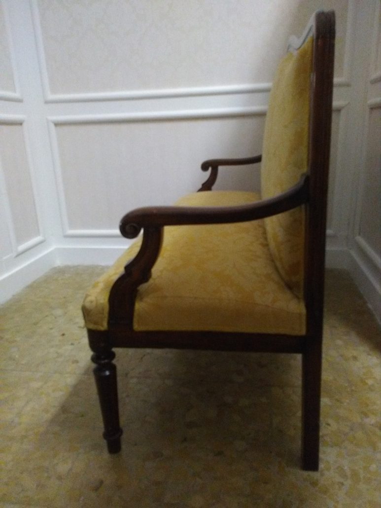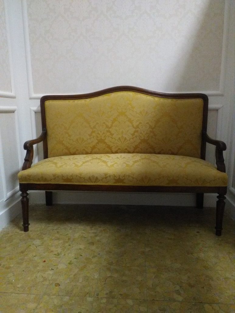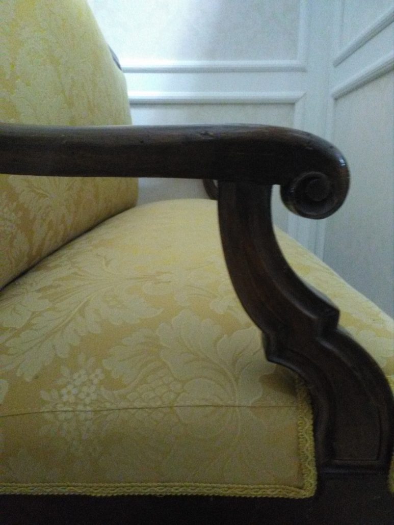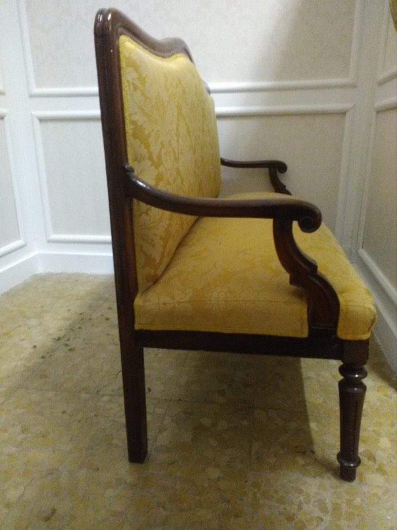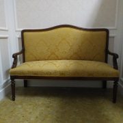 Divanetto in noce massello. Arredo costituito da un sedile imbottito, retto da quattro gambe, le anteriori tornite rastremate e scanalate, le posteriori leggermente arcate verso l’esterno. Un alto schienale , posto a novanta gradi e sagomato nella parte centrale a cui si innestano i due braccioli terminanti a voluta e sostenuti da un elemento mosso e finemente intagliato.