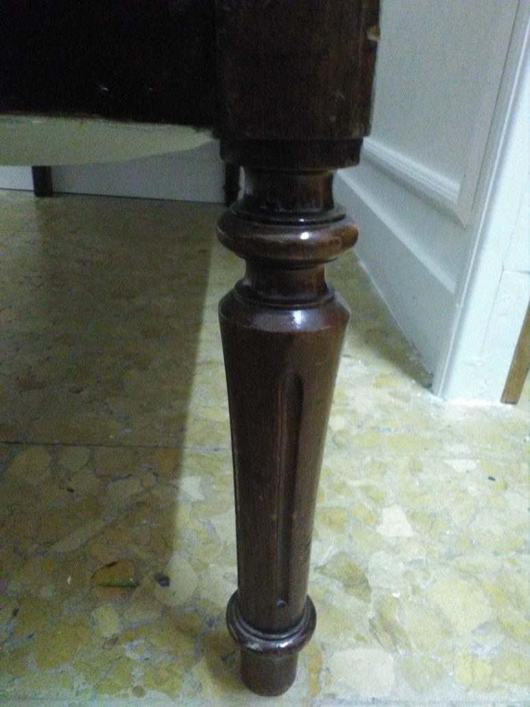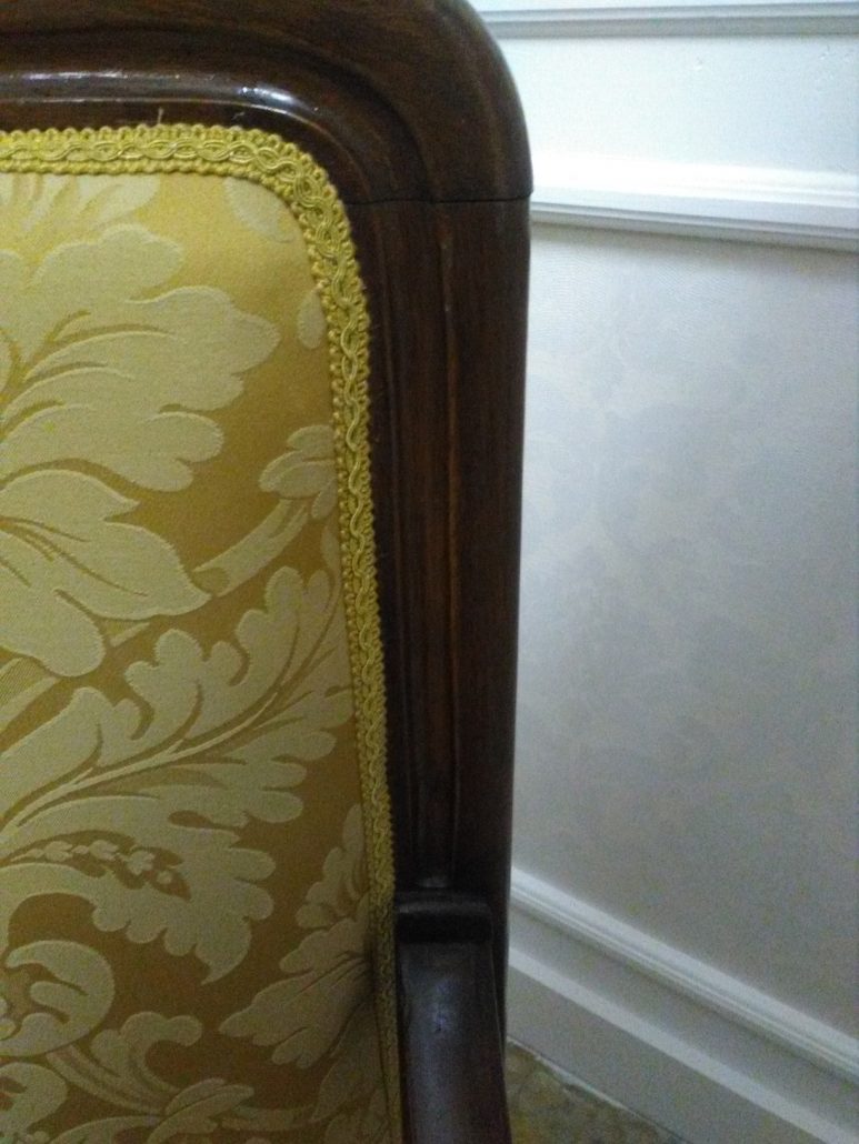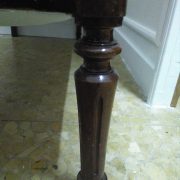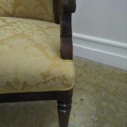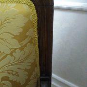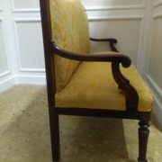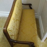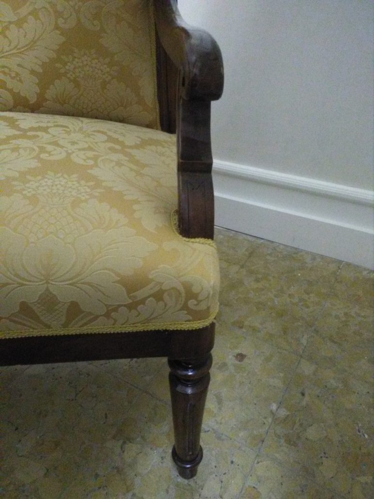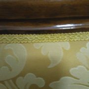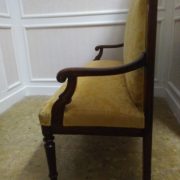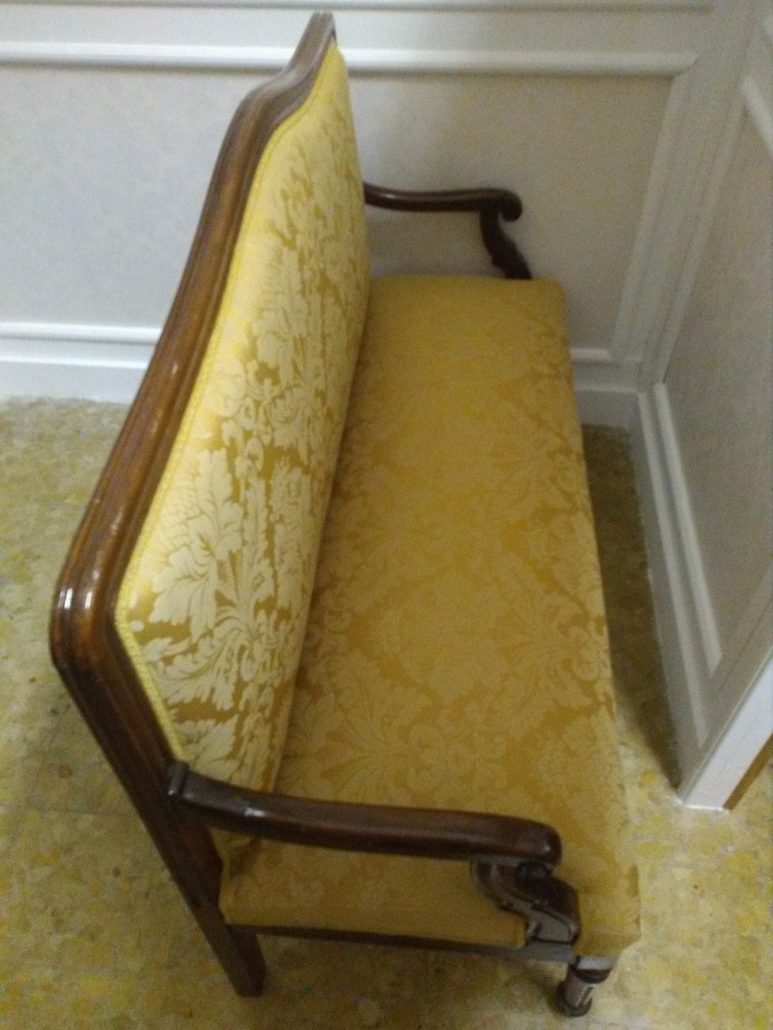 Divanetto in noce massello. Arredo costituito da un sedile imbottito, retto da quattro gambe, le anteriori tornite rastremate e scanalate, le posteriori leggermente arcate verso l’esterno. Un alto schienale , posto a novanta gradi e sagomato nella parte centrale a cui si innestano i due braccioli terminanti a voluta e sostenuti da un elemento mosso e finemente intagliato.