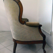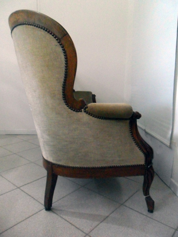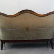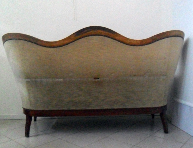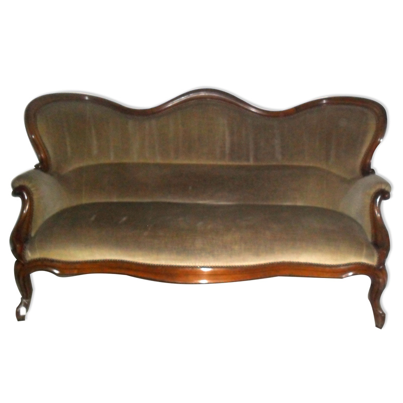 Divano Luigi Filippo in noce massello, forma sinuosa e linea semplice, imbottitura buona, tessuto in velluto verde oliva.