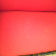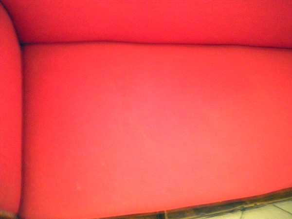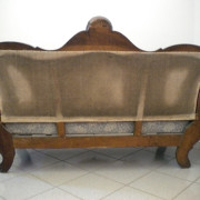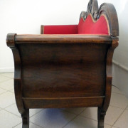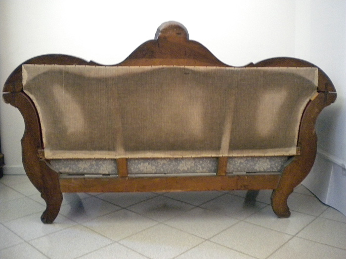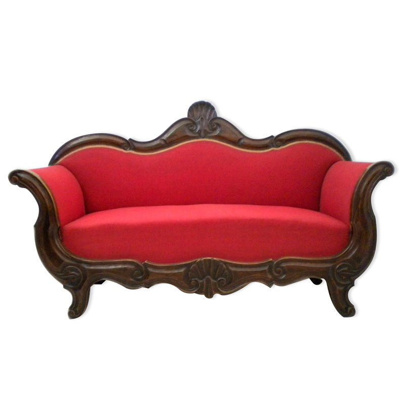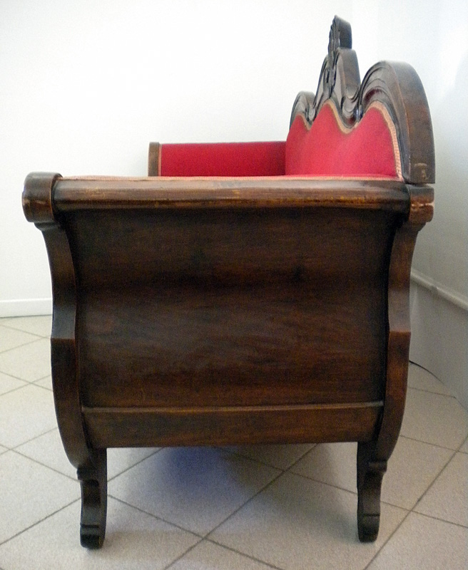 Divano a barca Luigi Filippo in noce massello, linea sinuosa e decori a intaglio di volute e foglie, imbottitura in buono stato, tessuto in cotone grezzo rosso.