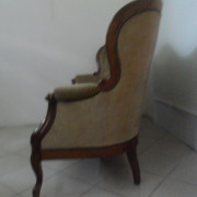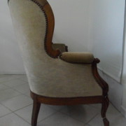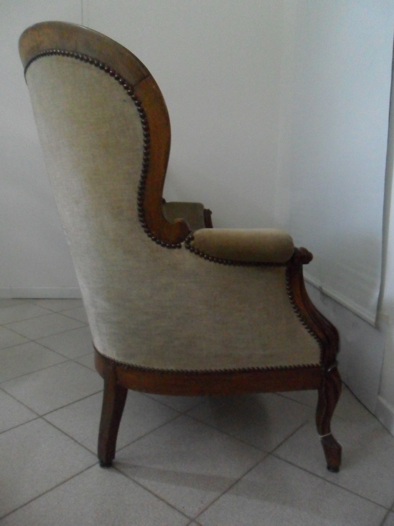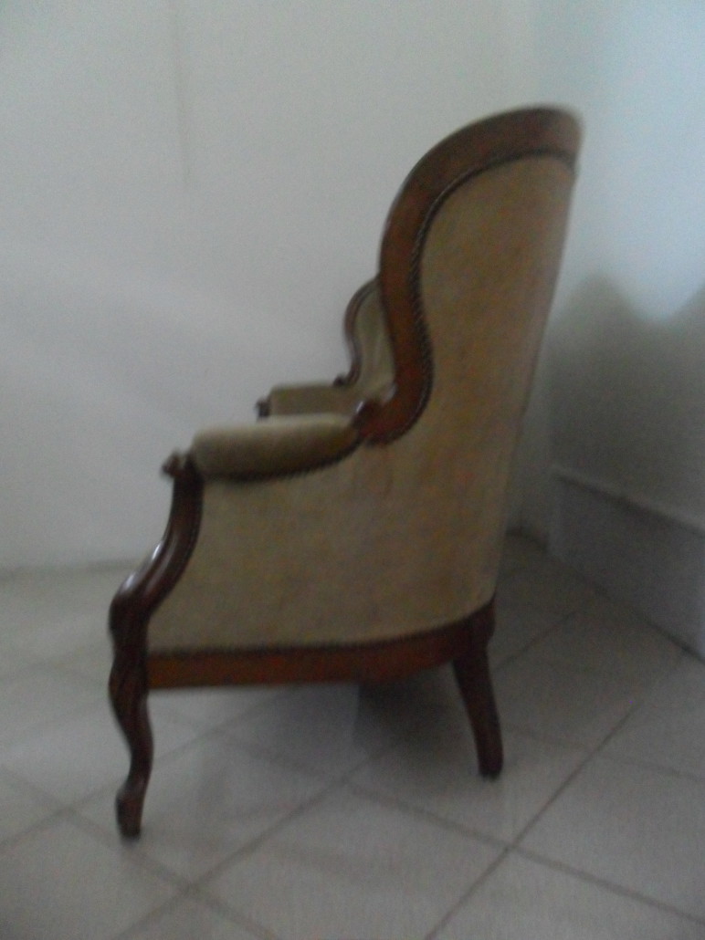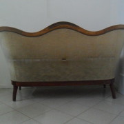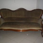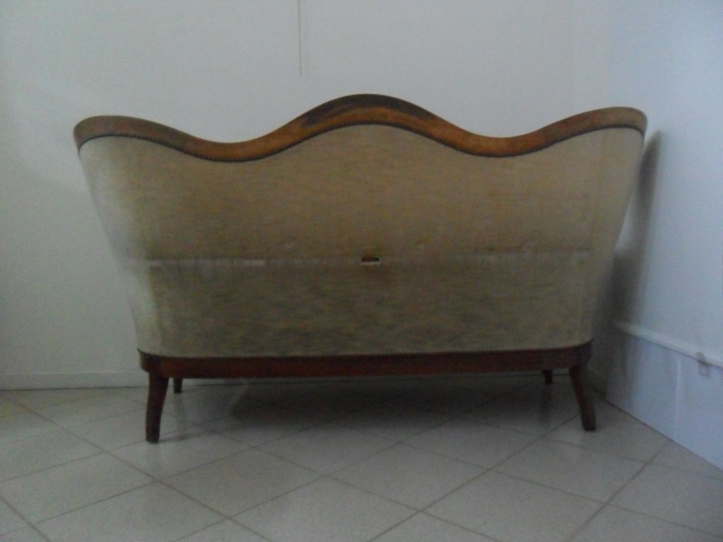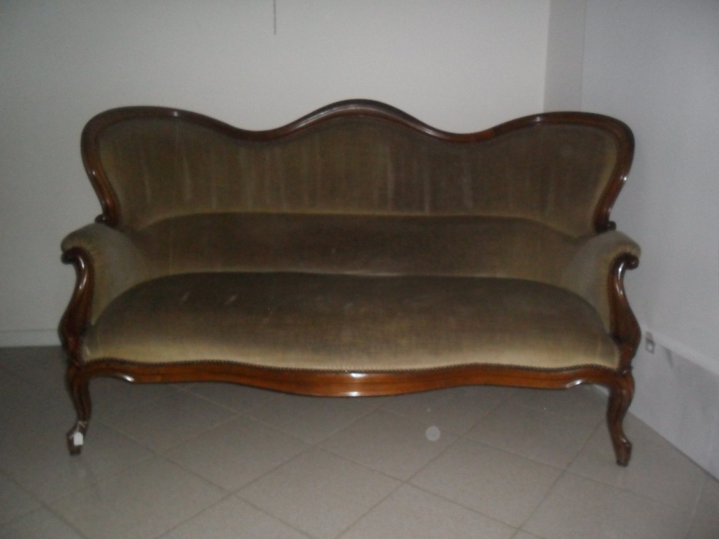Divano Luigi Filippo in noce massello, forma sinuosa e linea semplice, imbottitura buona, foderato in velluto verde oliva.