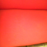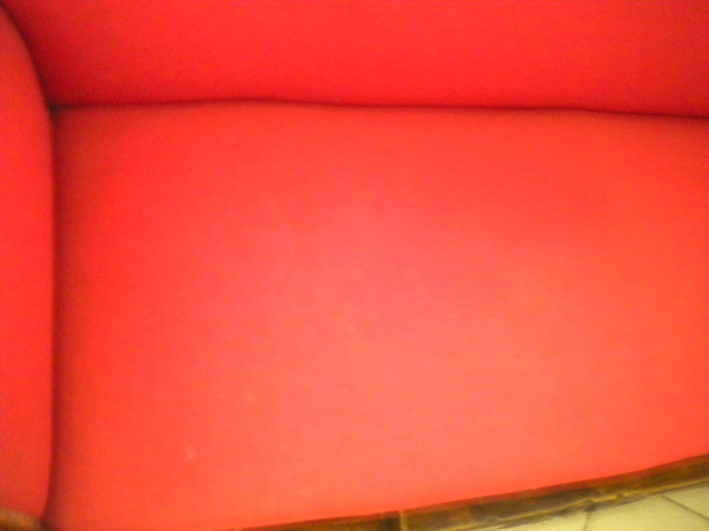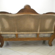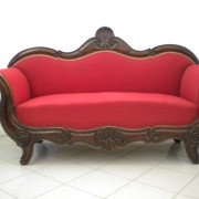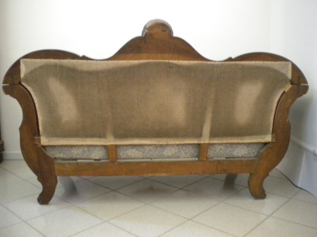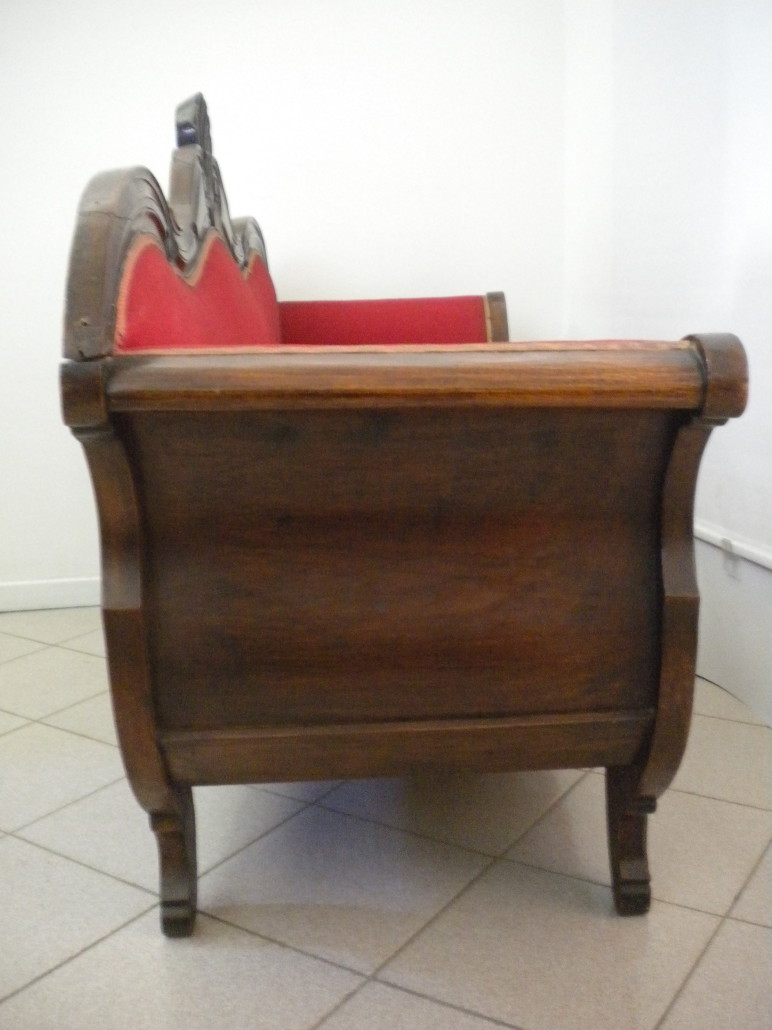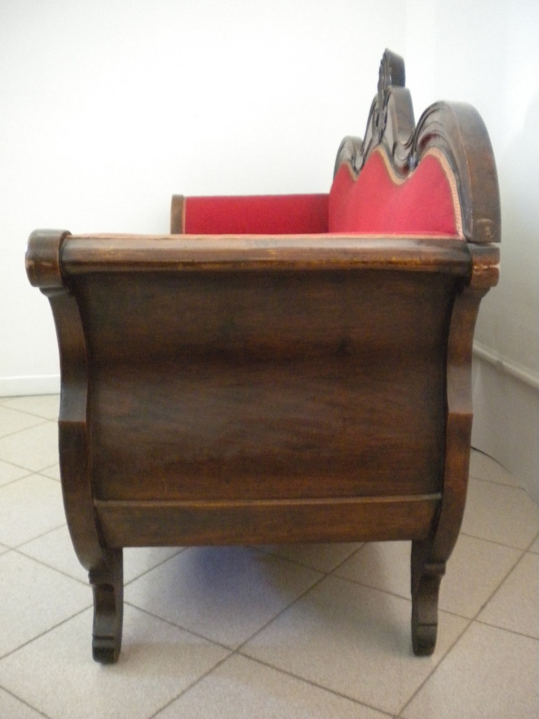 Divano a barca Luigi Filippo in noce massello, linea sinuosa e decori a intaglio di volute e foglie, imbottitura divano in buono stato, tessuto in cotone grezzo rosso.
