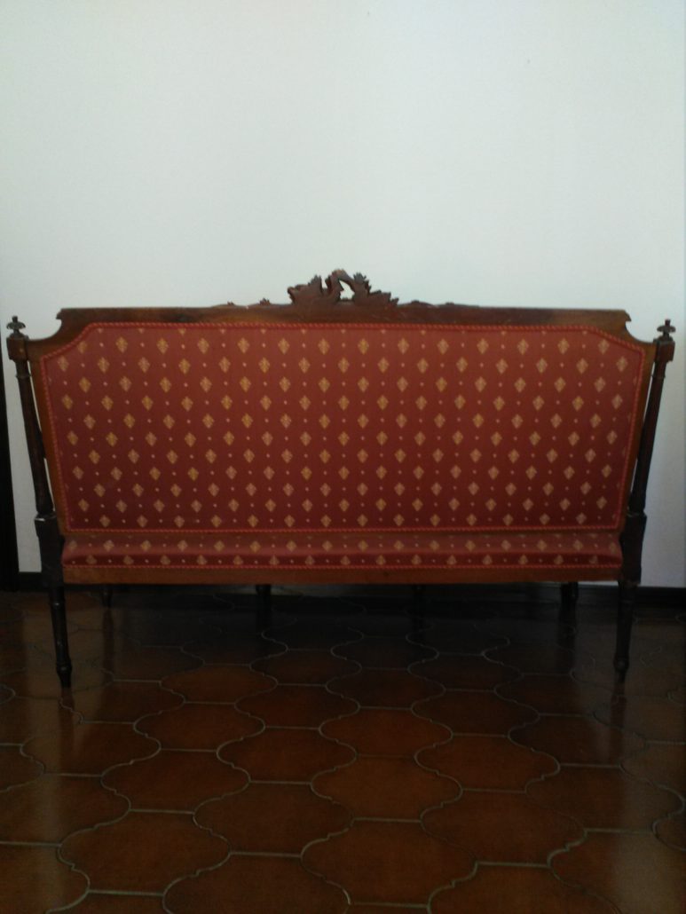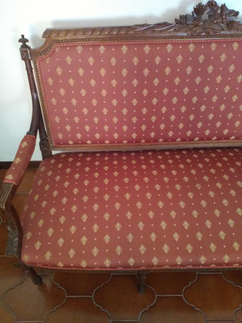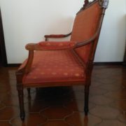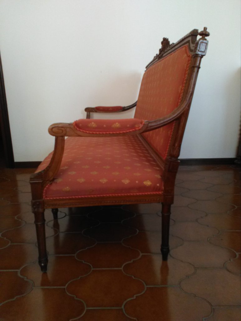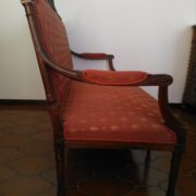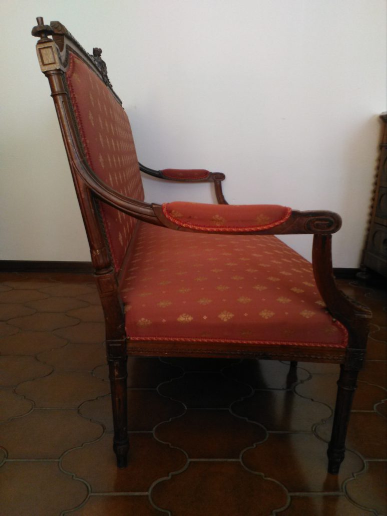 Divano in noce stile Luigi XVI. Schienale e sedile imbottito e rivestito con tessuto rosso con applicazioni oro. Tutta la struttura lignea è decorata con intagli di fiori, festoncini, foglie, rosoni.