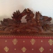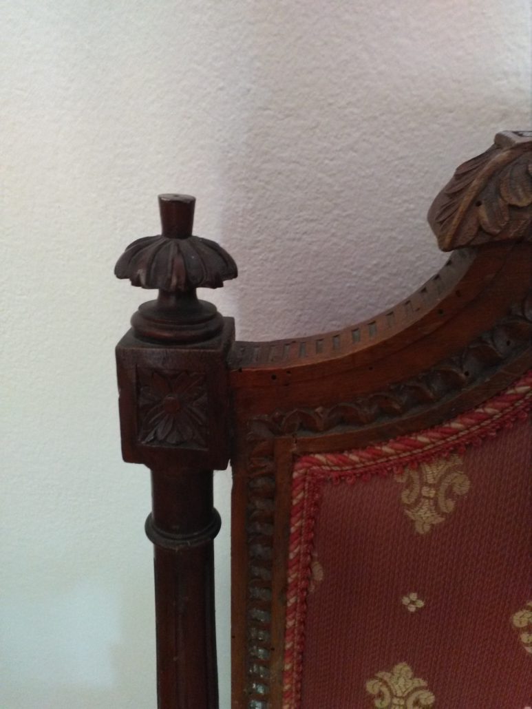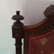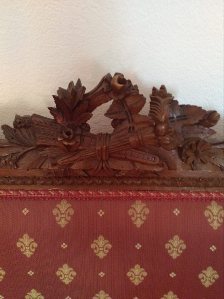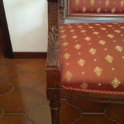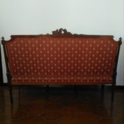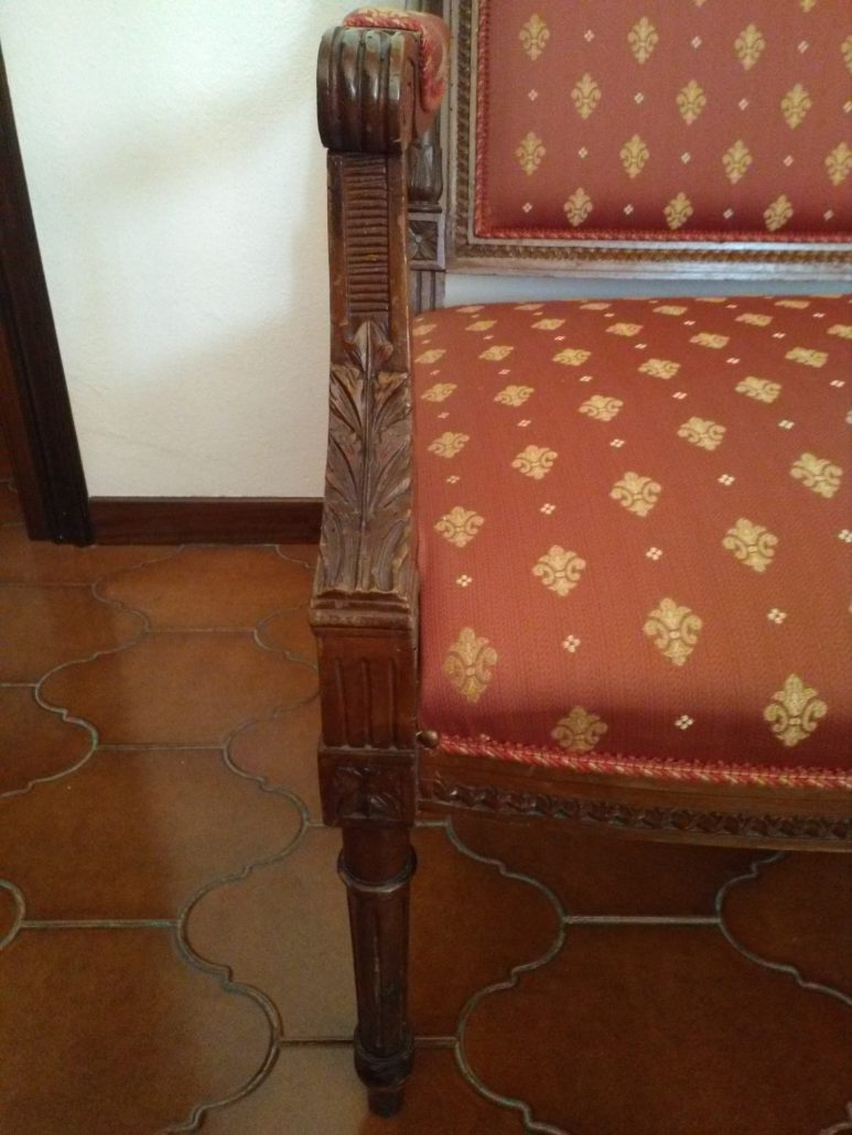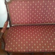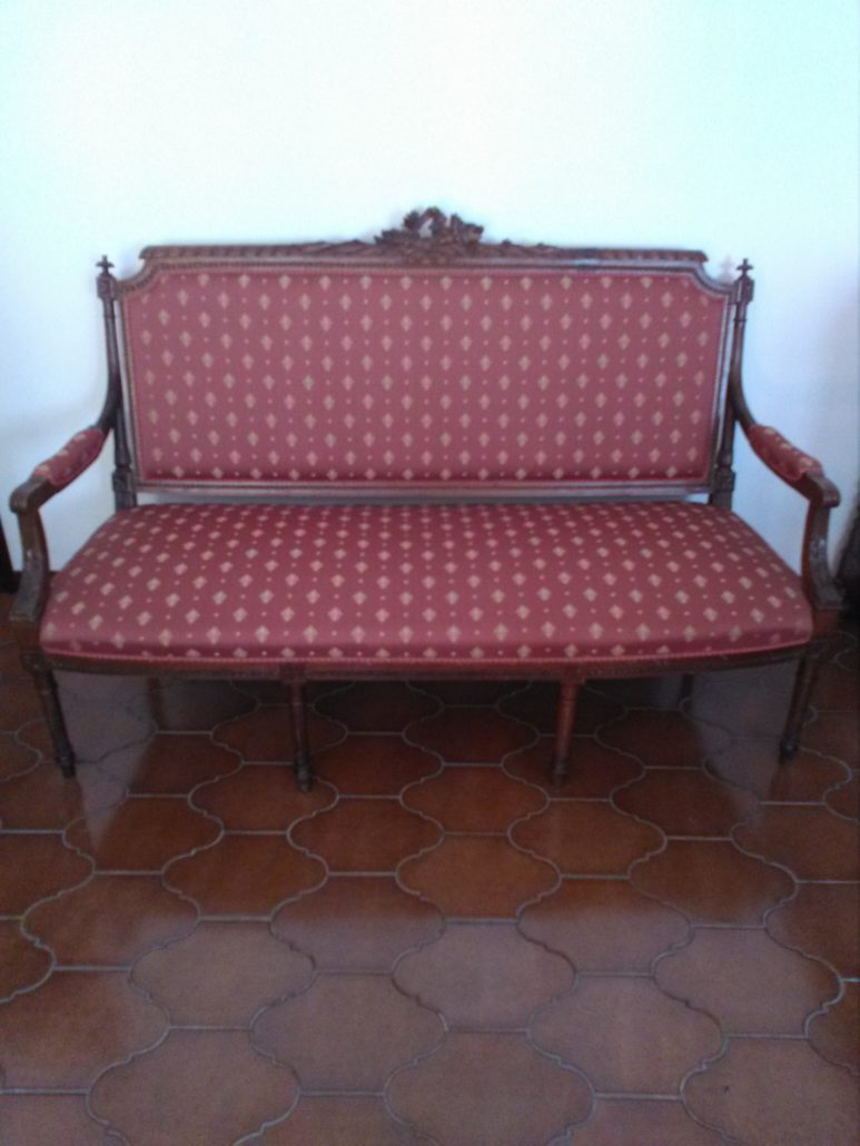 Divano in noce stile Luigi XVI. Schienale e sedile imbottito e rivestito con tessuto rosso con applicazioni oro. Tutta la struttura lignea è decorata con intagli di fiori, festoncini, foglie, rosoni.