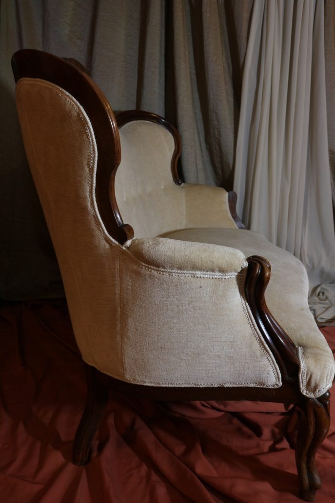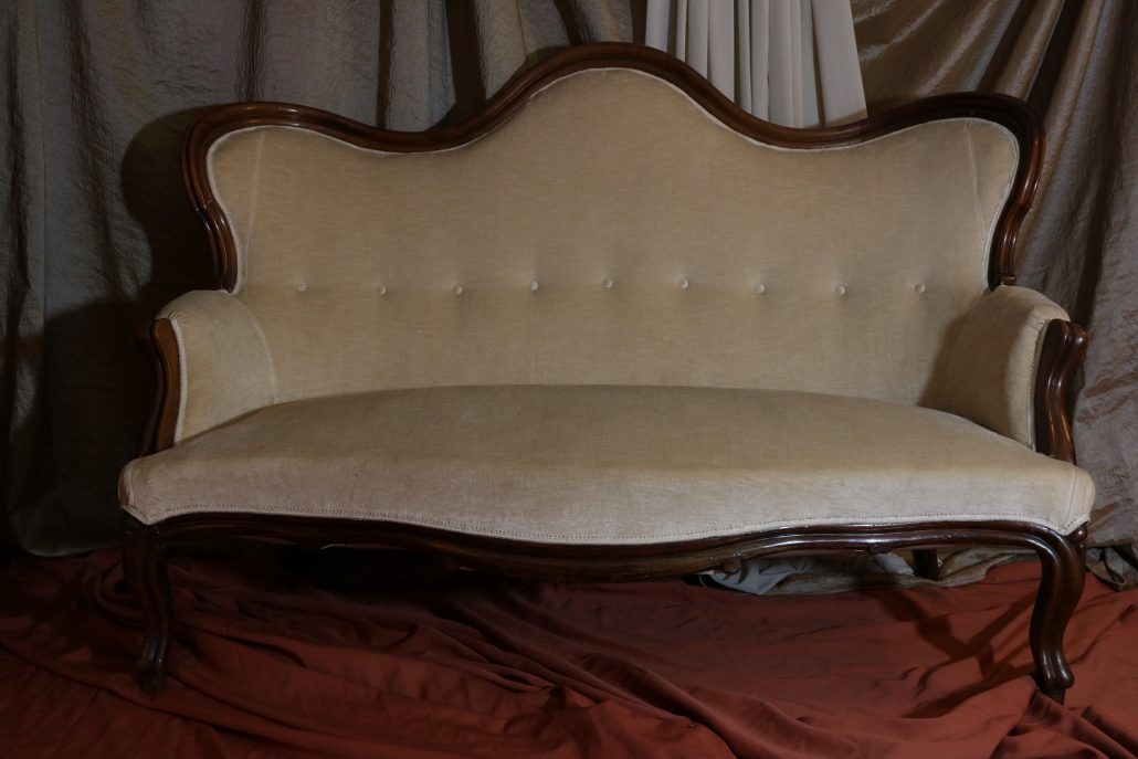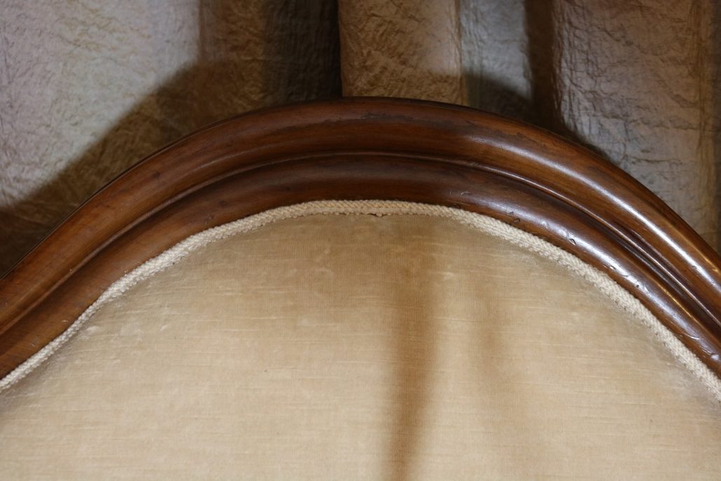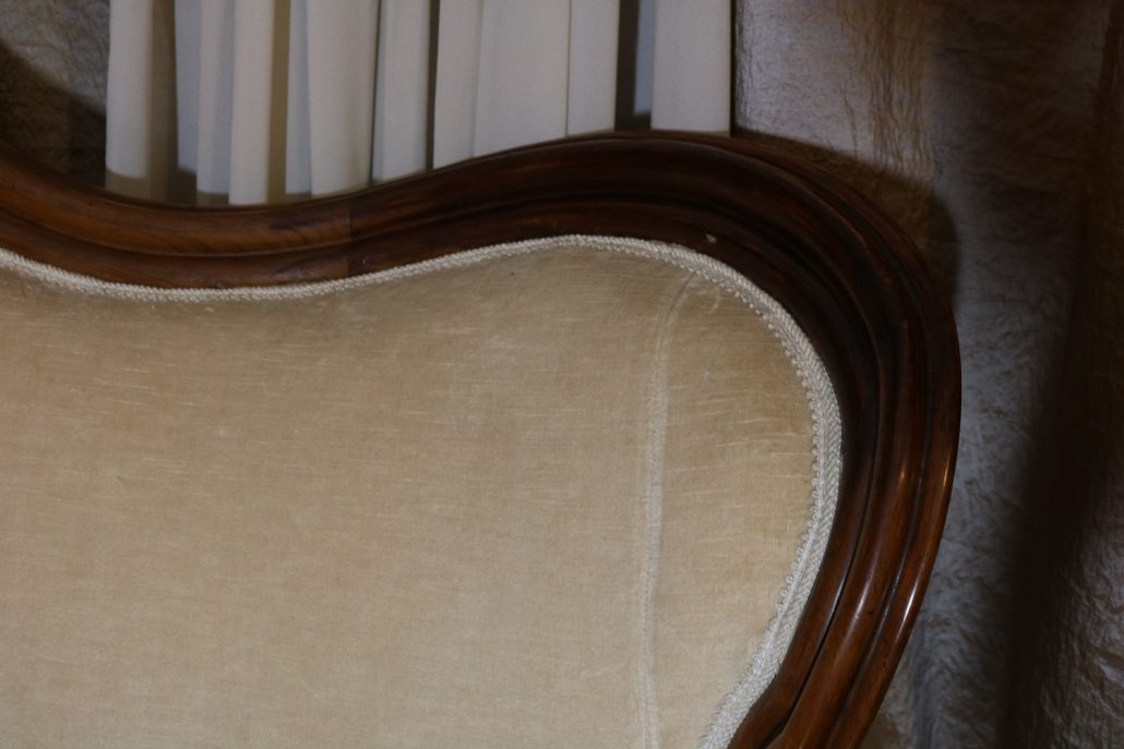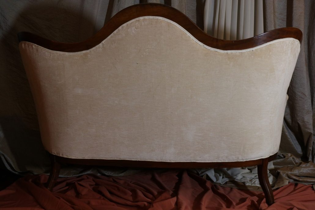 Divano Luigi Filippo in noce. Due gambe anteriore dalla linea mossa e sinuosa si uniscono a formare in un delicato movimento il traverso a sostegno del sedile. Lateralmente restringendosi verso il centro, due traversi si innestano alle gambe posteriori dalla linea semplice e leggermente inclinate all’indietro. Dal sedile imbottito si sviluppano due montanti terminanti con un accenno di ricciolo a sostegno del bracciolo completamente imbottito. Lo schienale, vero protagonista di questa composizione, mostra un’elegante mossa denotando tre possibile posti a sedere. La scelta di non arricchire con intagli o ulteriori decorazioni dona a questo arredo un’eleganza essenziale ma di grande gusto. La decorazione è quindi affidata alla bella essenza di noce valorizzata da una linea assai ricercata. E di estrema raffinatezza.