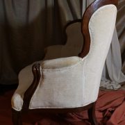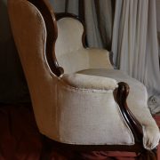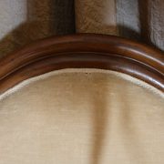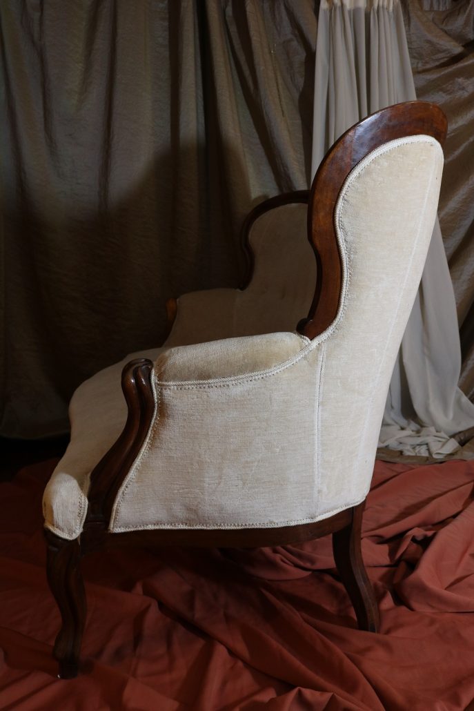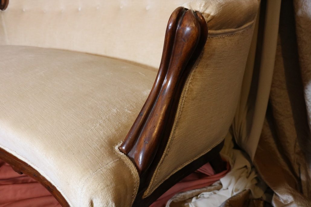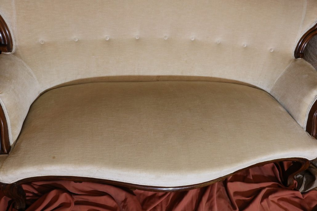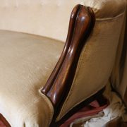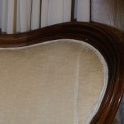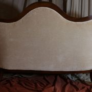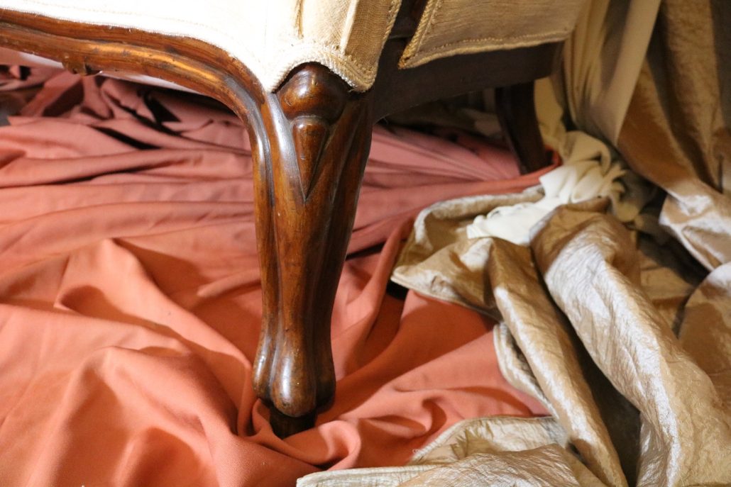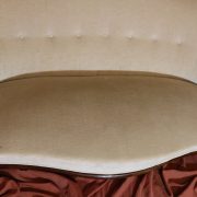 Divano Luigi Filippo in noce. Due gambe anteriore dalla linea mossa e sinuosa si uniscono a formare in un delicato movimento il traverso a sostegno del sedile. Lateralmente restringendosi verso il centro, due traversi si innestano alle gambe posteriori dalla linea semplice e leggermente inclinate all’indietro. Dal sedile imbottito si sviluppano due montanti terminanti con un accenno di ricciolo a sostegno del bracciolo completamente imbottito. Lo schienale, vero protagonista di questa composizione, mostra un’elegante mossa denotando tre possibile posti a sedere. La scelta di non arricchire con intagli o ulteriori decorazioni dona a questo arredo un’eleganza essenziale ma di grande gusto. La decorazione è quindi affidata alla bella essenza di noce valorizzata da una linea assai ricercata. E di estrema raffinatezza.
