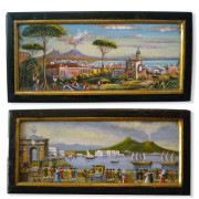 Coppia di gouache napoletane ritraenti il Vesuvio e la costa, olio su tavoletta, cornice coeva in legno laccato nero.