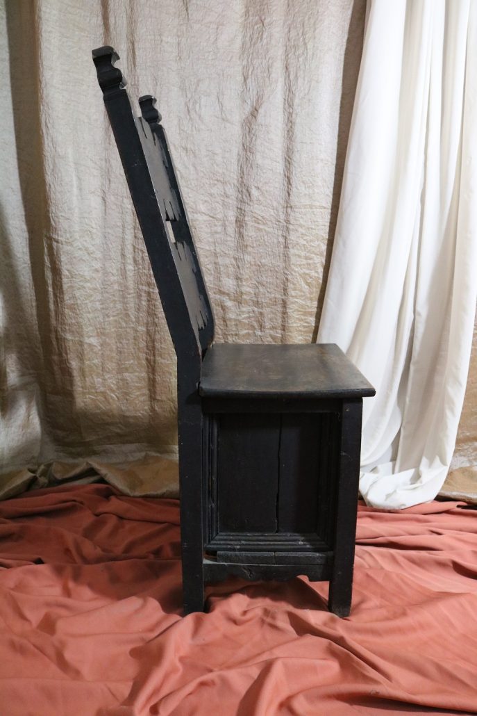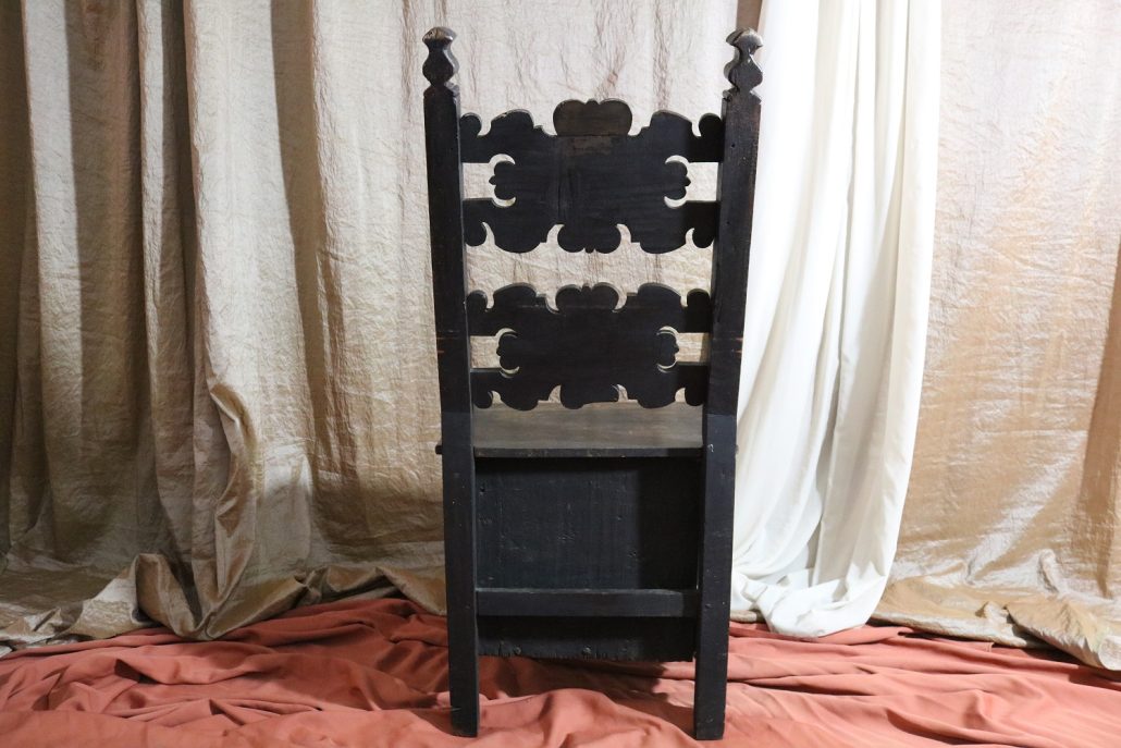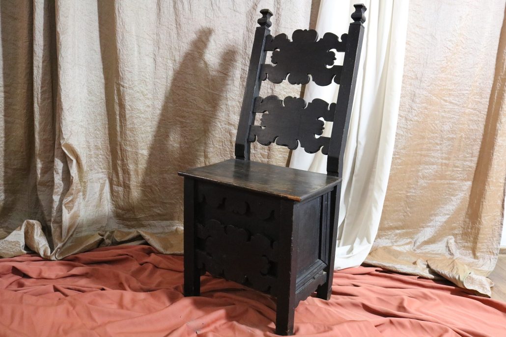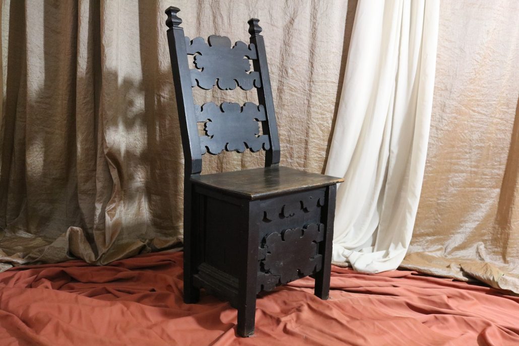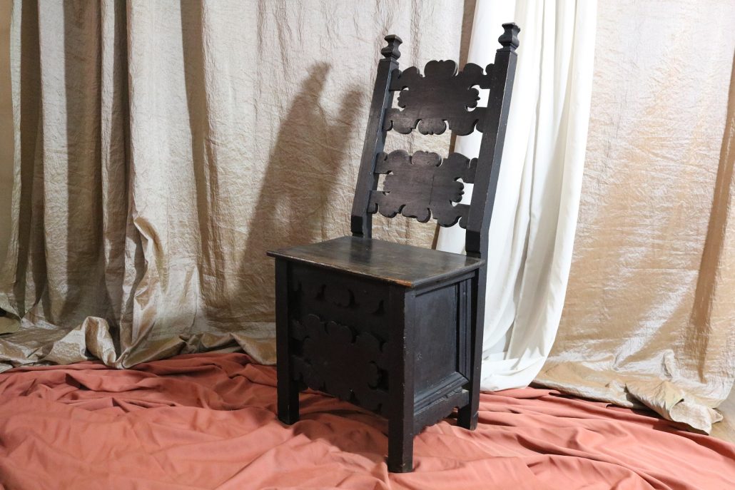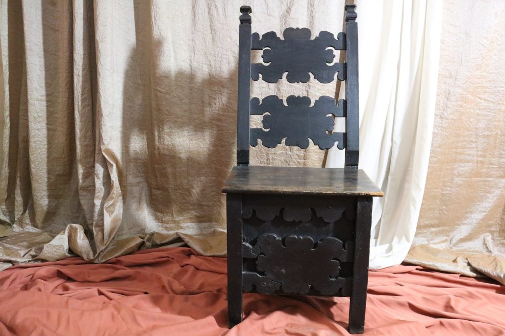 Grande sedia in noce, primi XVIII Secolo. Dalla forma squadrata ed austera, questa sedia si caratterizza per una elaborata lavorazione dei traversi orizzontali che la compongono. Un complesso disegno, eseguito sulla sagoma impreziosisce la struttura. Quattro gambe di semplice foggia sostengono il sedile, che funge da coperchio ad un vano ottenuto mediante la chiusura con dei pannelli, in abete rosso ebanizato, della parte inferiore della sedia, creando una “scatola” contenitore. Dal sedile si innalza lo schienale, leggermente inclinato all’indietro e terminante con pennacchi intagliati a vasetto. I due montanti sono collegati da traversi che riprendono il disegno di quelli inferiori. Lateralmente la sedia mostra una soluzione decorativa molto più semplificata, costituita da delle cornici modanate poste lungo il profilo. Questo arredo, seppur austero e rigido, viene notevolmente impreziosito dalle belle lavorazioni nelle parti frontali, risultando alquanto piacevole e particolare.