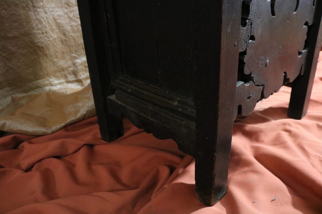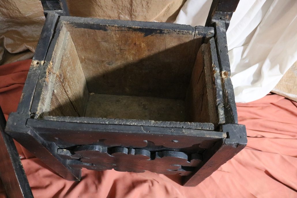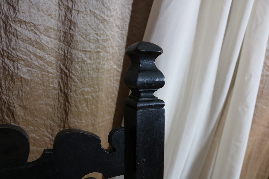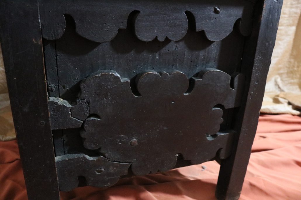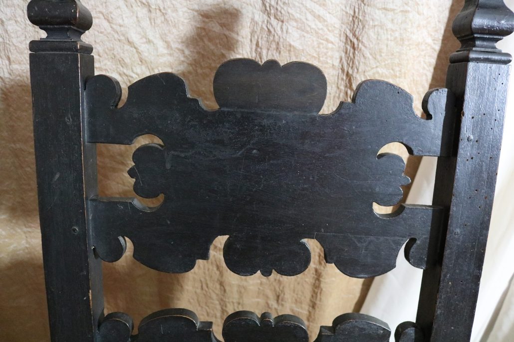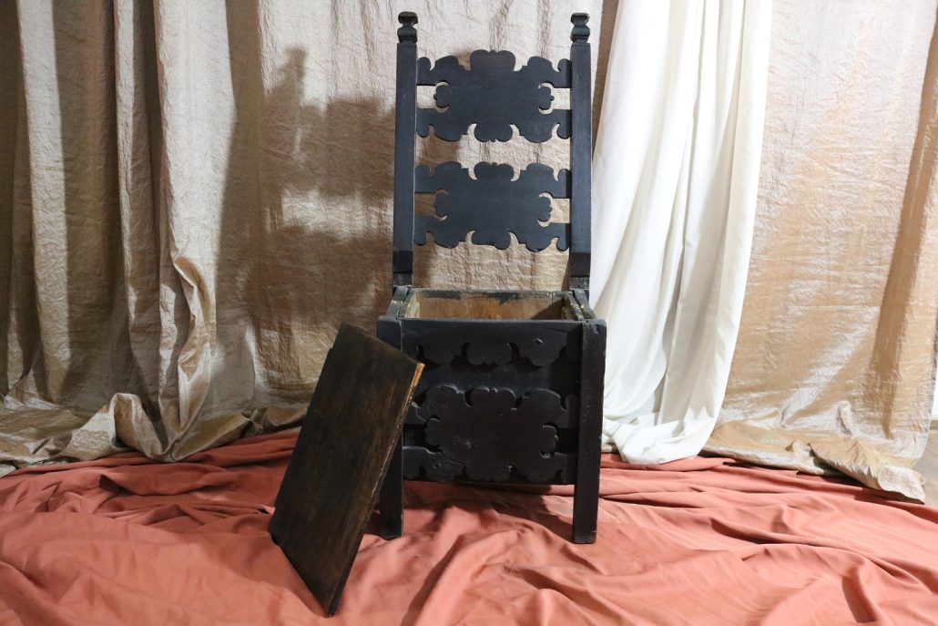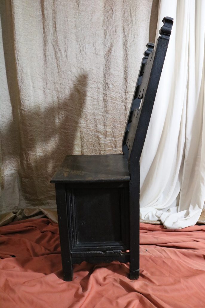 Grande sedia in noce, primi XVIII Secolo. Dalla forma squadrata ed austera, questa sedia si caratterizza per una elaborata lavorazione dei traversi orizzontali che la compongono. Un complesso disegno, eseguito sulla sagoma impreziosisce la struttura. Quattro gambe di semplice foggia sostengono il sedile, che funge da coperchio ad un vano ottenuto mediante la chiusura con dei pannelli, in abete rosso ebanizato, della parte inferiore della sedia, creando una “scatola” contenitore. Dal sedile si innalza lo schienale, leggermente inclinato all’indietro e terminante con pennacchi intagliati a vasetto. I due montanti sono collegati da traversi che riprendono il disegno di quelli inferiori. Lateralmente la sedia mostra una soluzione decorativa molto più semplificata, costituita da delle cornici modanate poste lungo il profilo. Questo arredo, seppur austero e rigido, viene notevolmente impreziosito dalle belle lavorazioni nelle parti frontali, risultando alquanto piacevole e particolare.