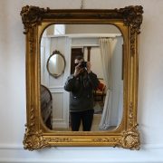Specchiera dorata di gusto rocaille. Una notevole cornice, di considerata sezione, caratterizza questa specchiera. La decorazione data da motivi vegetali e floreali, concentrati sugli angoli stondati e aggettanti, arricchite da conchiglie, volute e racemi, in rilievo, rende la cornice alquanto decorativa e di grande effetto. Nella bordura all’interno, la cornice, presenta una decorazione minuziosa che corre lungo tutto il perimetro. Negli angoli, la lastra è coperta da un’ulteriore parte dorata per ottenere che non appaia nessuna forma rigida e spigolosa ma che la linea mossa e morbida rimanga incontrastata in ogni particolare. La bella doratura ne esalta la forma e la lavorazione impreziosendola ulteriormente.