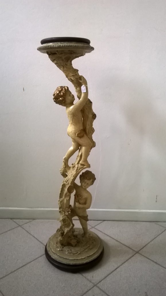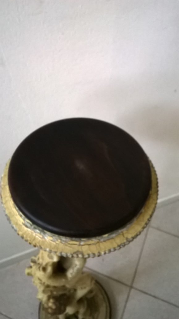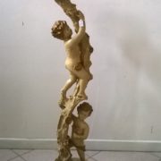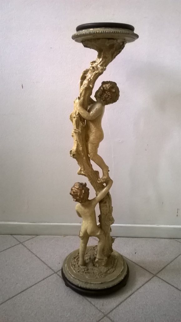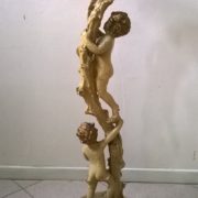 Gueridon laccato in policromia, due putti giocano ad arrampicarsi su di un tronco di albero, piedi e piano in legno.