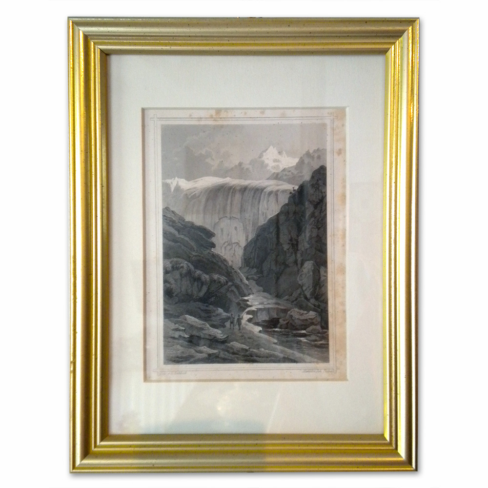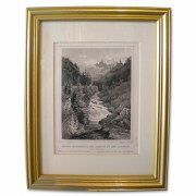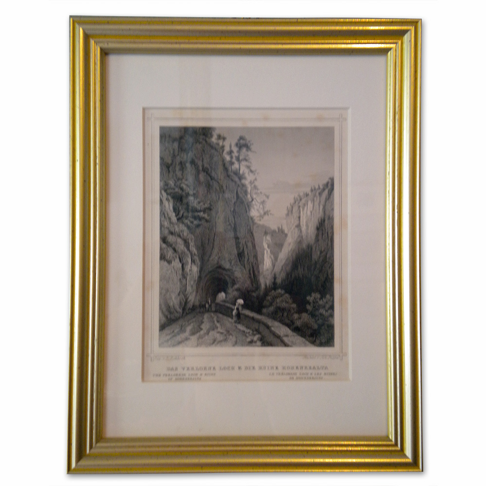 Tre Incisioni “La via Mala” ( Passo che collega Val Chiavenna con la Svizzera), cornice nuova in legno dorato.