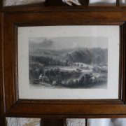 Incisione acquarellata raffigurante un paesaggio con ponte. Presentata in cornice di noce.