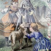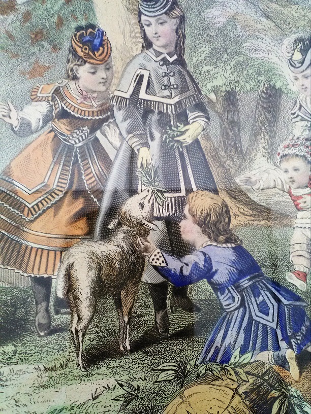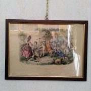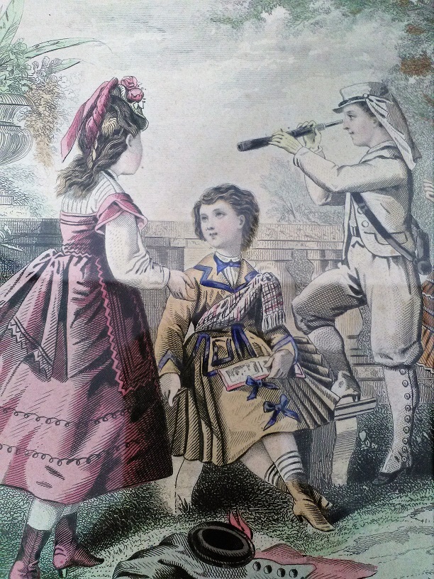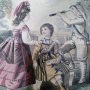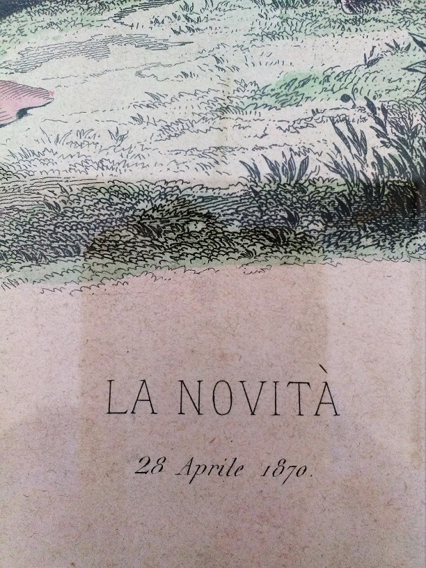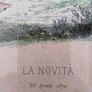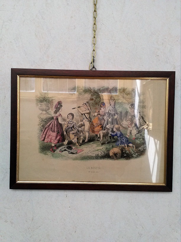Incisione, acquarellata a mano, raffigurante figure in interno. La tavola appartiene alla raccolta di incisioni inserite nel giornale di moda intitolato “La Novità”, ed inoltre portano l’anno, il mese a cui i modelli di abbigliamento sono idonei.