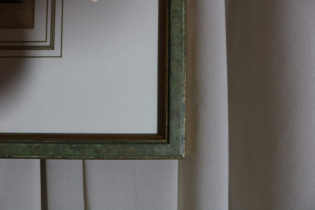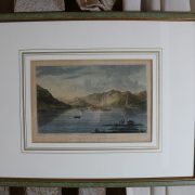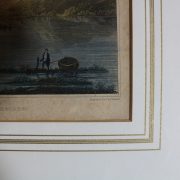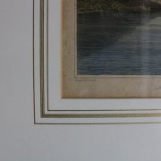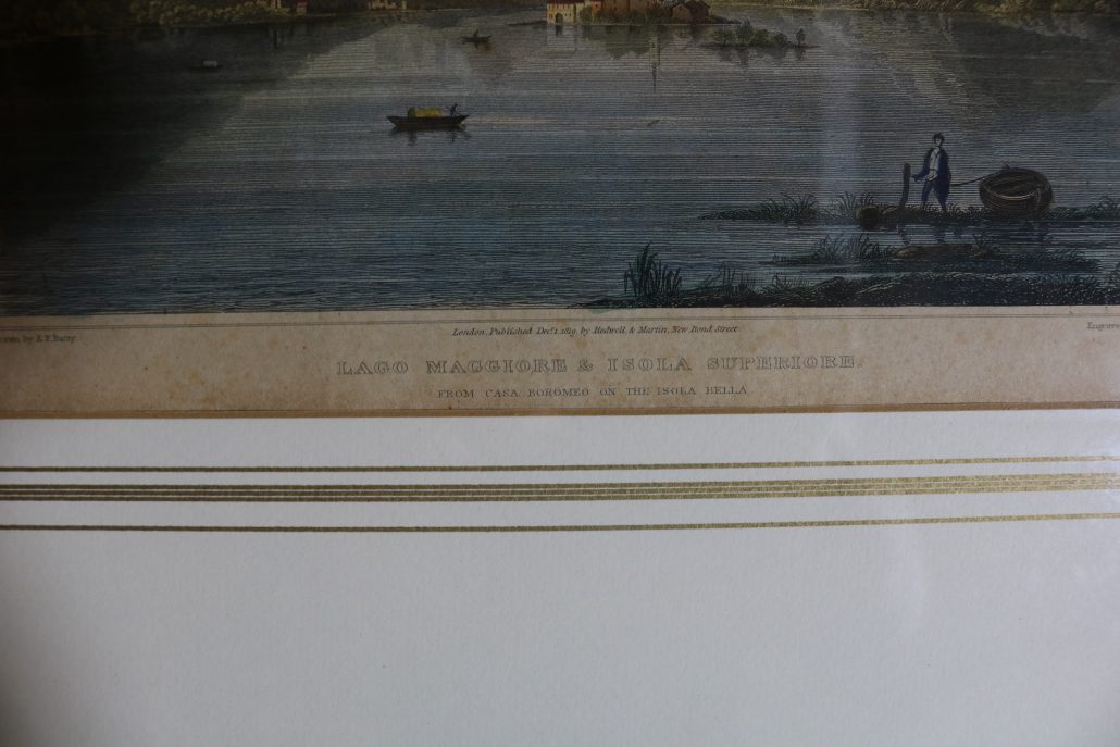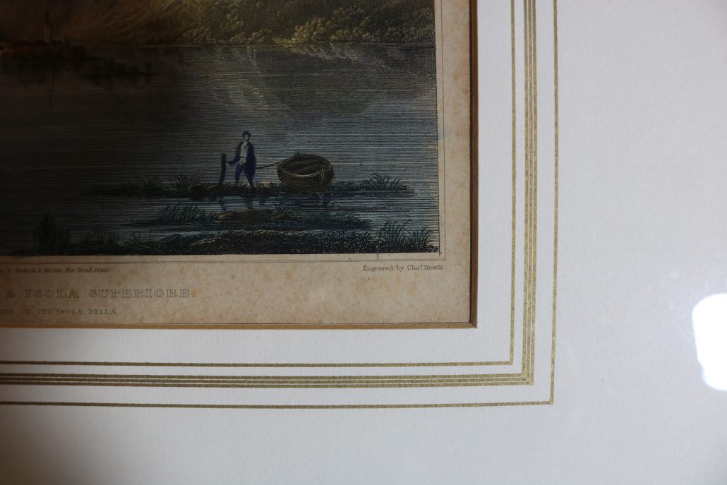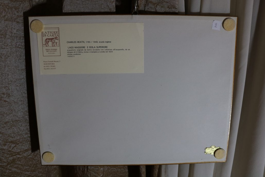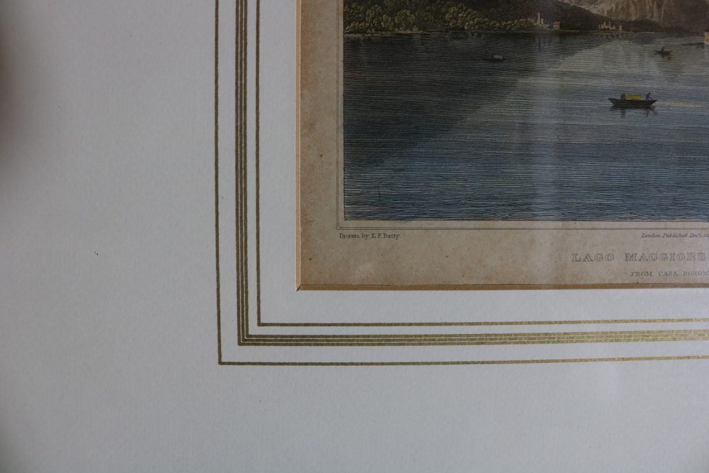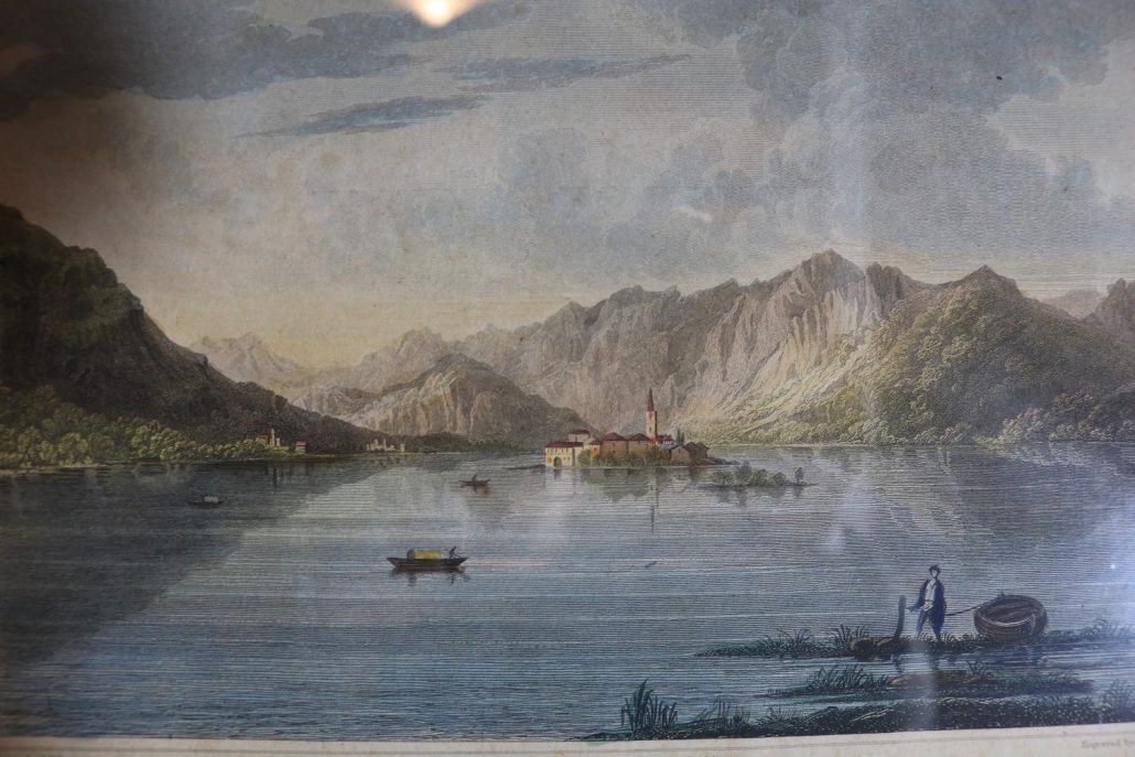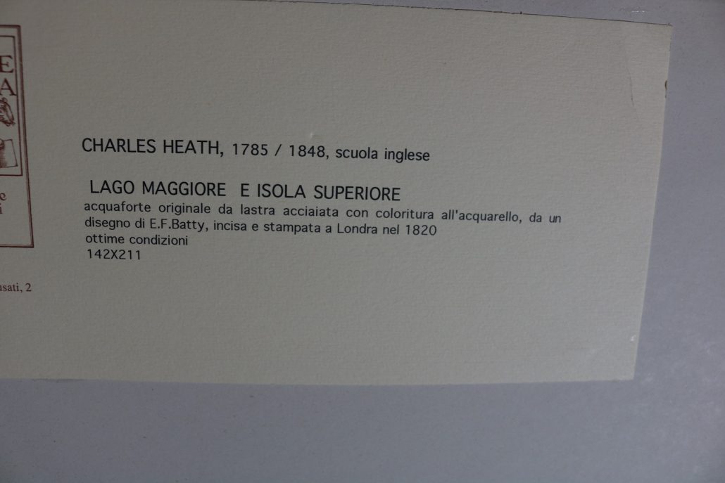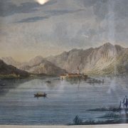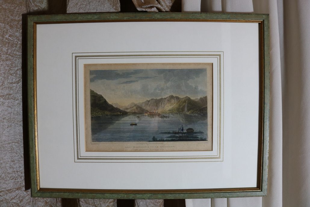 Acquaforte acquarellata raffigurante il Lago maggiore e Isola Superiore. Presentato in cornice laccata verde