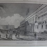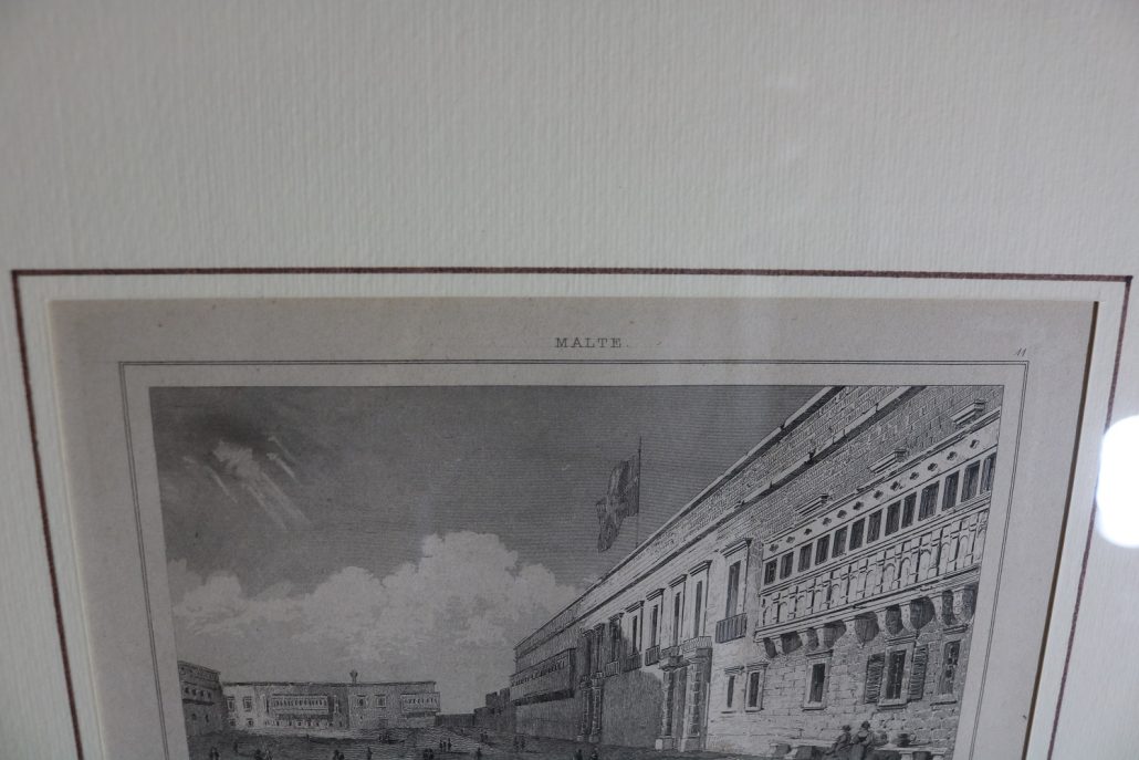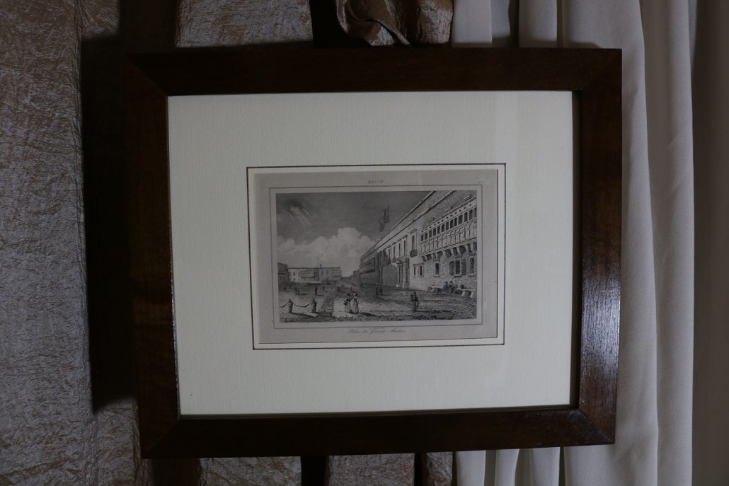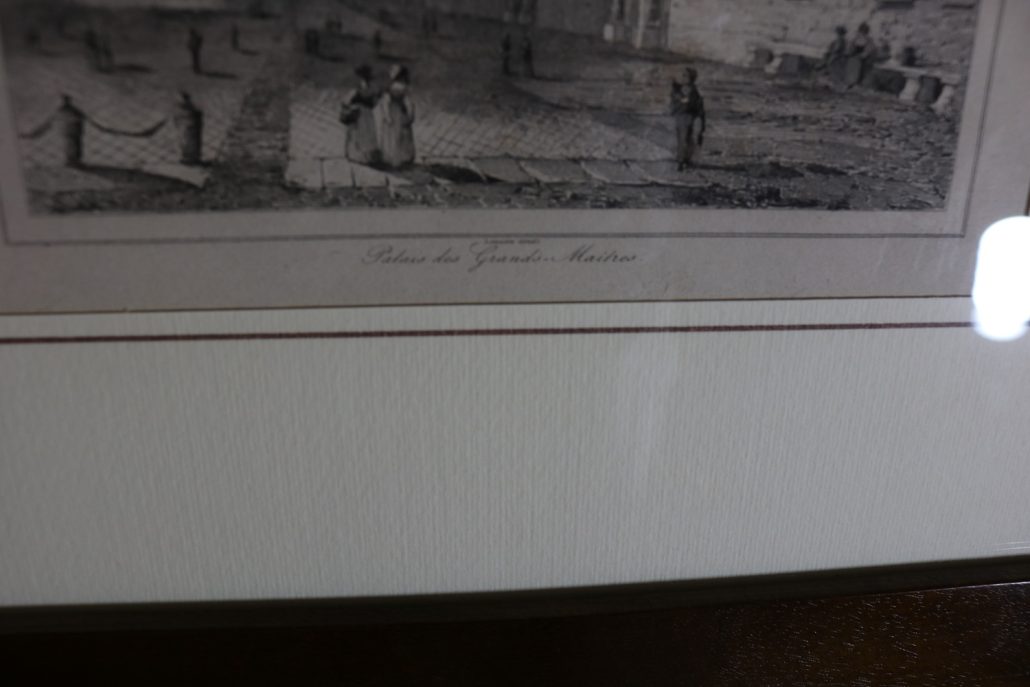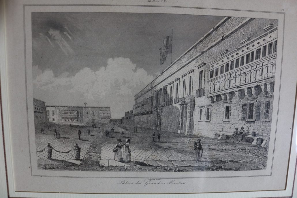 Incisione acquarellata raffigurante il “Palais des grands maitres”. Presentata in cornice di noce.