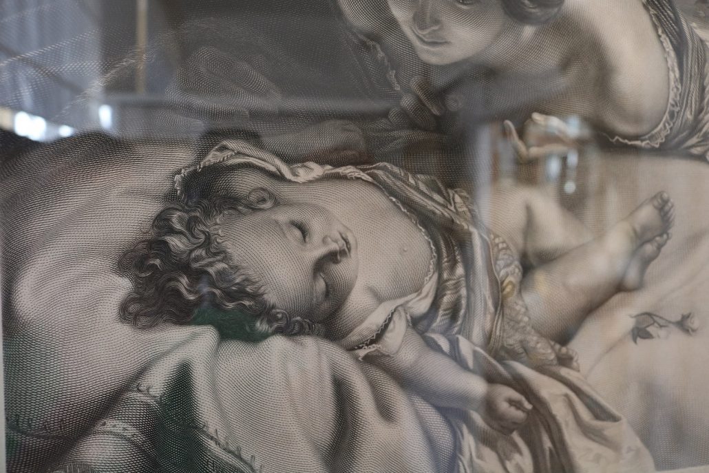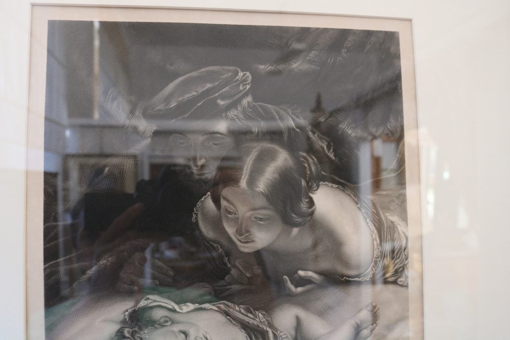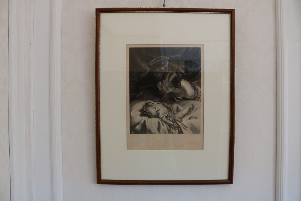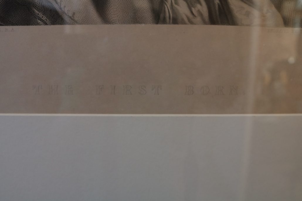 Incisione, “The first born”. Rappresentazione di un interno suddiviso in due differenti piani di prospetto. In primo piano, un bel bimbo, con ricchi riccioli ad incorniciarne il viso, è adagiato in una culla, guarnita da pizzi e merletti. In secondo piano, i giovani genitori guardano con occhi pieni di sentimento il frutto del loro amore. La rappresentazione pone in risalto tutte le caratteristiche della metà del XIX Secolo, la famiglia è posta al centro e viene in tutti i modi promossa. Il primogenito, maschio, era per la società ottocentesca la continuazione del Nome, della dinastia, il fulcro di tutte le aspettative…