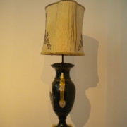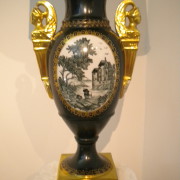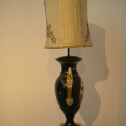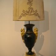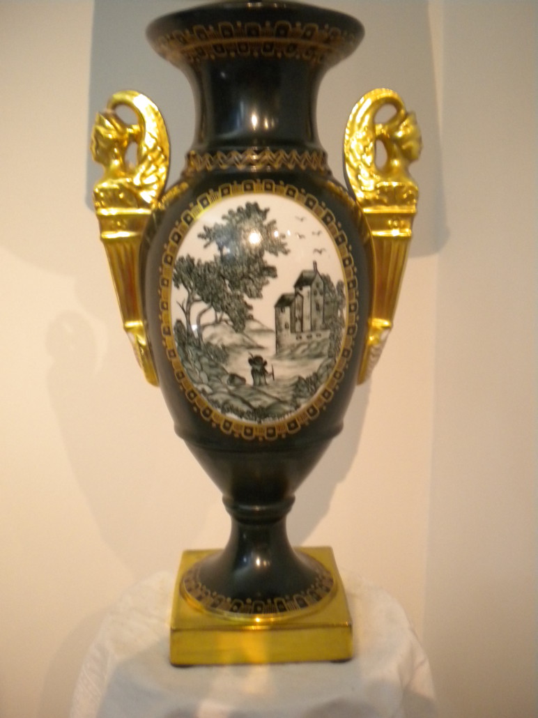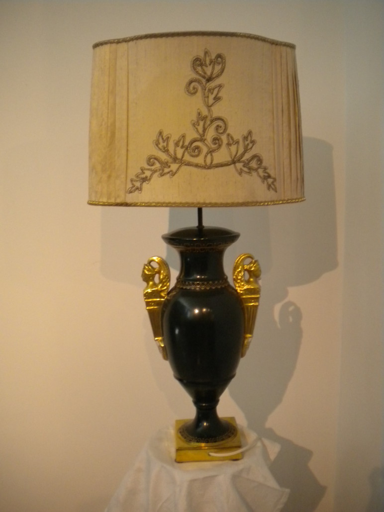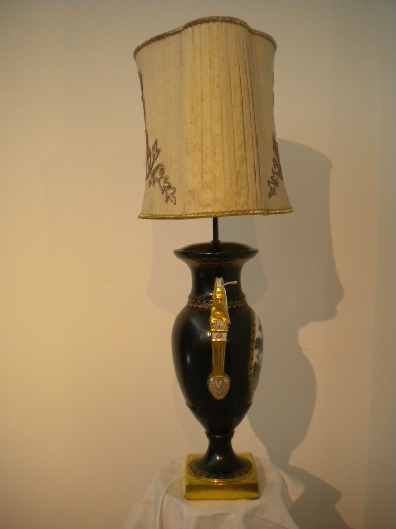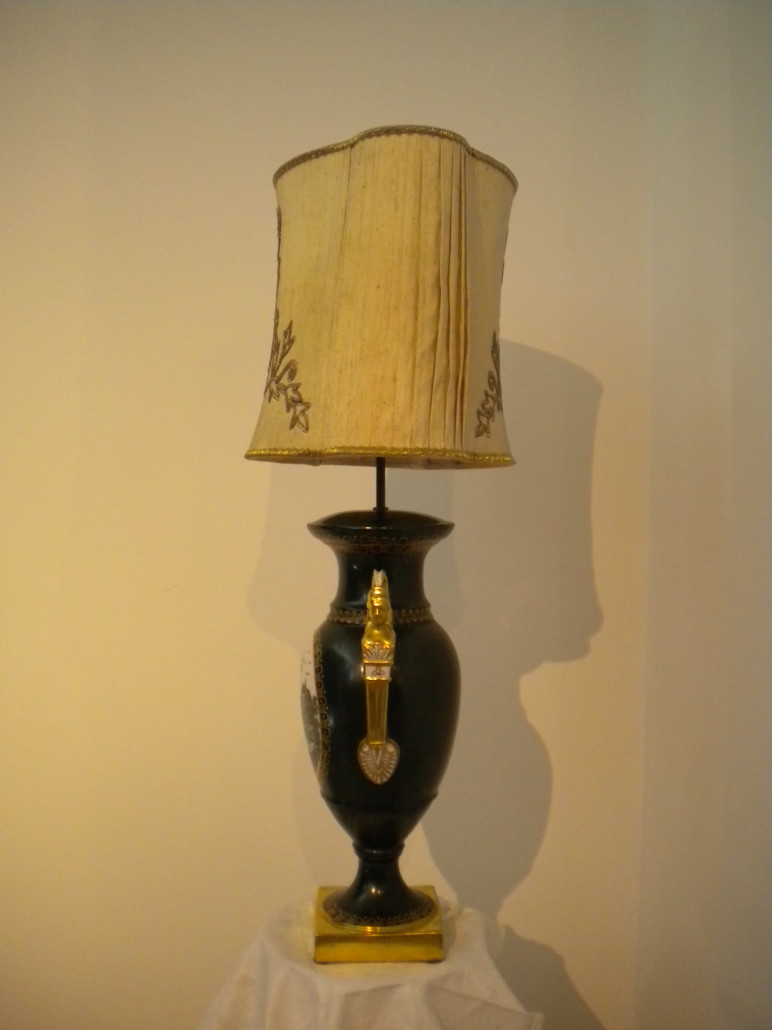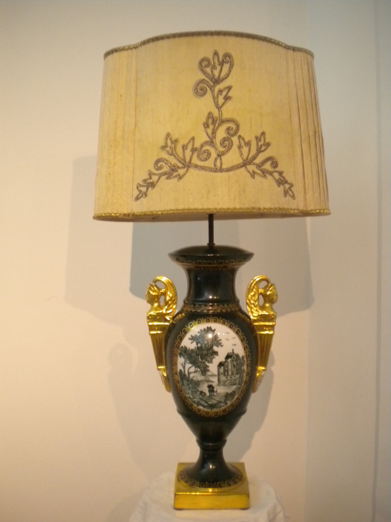 Lampada in ceramica secondo impero. Costituita da un vaso ad urna verde felce con cammeo dipinto con paesaggio. Prese a cariatidi, le parti dorate sono in oro zecchino. Paralume ovale con laterali plissettati e decoro centrale a cordone dorato applicato.
