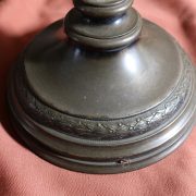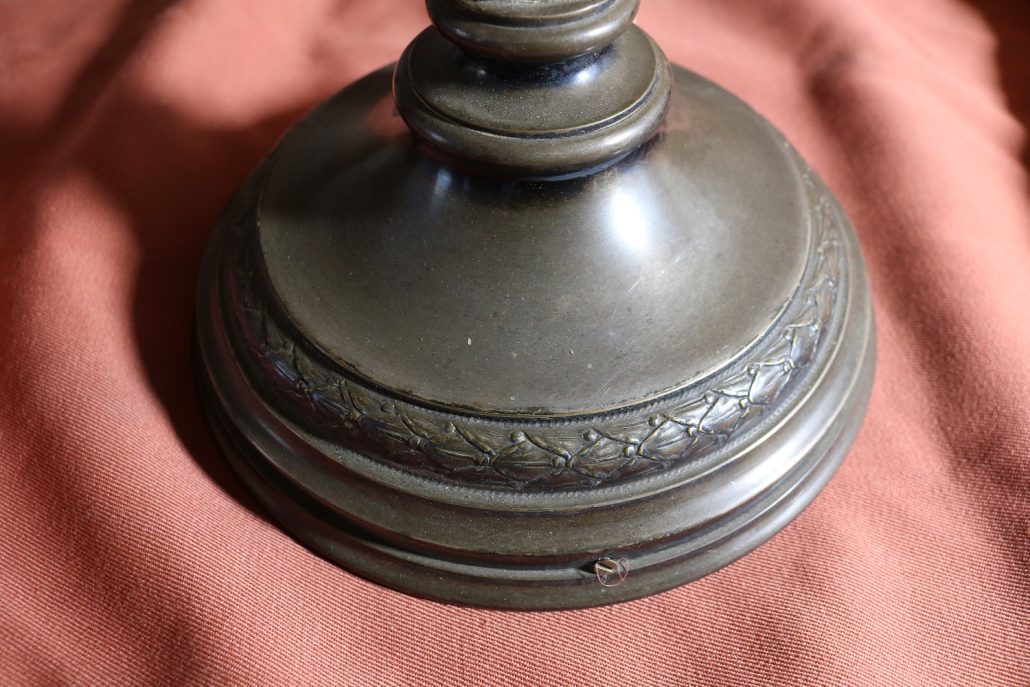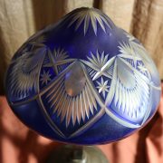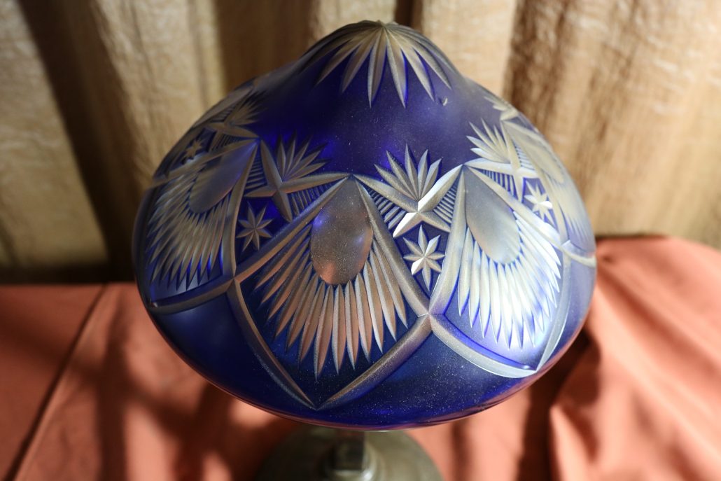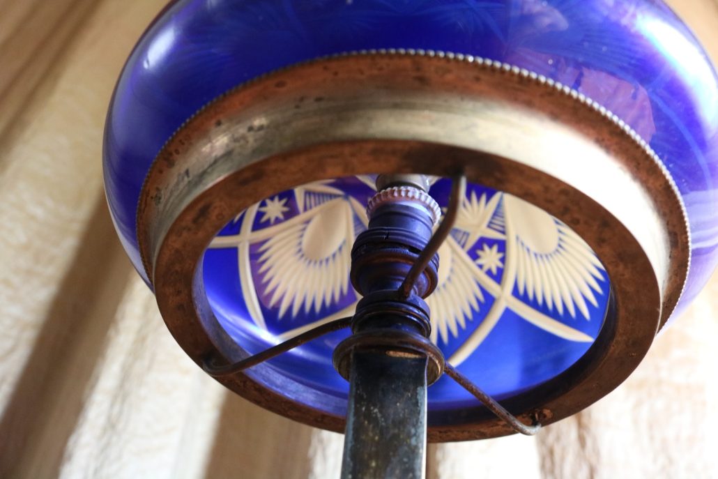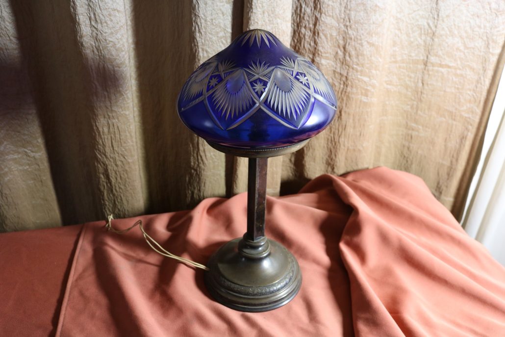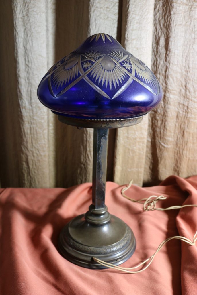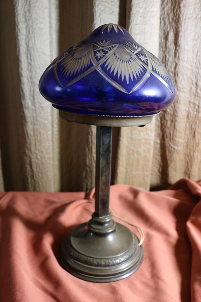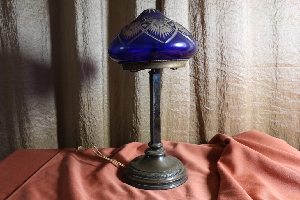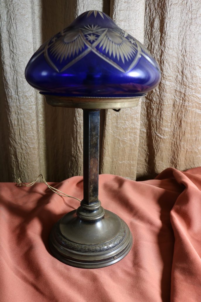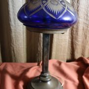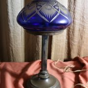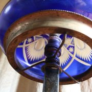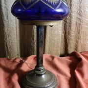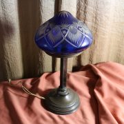 Lampada da tavolo con paralume in vetro blu. Da una base in bronzo di forma circolare, decorata da un motivo a foglie di alloro, si eleva lo stelo, di sezione quadrata a sostegno del porta lampadina. All’innesto di questa si dipartono tre esili sostegni uniti tra loro da un cerchio sempre in metallo reggente un paralume in vetro inciso con un motivo geometrico, in vetro blu cobalto. Di bellissima foggia, questo oggetto, presenta nella sua composizione il passaggio dal lume a petrolio alle lampade elettriche odierne. Infatti la struttura, rievoca ancora la concezione del candelabro unita al classico paralume in vetro delle lampade a olio. Di raffinatissima fattura e squisita eleganza, questo oggetto rivela una grande ricercatezza.