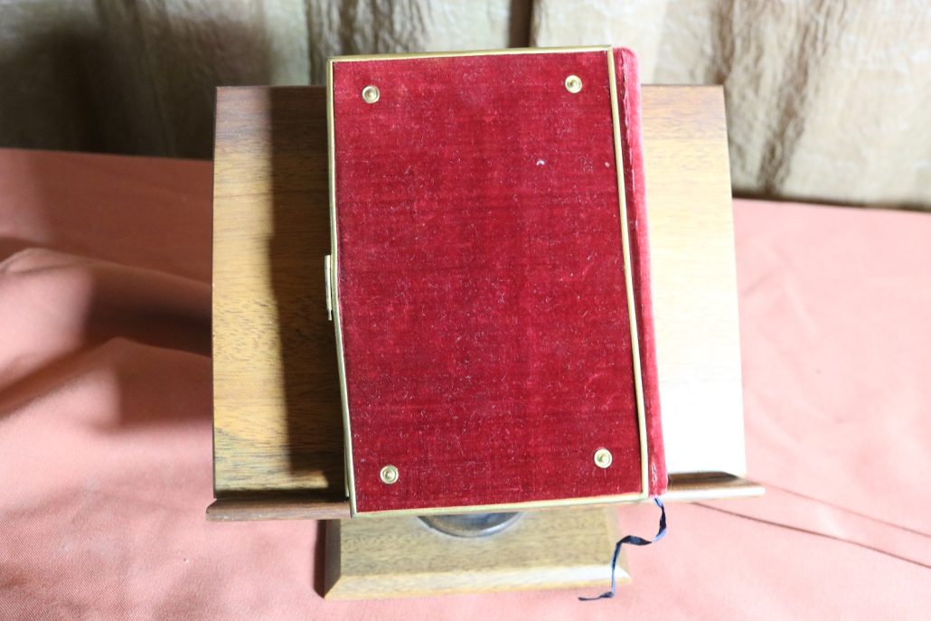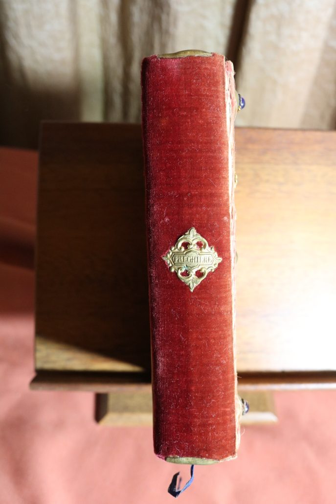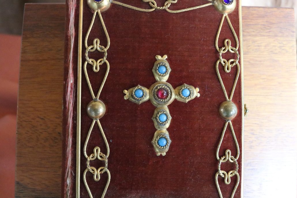 Rivestito in velluto rosso impreziosito da applicazioni dorate e pietre dure con una croce centrale, sempre nella medesima decorazione.
