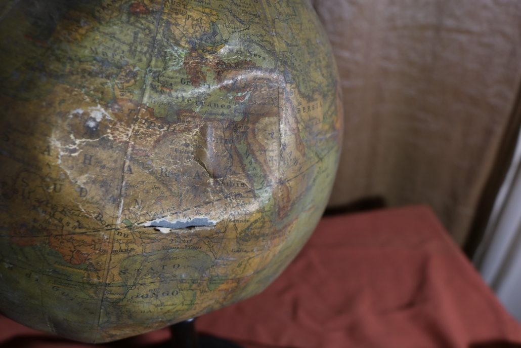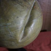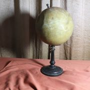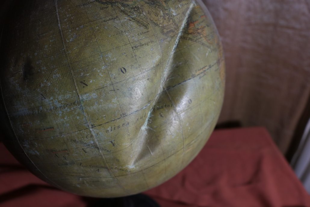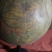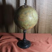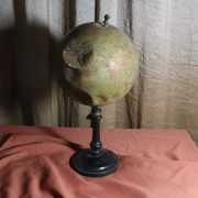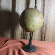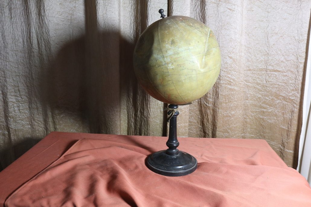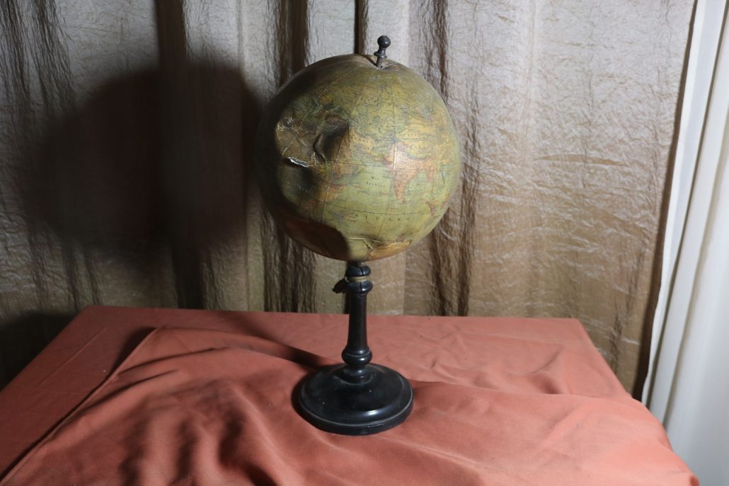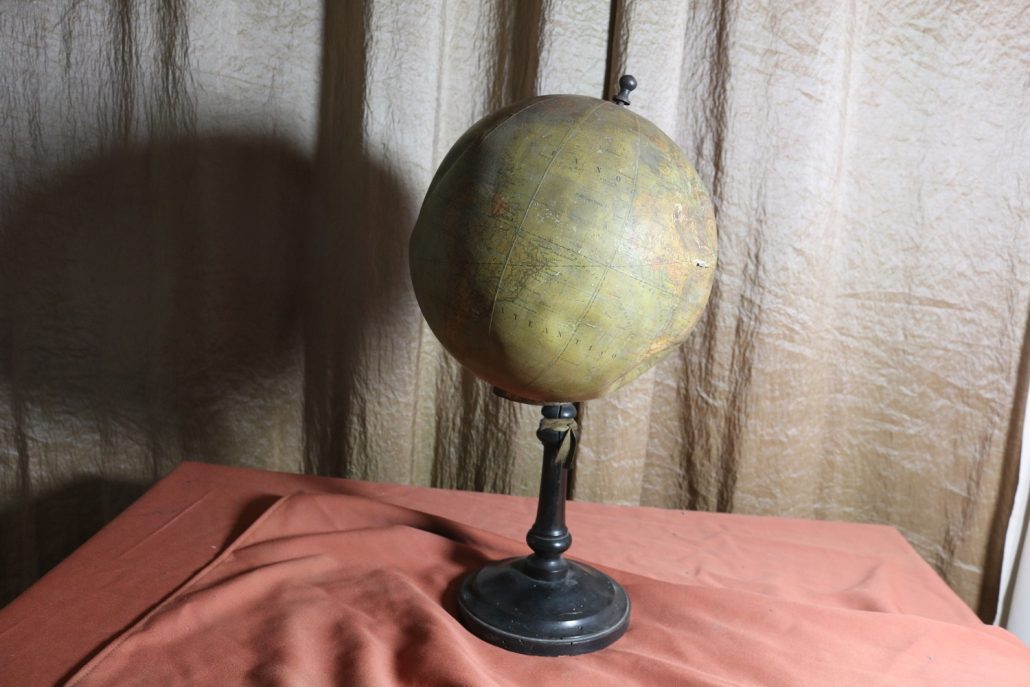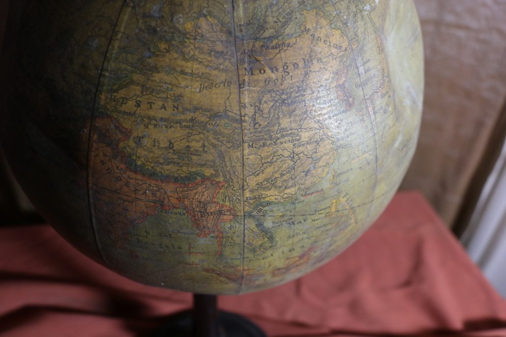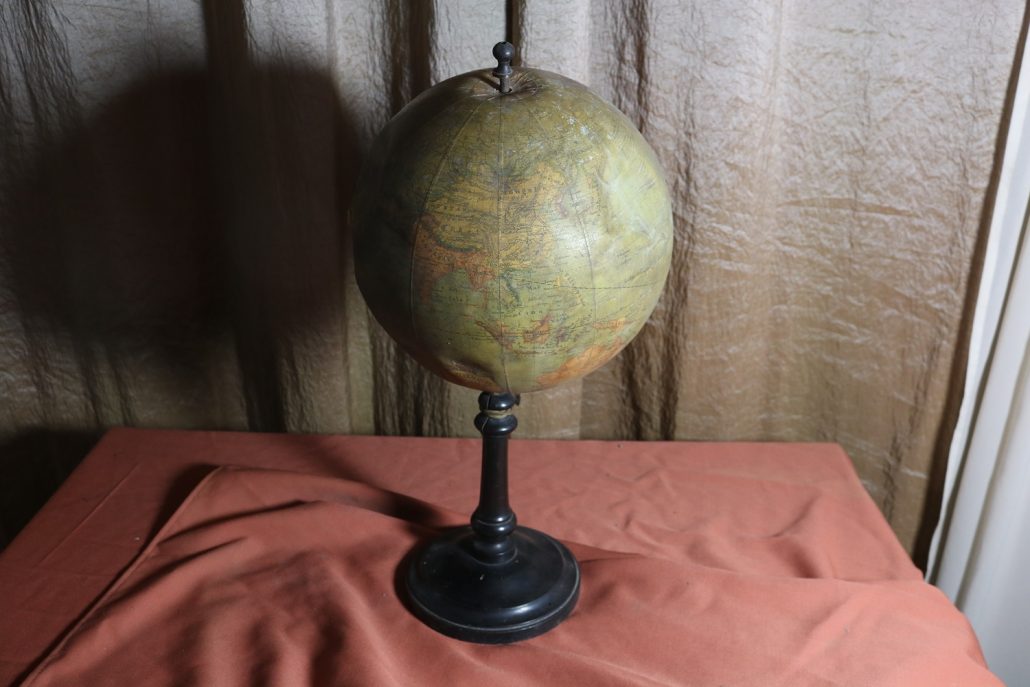 Mappamondo. Mappamondo in papier maché sostenuto da una base in legno ebanizzato costituita da un pianetto tondo da cui si sviluppa una colonna con elaborate torniture a cui è innestato il mappamondo. Nel prosieguo della colonna alla sommità compare una piccola trottola.