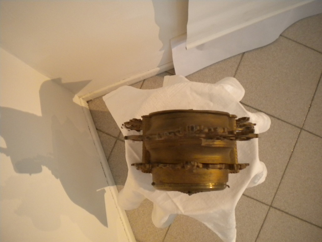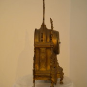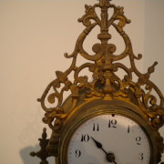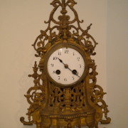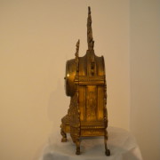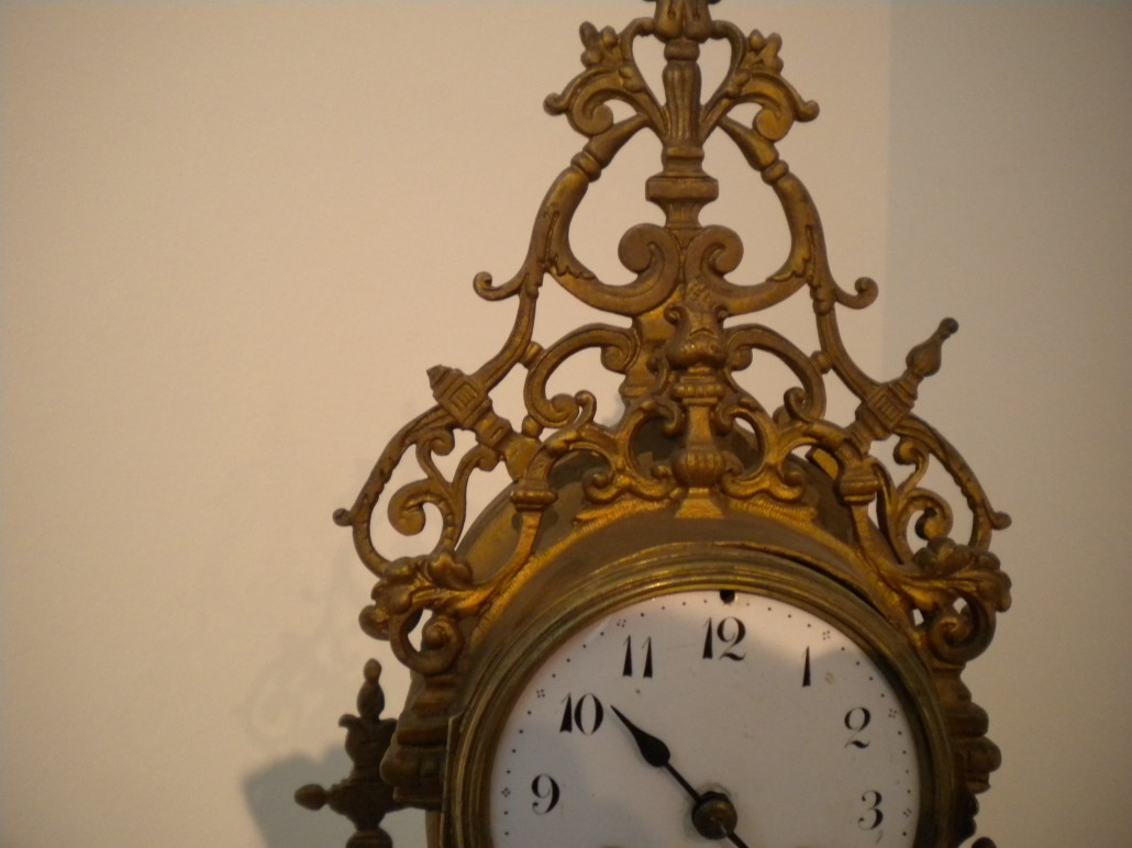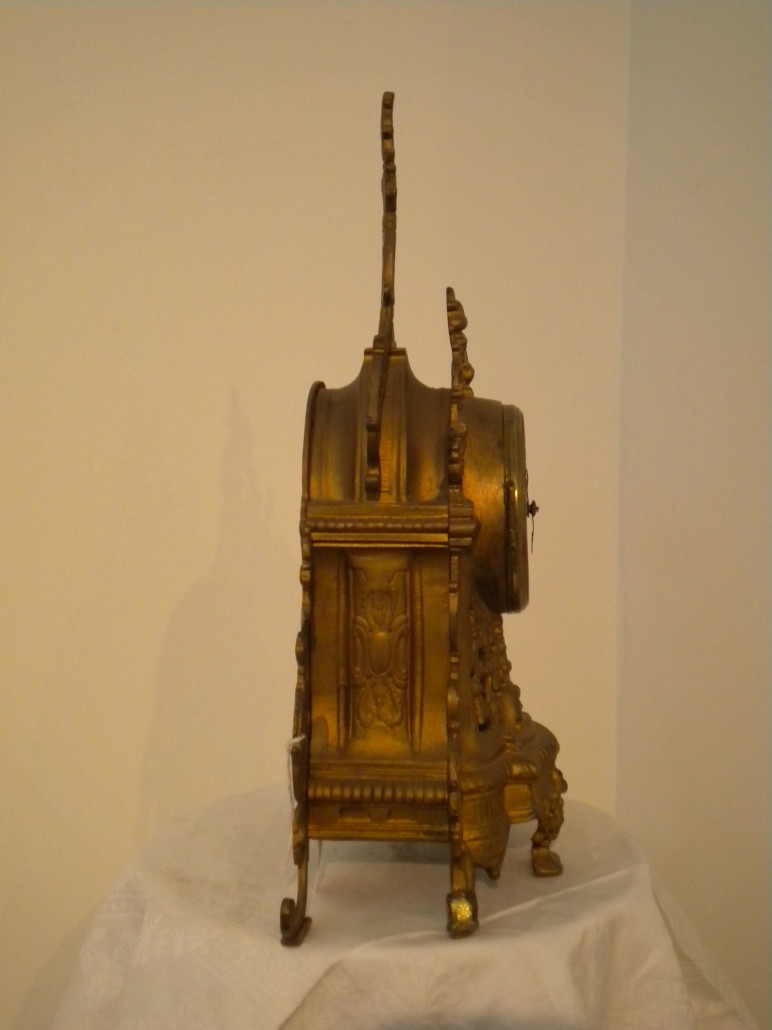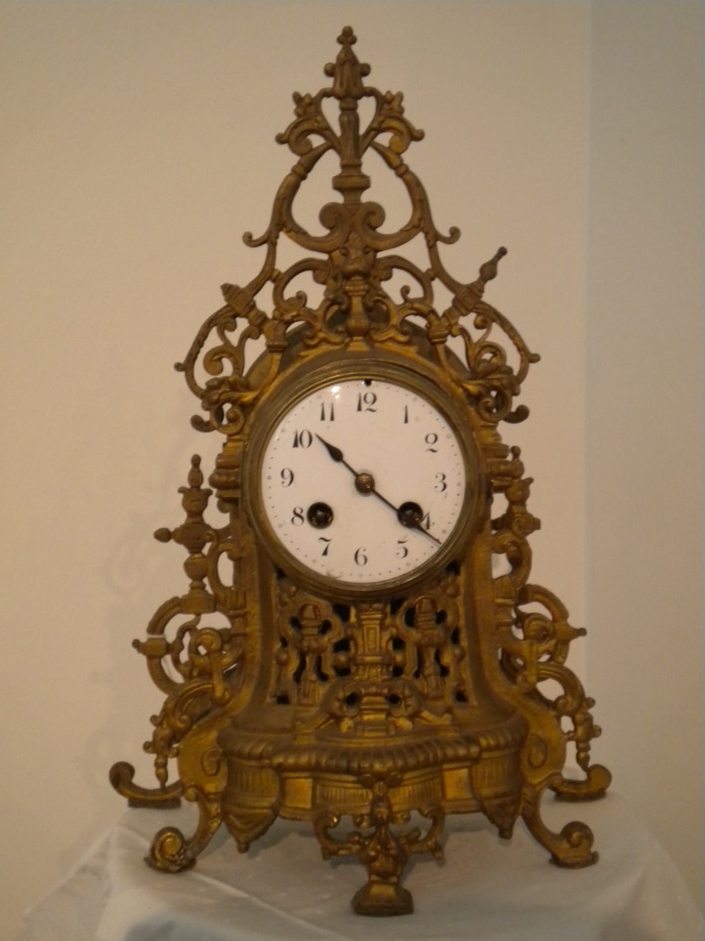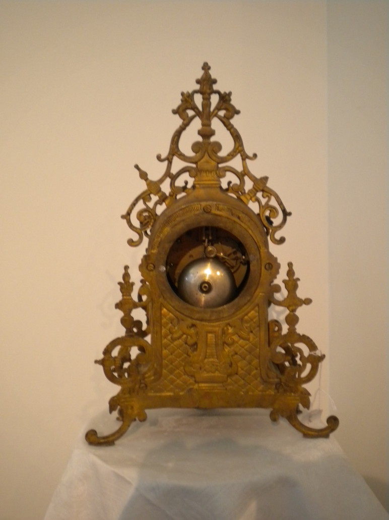 Orologio da camino in bonzo dorato, quadrante in ceramica smaltata, decorazioni neogotiche a traforo. Suona le ore e le mezz’ore.