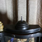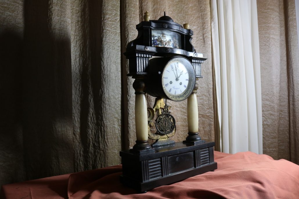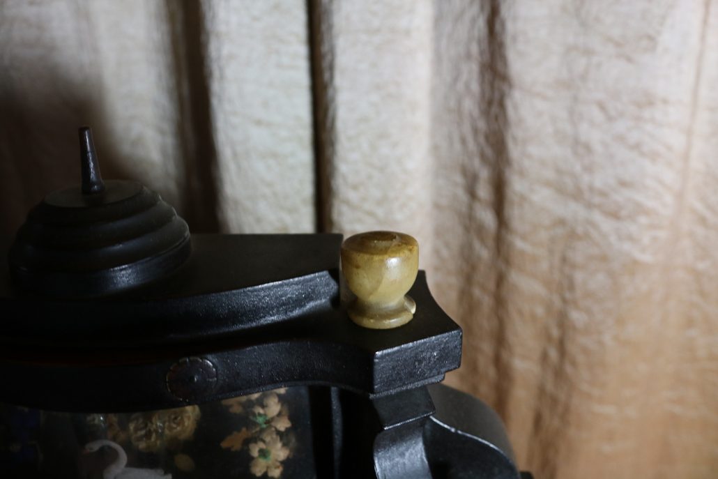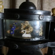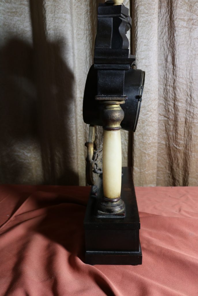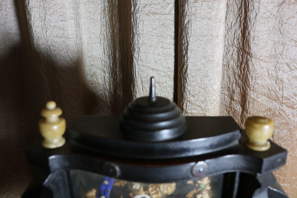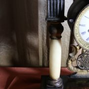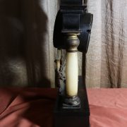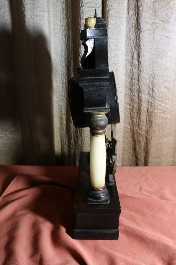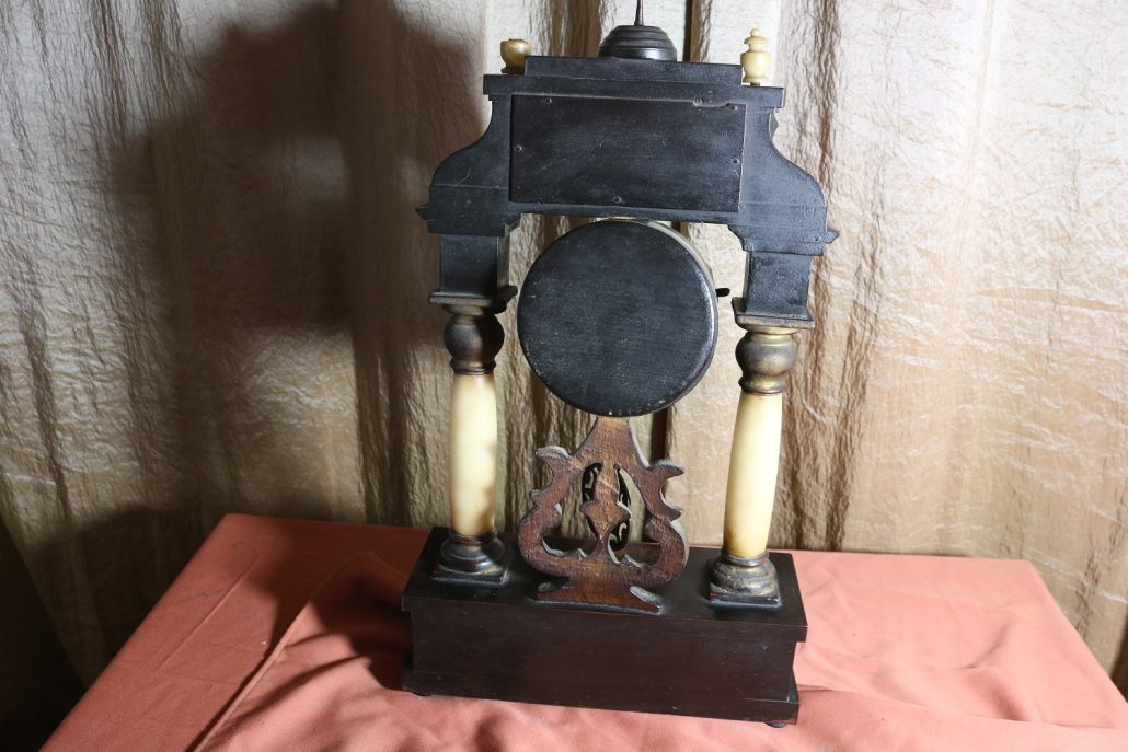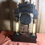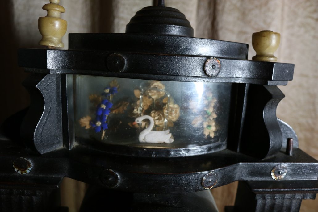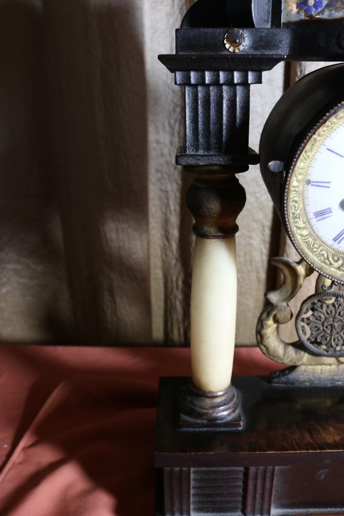 Sopra una base in legno di ebano suddiviso in tre riquadri decorati da un motivo scanalato e sorretto da quattro piedini a disco, poggiano due colonne in alabastro ed ebano reggenti un architrave su cui è collocata una decorazione paesaggistica tridimensionale sottovetro.