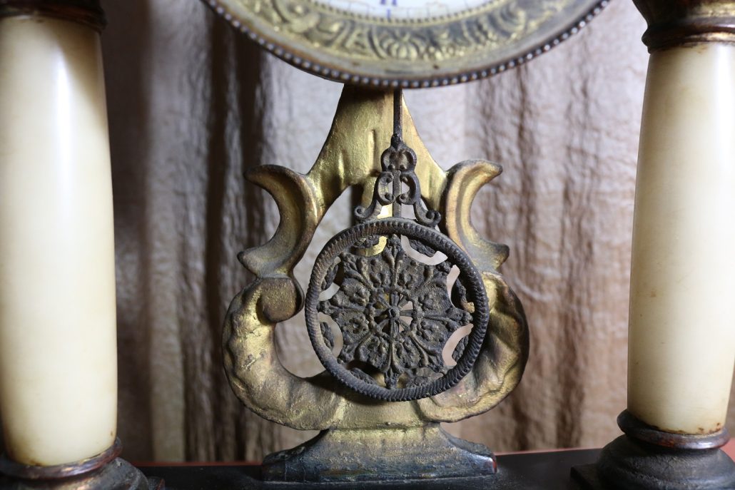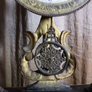 Al di sotto di esso il pendolo a foggia di rosetta si staglia su di un ulteriore sostegno dorato a volute.