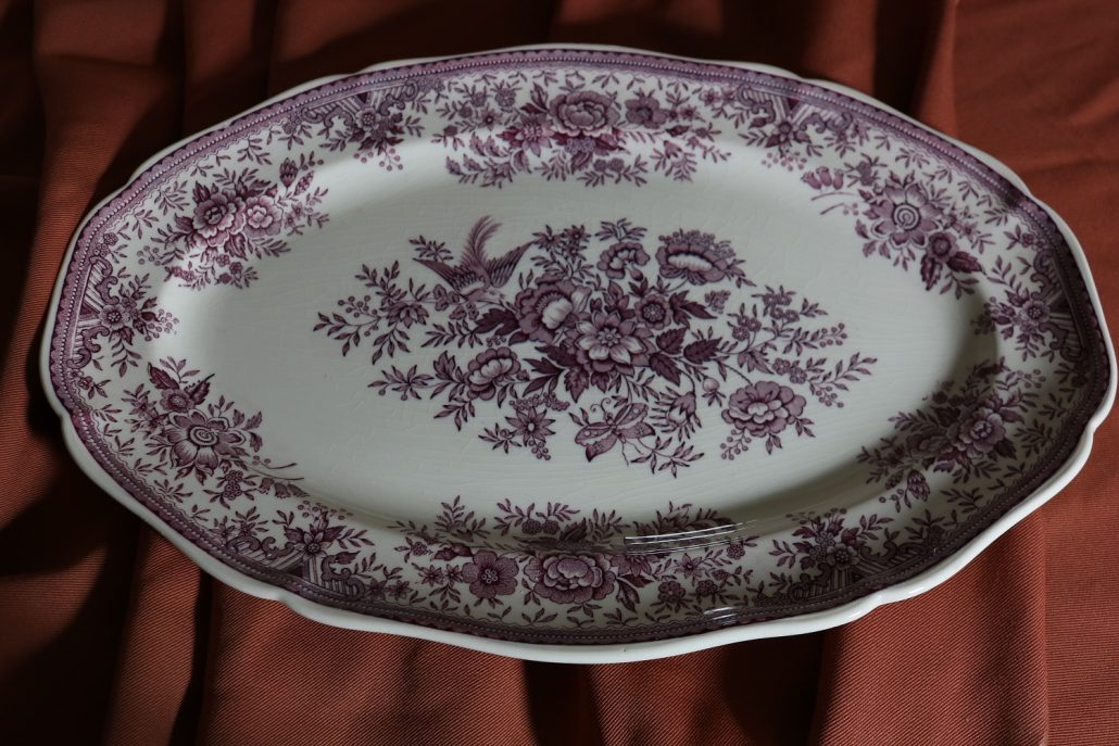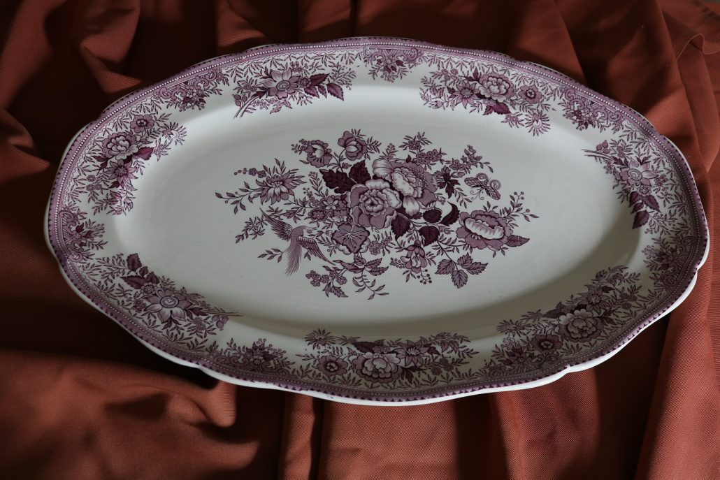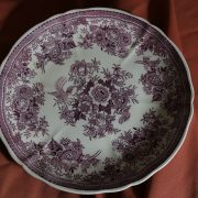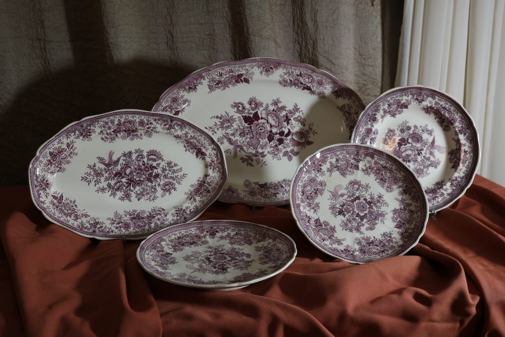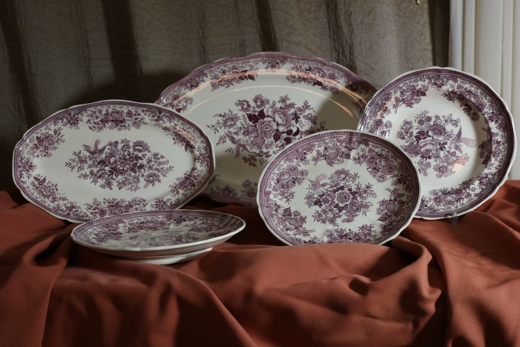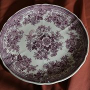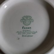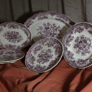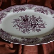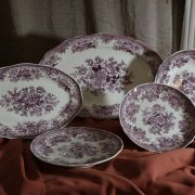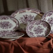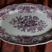 Parte di servizio di paitti “Fasan” Villeroy e Boch. Composto da un grande piatto ovale da portata (46 cm x 30 cm h 4 cm), un piatto da portata ovale più piccolo (33,5 cm x 23 cm h 3 cm), un piatto fondo (d. 25,5 cm h 4 cm) e due piatti piani (d. 23 cm x h 4 cm). In perfette condizioni, presentano una decorazione floreale nei toni del rosa.