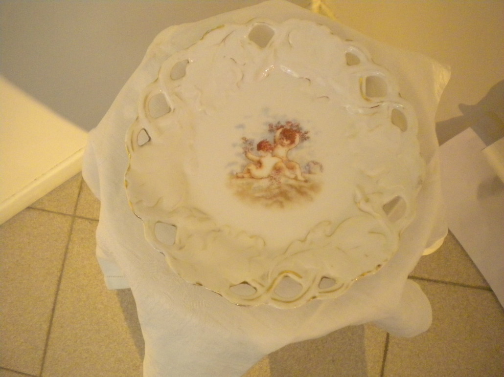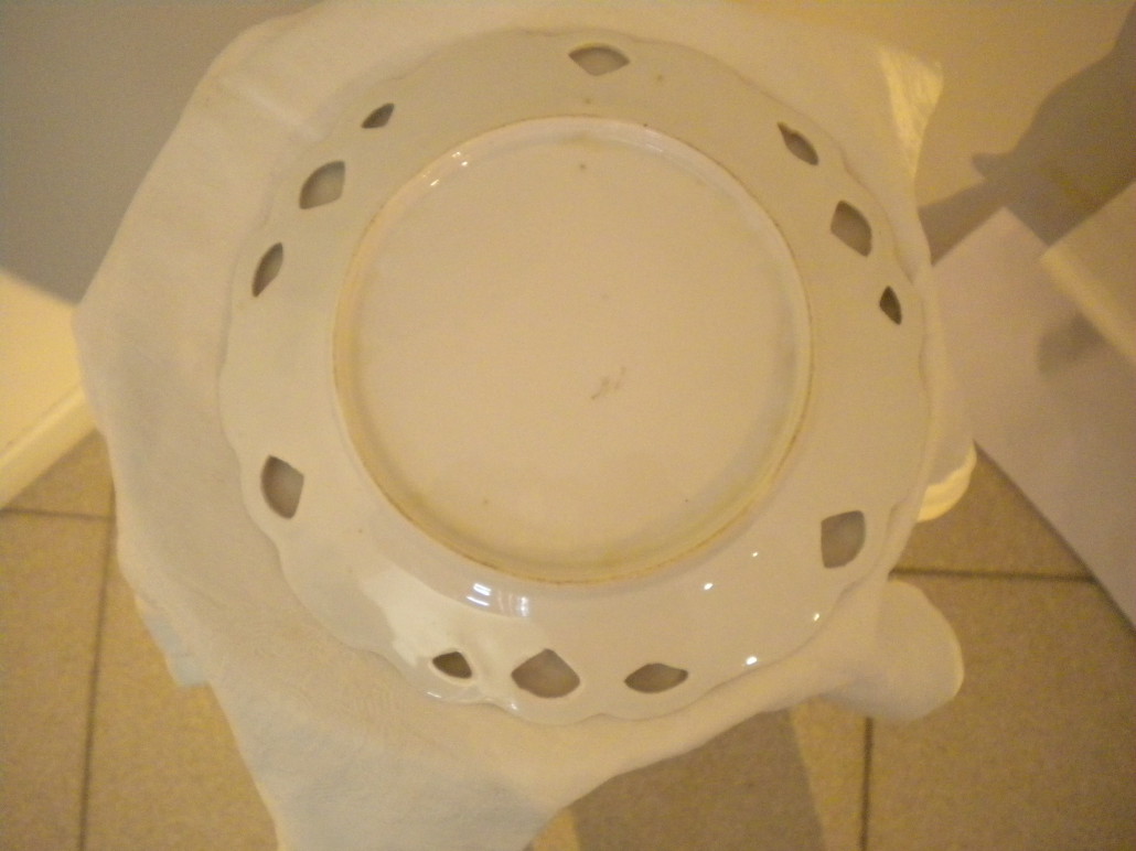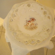 Piatto in ceramica decorato a traforo con scena allegorica.