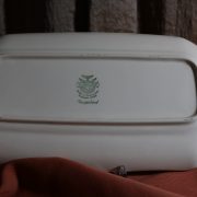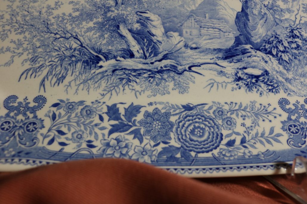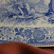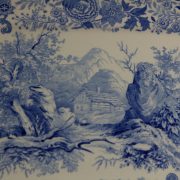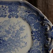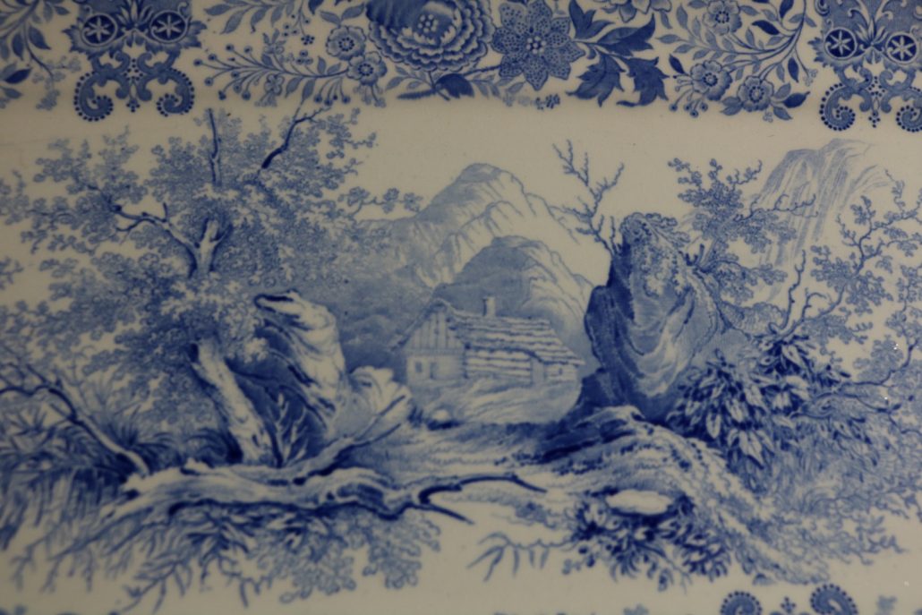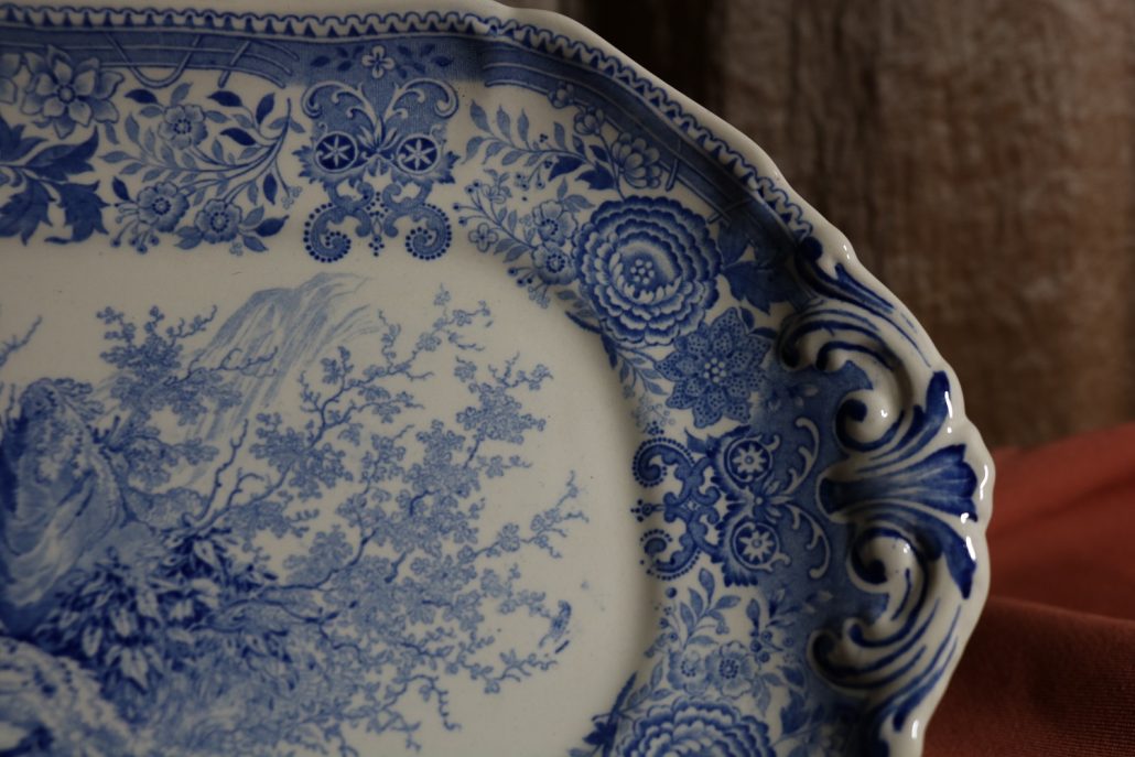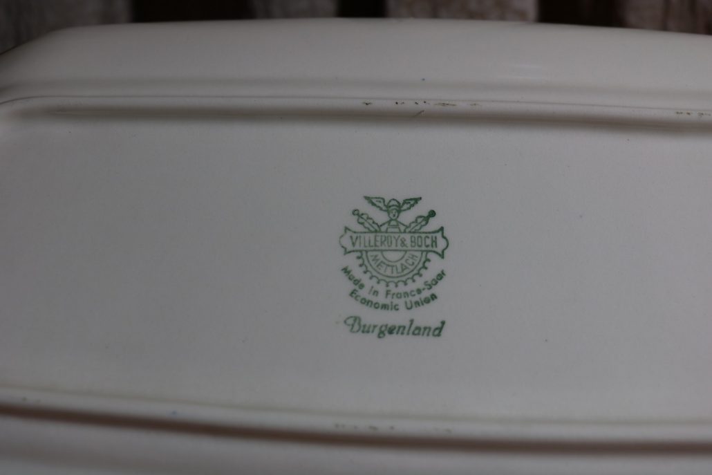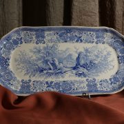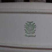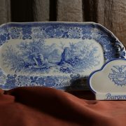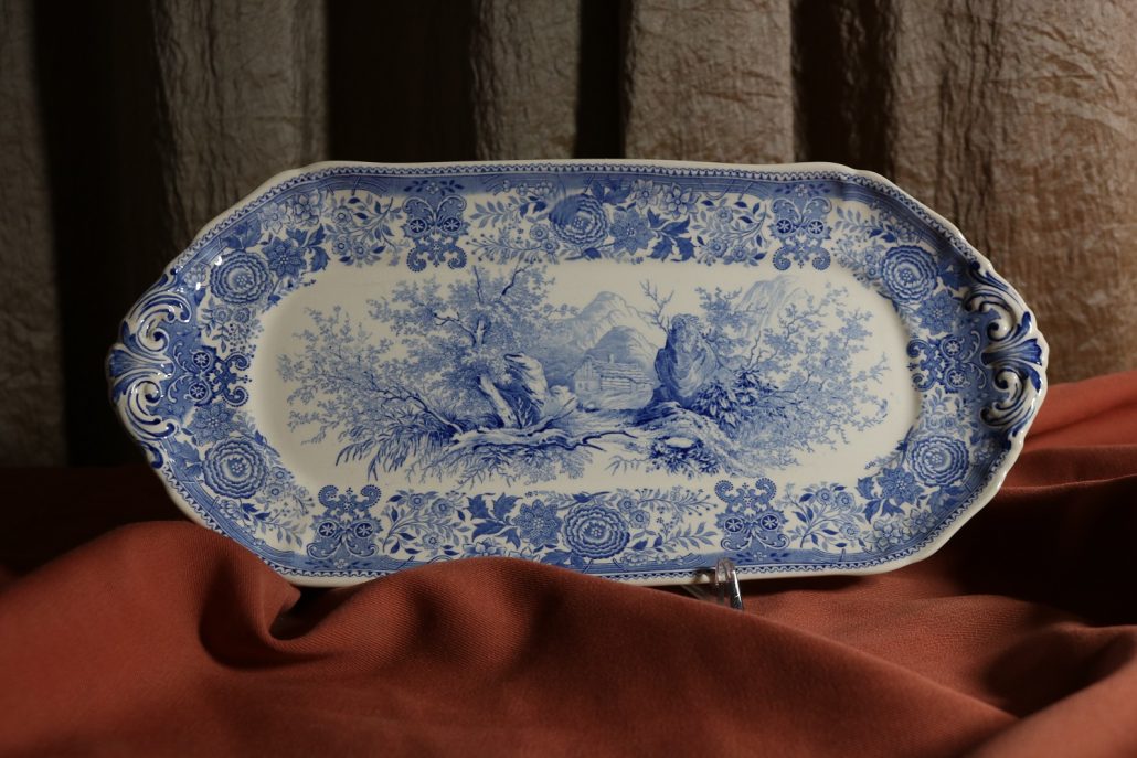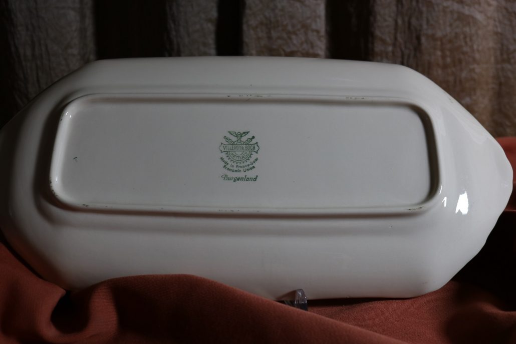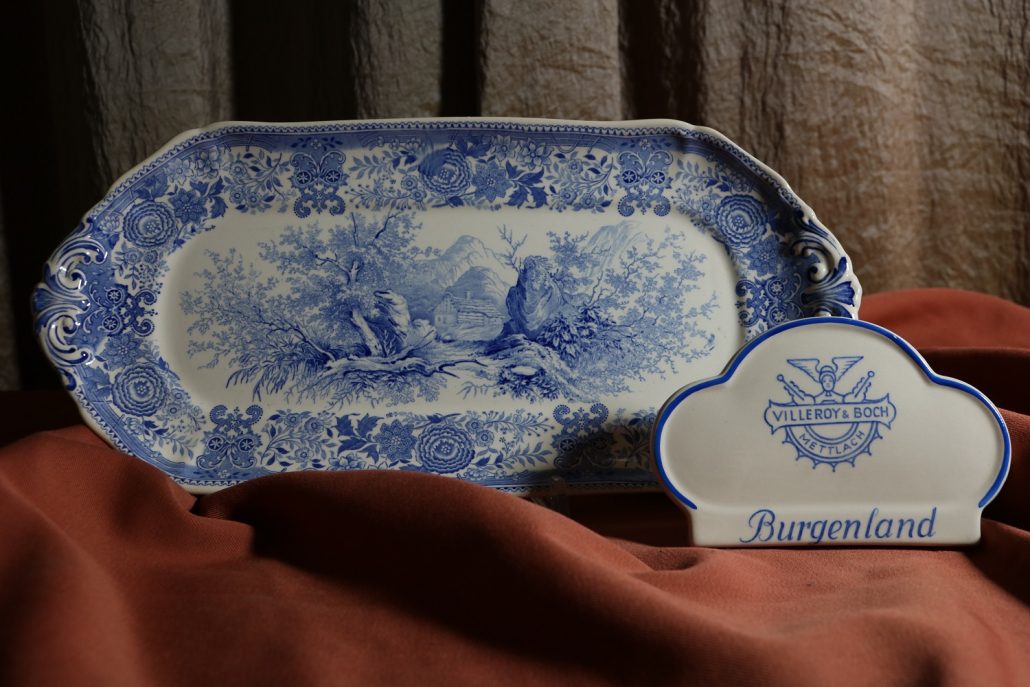 Piatto a vassoio della collezione “Burgenlond” prodotto dalla ditta “Villeroy e Boch”. Dalla forma allungata, questo piatto, prende fora di un piccolo vassoio. IL sollevamento sui due lati corti, favoriscono la presa dell’oggetto e vengono esaltati dalla decorazione a rilievo di volute e controvolute che lo decorano. Al centro del piatto appare una scena bucolica, una piccola casa al centro di una radura con sullo sfondo alte montagne, il tutto quasi celato da una folta vegetazione sui lati. La tesa del piatto presenta invece un motivo vegetale composto da un susseguirsi di fiori, boccioli e foglie, uniti a piccoli motivi geometrici. Protagonista di questo oggetto è il colore che, sebbene monocromo, rivela un’infinità di sfumature, tanto da dare l’impressione di una luce che scaturisce dalla scena centrale diradandosi verso l’esterno.