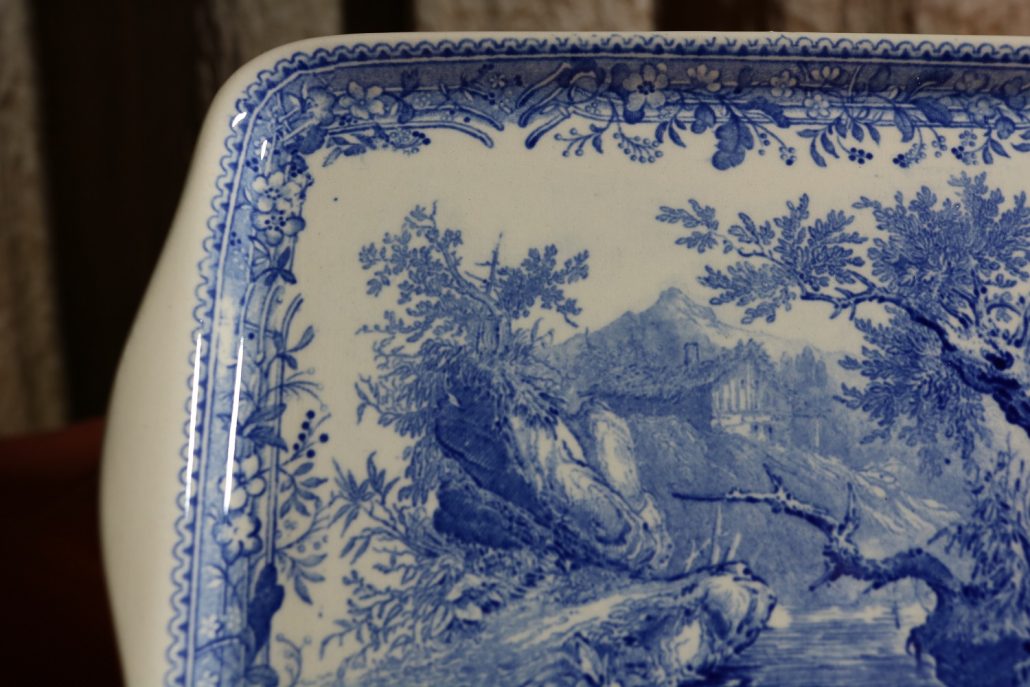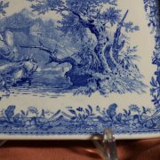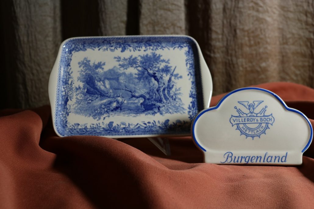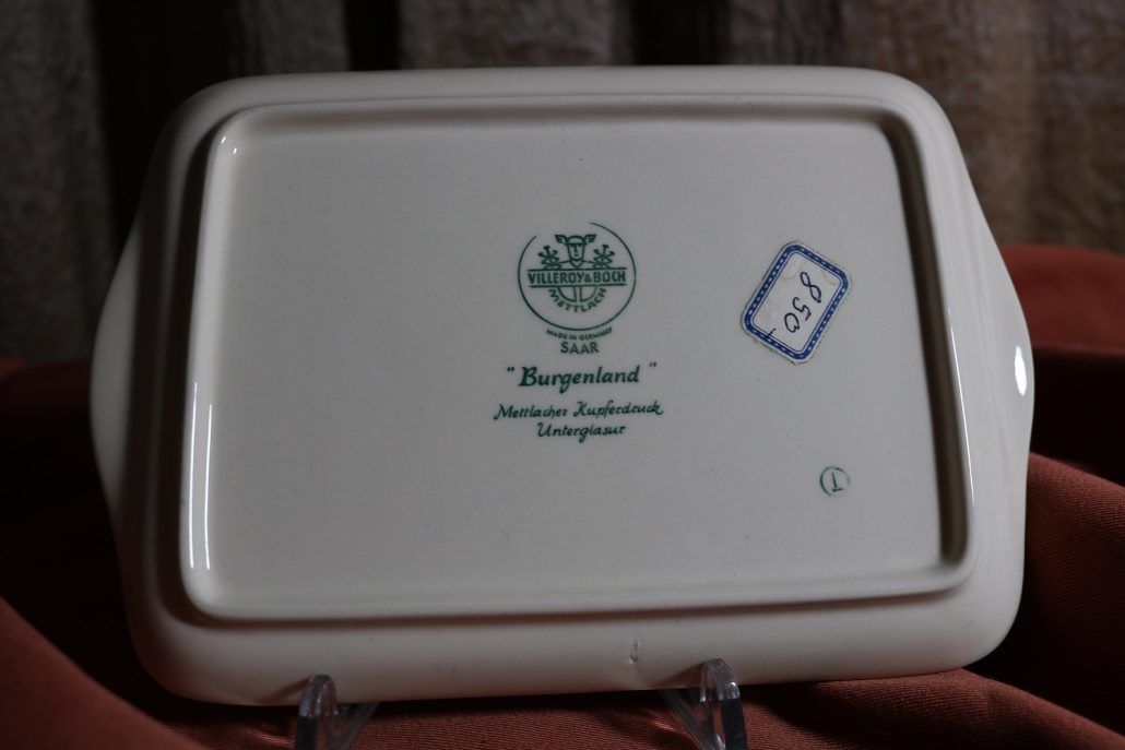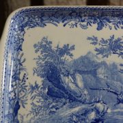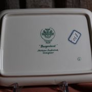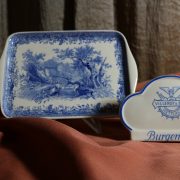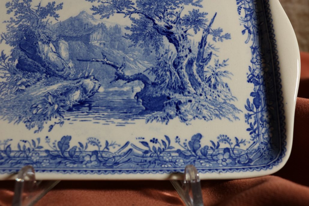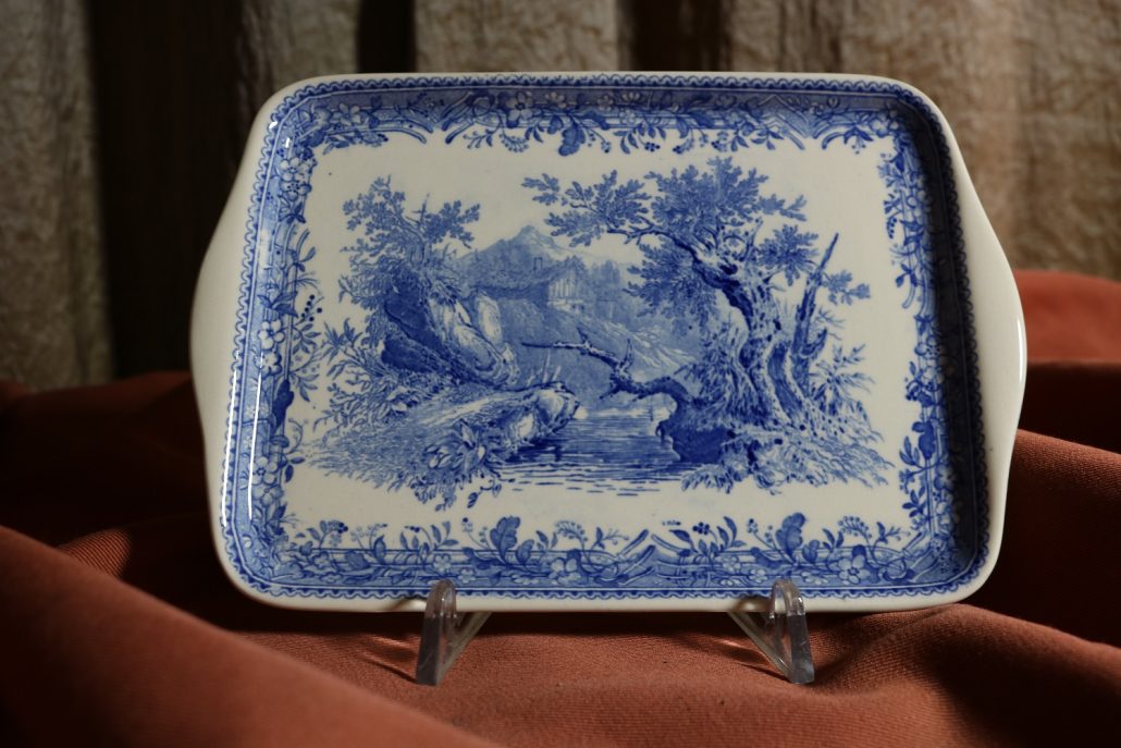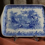Piatto a vassoio della collezione “Burgenlond” prodotto dalla ditta inglese “Villeroy e Boch”. Dalla forma rettangolare, questo piatto, prende fora di un piccolo vassoio. Lo sviluppo verso l’esterno sui due lati corti, favorisce la presa dell’oggetto e la mancanza di colore o decorazione ne evidenzia la presenza. Al centro del piatto appare una scena bucolica, una piccola casa al centro di una radura con sullo sfondo alte montagne, il tutto quasi celato da una folta vegetazione sui lati. La tesa del piatto quasi assente viene sostituita da un bordo ed è priva di decori. A incorniciare il soggetto centrale, una bordura lungo l’incavo costituita da fiori e foglie sovrapposti ad una nastro di tonalità più scuro. Protagonista di questo oggetto è il colore che, sebbene monocromo, rivela un’infinità di sfumature, tanto da dare l’impressione di una luce che scaturisce dalla scena centrale diradandosi verso l’esterno.
