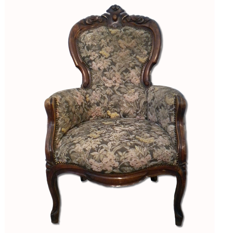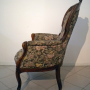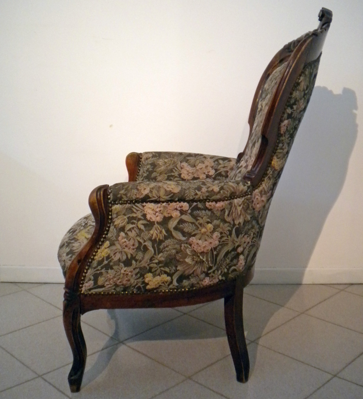 Poltrona Luigi Filippo in noce massello, cimasa intagliata a cartiglio e foglie.