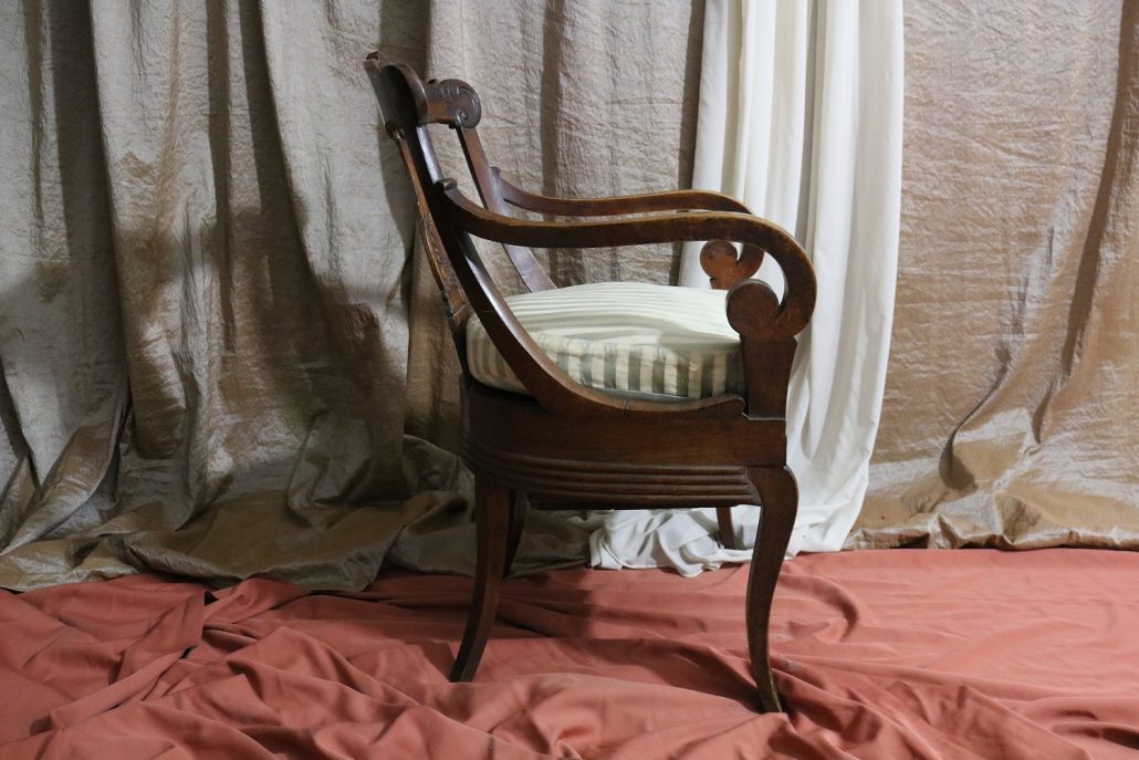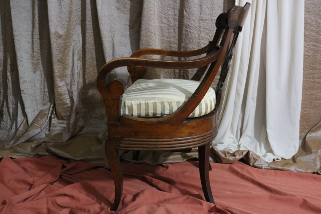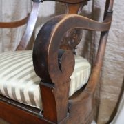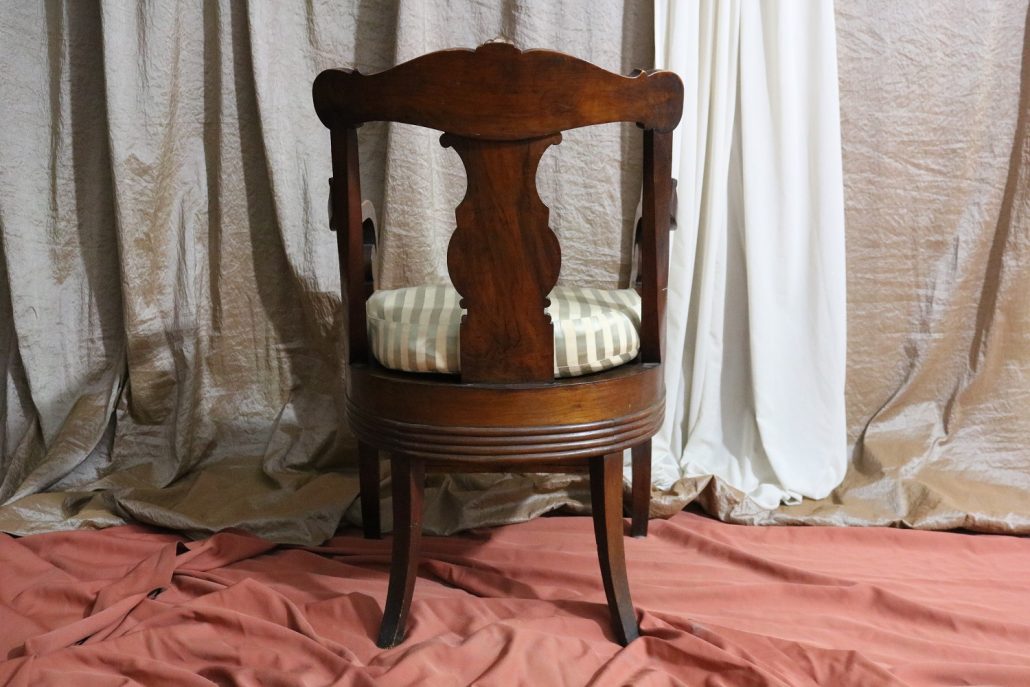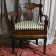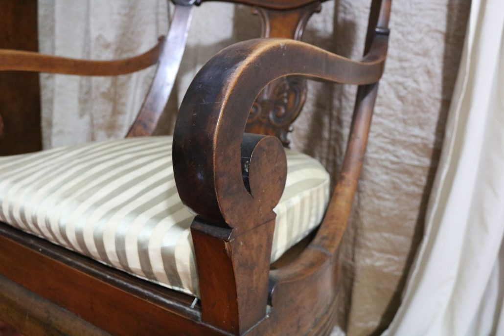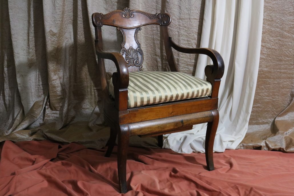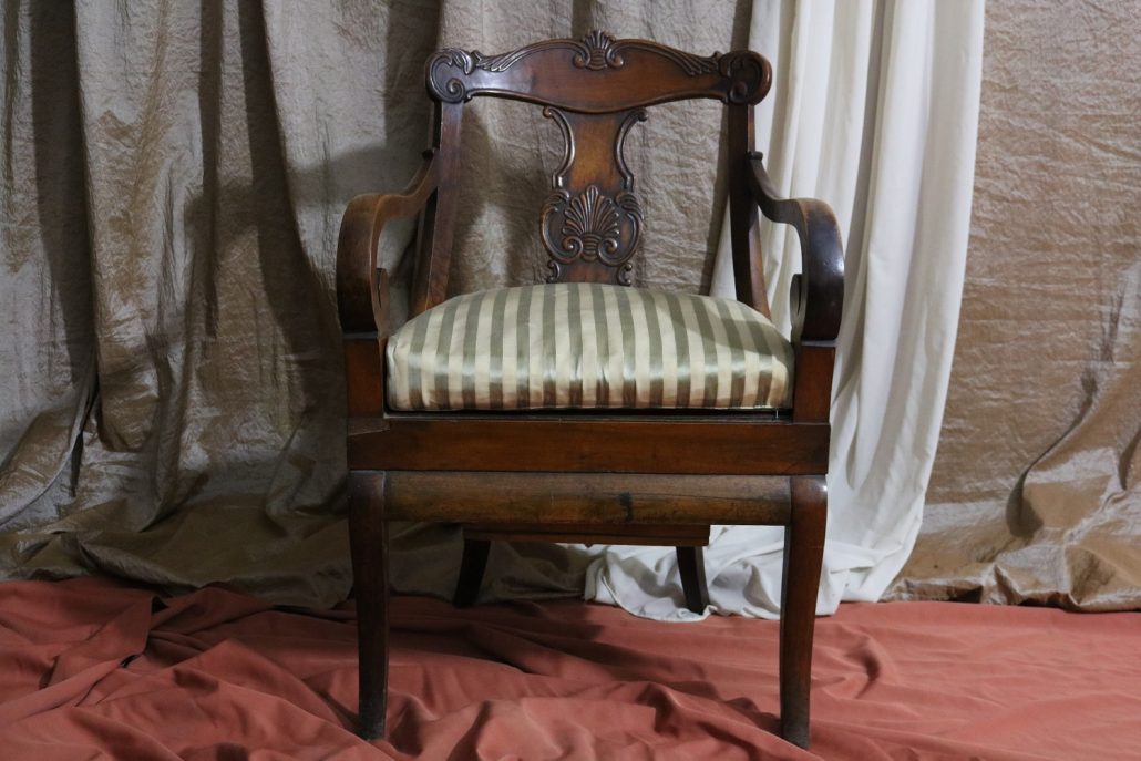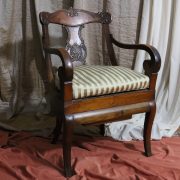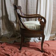 Poltrona comoda Restaurazione, in noce. Un ampio sedile imbottito viene sostenuto da una fascia di notevole spessore che va ad innestarsi alle gambe seguendone la linea mossa, Il sedile prende una forma più ristretta nella parte posteriore, dove viene sostenuto da gambe leggermente arcate all’indietro. Lo schienale a giorno è ottenuto con il proseguimento verticale delle gambe terminante con un innesto alla fascia superiore dello schienale con una decorazione a intaglio raffigurante ricci, e volute. Centralmente la struttura presenta una cartella a sviluppo verticale che riprende gli elaborati intagli della fascia superiore. Dallo schienale prendono forma i braccioli, costituiti da due grandi volute poggianti anteriormente su due plinti, ottenuti con il proseguimento delle gambe anteriori. Asportando il cuscino del sedile, il mobile, rivela una scatola in legno, munita di manico e coperchio per inserirvi il vaso da notte. Questa poltrona di generose dimensioni e di eccelsa fattura presenta i classici stilemi dello stile Restaurazione, dove l’austerità dello stile impero viene ingentilita con decorazioni, in questo caso intagliate, di volute e racemi.