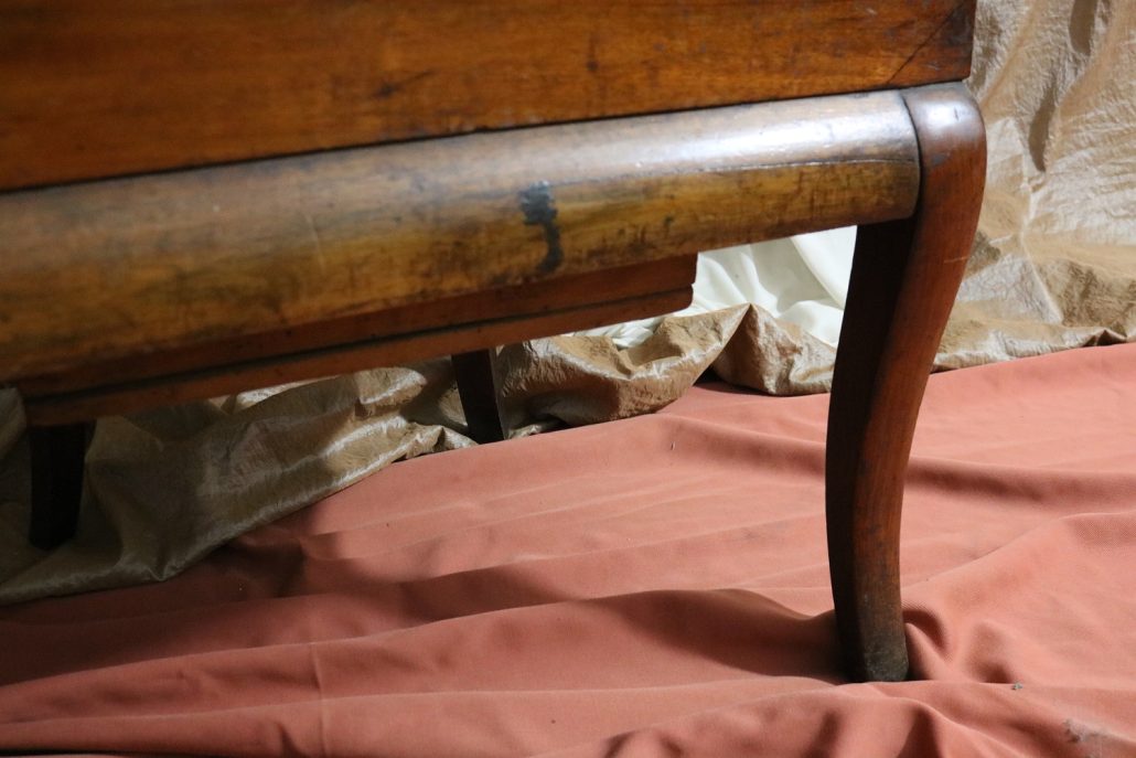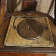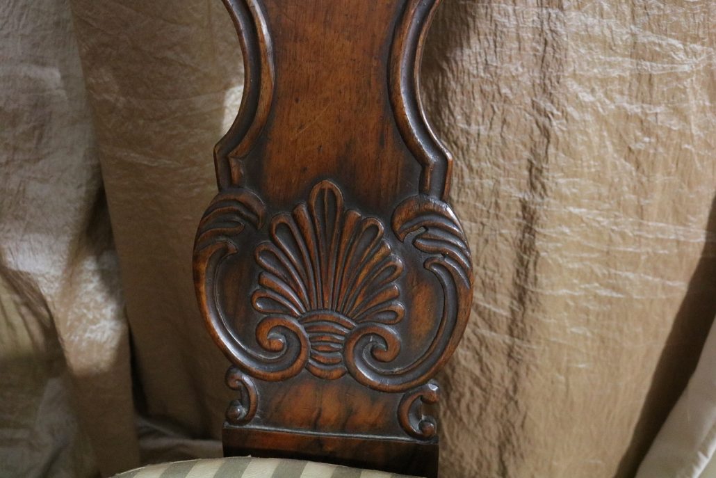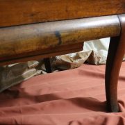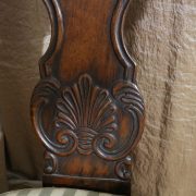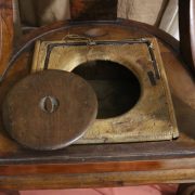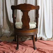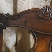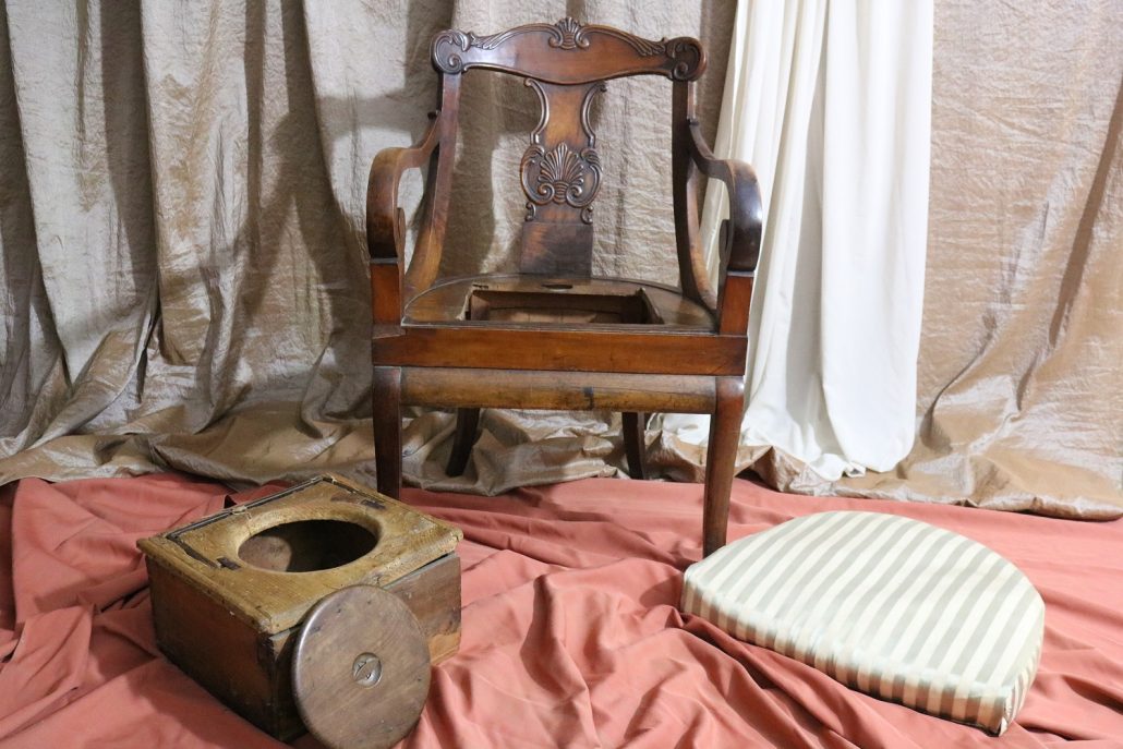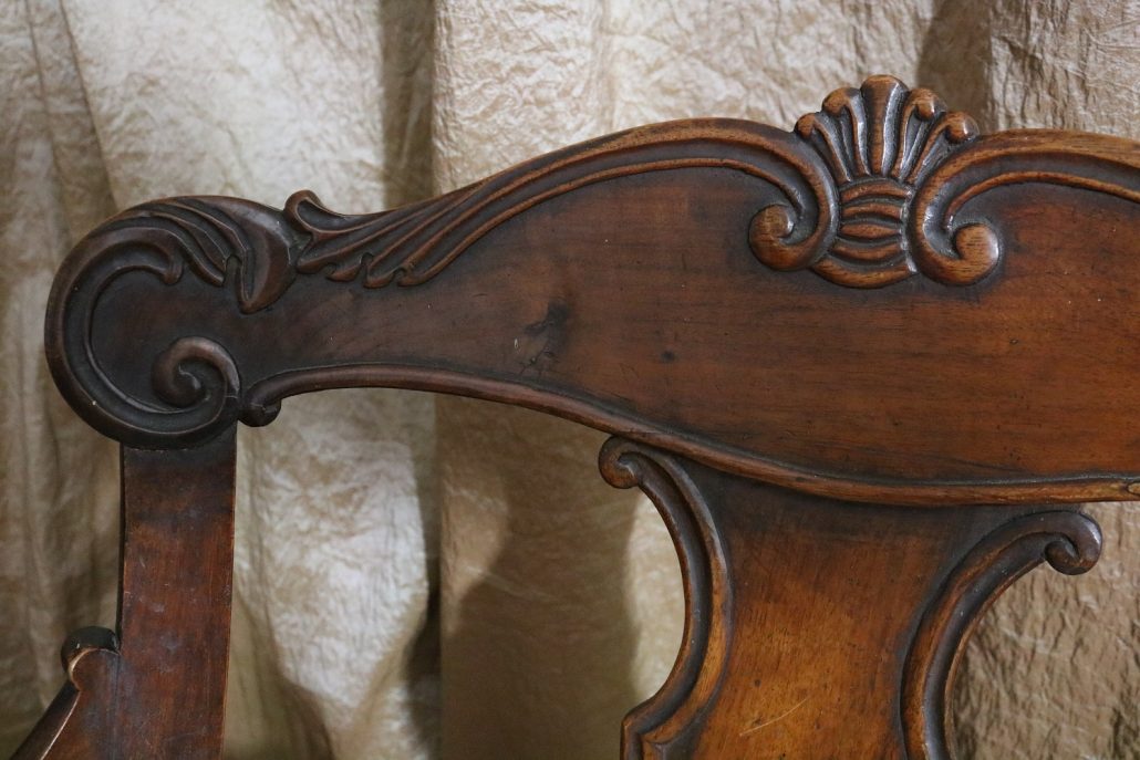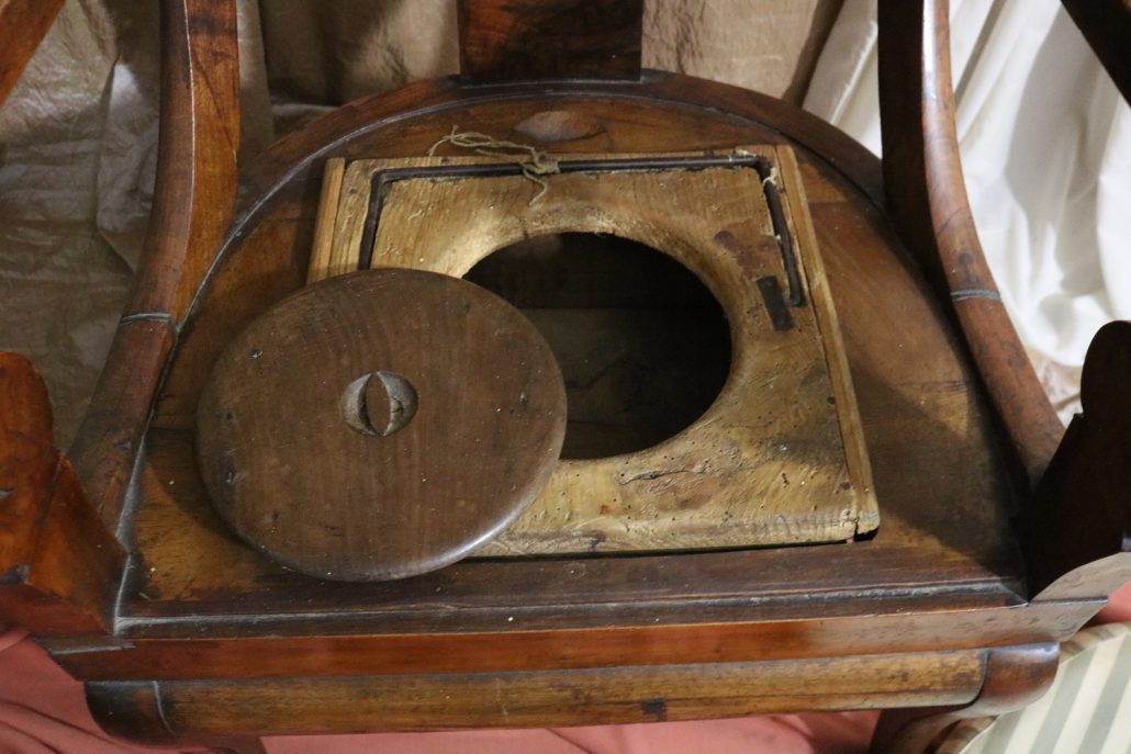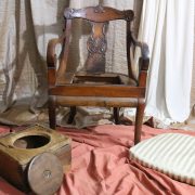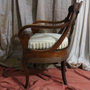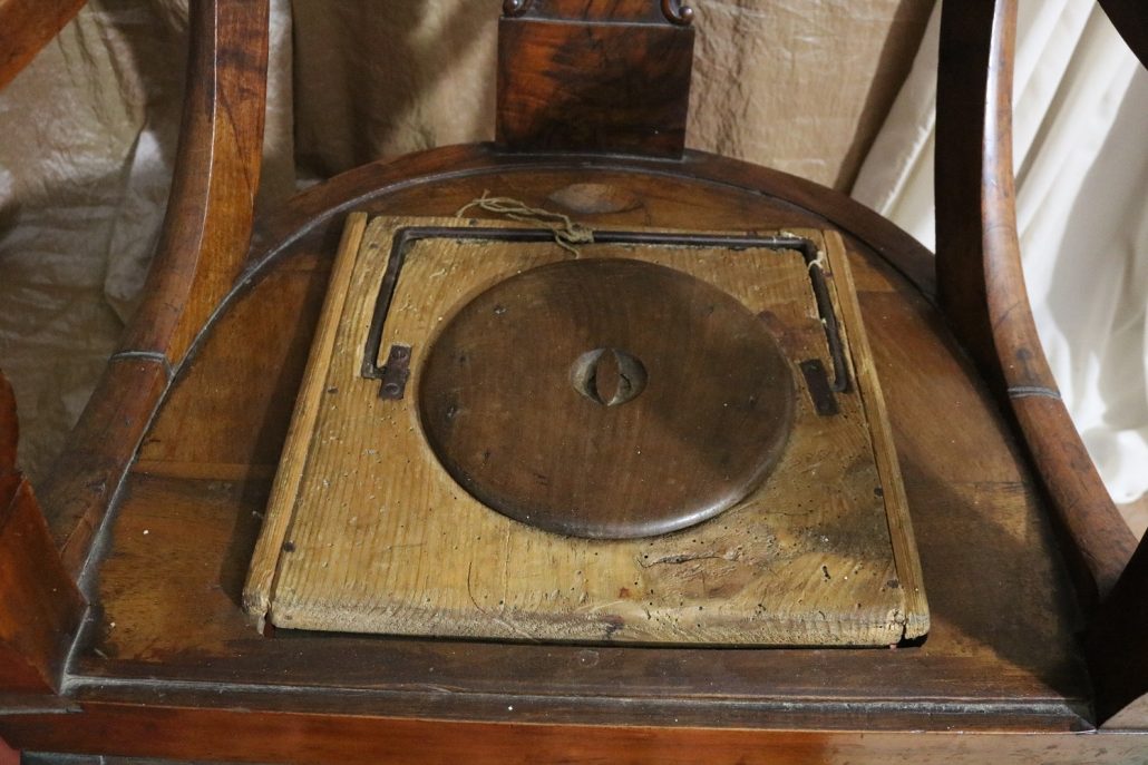 Poltrona comoda Restaurazione, in noce. Un ampio sedile imbottito viene sostenuto da una fascia di notevole spessore che va ad innestarsi alle gambe seguendone la linea mossa, Il sedile prende una forma più ristretta nella parte posteriore, dove viene sostenuto da gambe leggermente arcate all’indietro. Lo schienale a giorno è ottenuto con il proseguimento verticale delle gambe terminante con un innesto alla fascia superiore dello schienale con una decorazione a intaglio raffigurante ricci, e volute. Centralmente la struttura presenta una cartella a sviluppo verticale che riprende gli elaborati intagli della fascia superiore. Dallo schienale prendono forma i braccioli, costituiti da due grandi volute poggianti anteriormente su due plinti, ottenuti con il proseguimento delle gambe anteriori. Asportando il cuscino del sedile, il mobile, rivela una scatola in legno, munita di manico e coperchio per inserirvi il vaso da notte. Questa poltrona di generose dimensioni e di eccelsa fattura presenta i classici stilemi dello stile Restaurazione, dove l’austerità dello stile impero viene ingentilita con decorazioni, in questo caso intagliate, di volute e racemi.