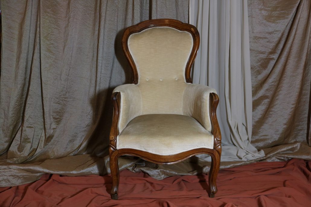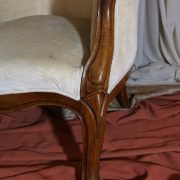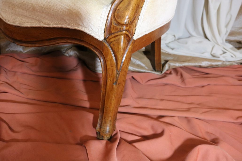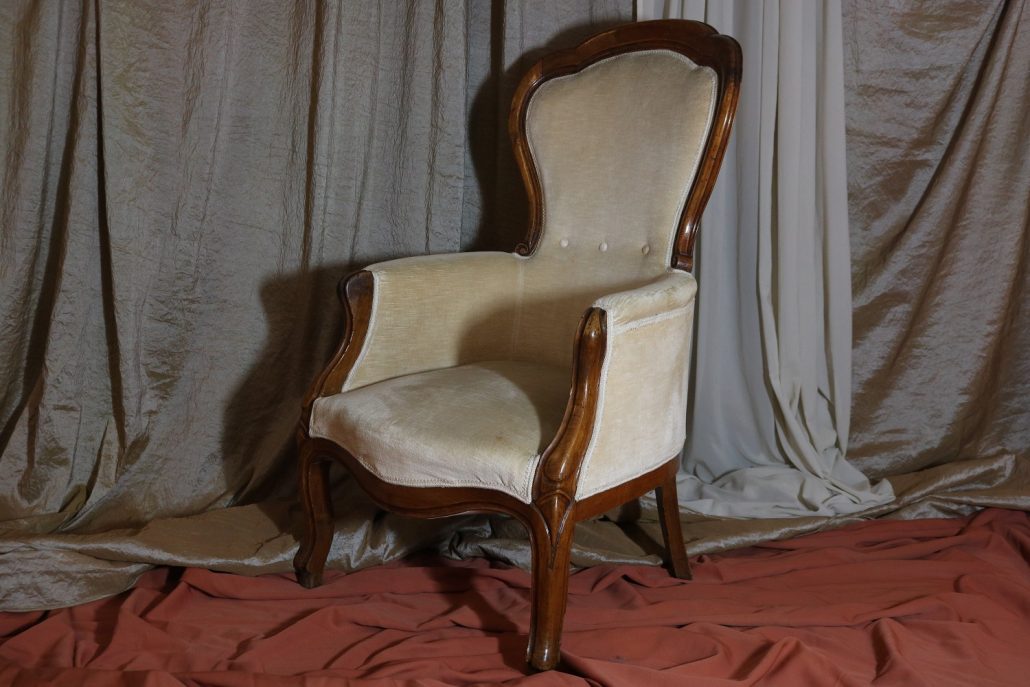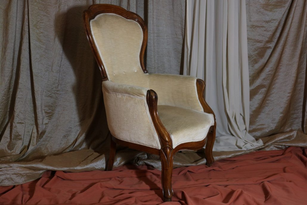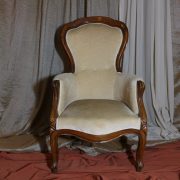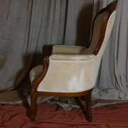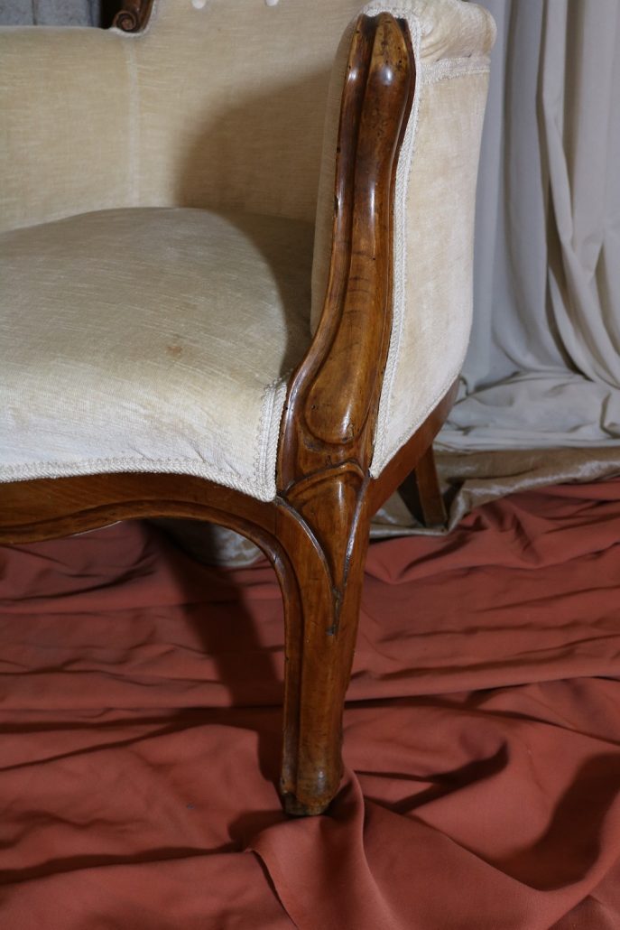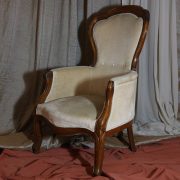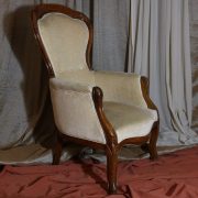 Poltrona Luigi Filippo in noce. Dalle linee sinuose, questo arredo, presenta anteriormente due gambe mosse mentre posteriormente gambe leggermente arcate verso l’esterno. La fascia sotto sedile si innesta alle gambe in perfetta sintonia di movimento, aumentando la propria sezione nella parte centrale, mentre sui lati, le fasce creano la forma del sedile mosso collegando le gambe. In uno sviluppo verticale delle gambe si creano anteriormente i braccioli mentre posteriormente lo schienale culmina nella chiusura da un motivo arco. Unica decorazione è la presenza di una leggera “gola” che corre lungo tutti i profili. In questo modello i fianchi della poltrona e lo schienale sono imbottiti, come il sedile e lasciano scoperte solo alcuni elementi in legno. La poltrona risulta così molto comoda e viene alleggerita dal tessuto che anzi evidenzia le parti lignee. La linea compositiva di questo arredo, caratterizzata da un continuo susseguirsi di curve e controcurve, evidenziata dalla scelta di non utilizzare l’intaglio come elemento decorativo, esalta l’eleganza e la raffinata fattura dello stesso mobile.