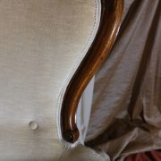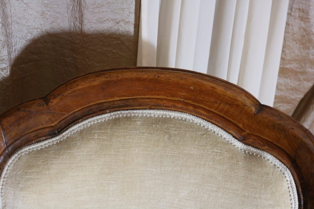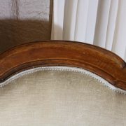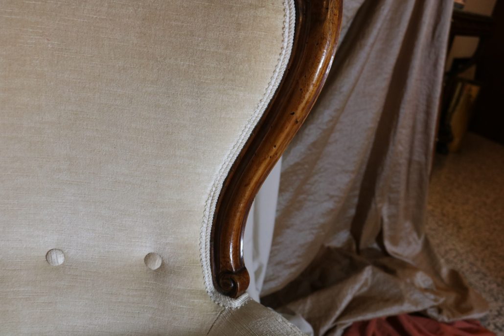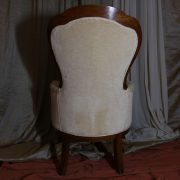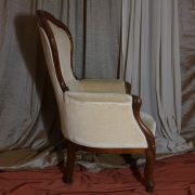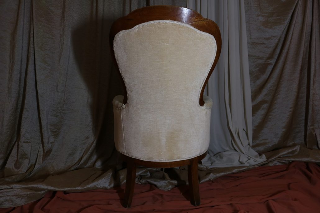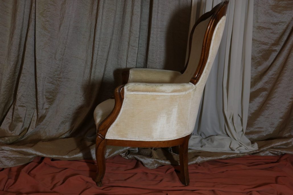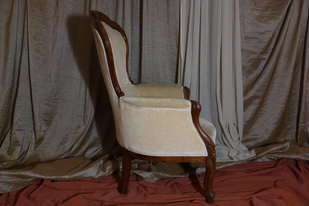 Poltrona Luigi Filippo in noce. Dalle linee sinuose, questo arredo, presenta anteriormente due gambe mosse mentre posteriormente gambe leggermente arcate verso l’esterno. La fascia sotto sedile si innesta alle gambe in perfetta sintonia di movimento, aumentando la propria sezione nella parte centrale, mentre sui lati, le fasce creano la forma del sedile mosso collegando le gambe. In uno sviluppo verticale delle gambe si creano anteriormente i braccioli mentre posteriormente lo schienale culmina nella chiusura da un motivo arco. Unica decorazione è la presenza di una leggera “gola” che corre lungo tutti i profili. In questo modello i fianchi della poltrona e lo schienale sono imbottiti, come il sedile e lasciano scoperte solo alcuni elementi in legno. La poltrona risulta così molto comoda e viene alleggerita dal tessuto che anzi evidenzia le parti lignee. La linea compositiva di questo arredo, caratterizzata da un continuo susseguirsi di curve e controcurve, evidenziata dalla scelta di non utilizzare l’intaglio come elemento decorativo, esalta l’eleganza e la raffinata fattura dello stesso mobile.