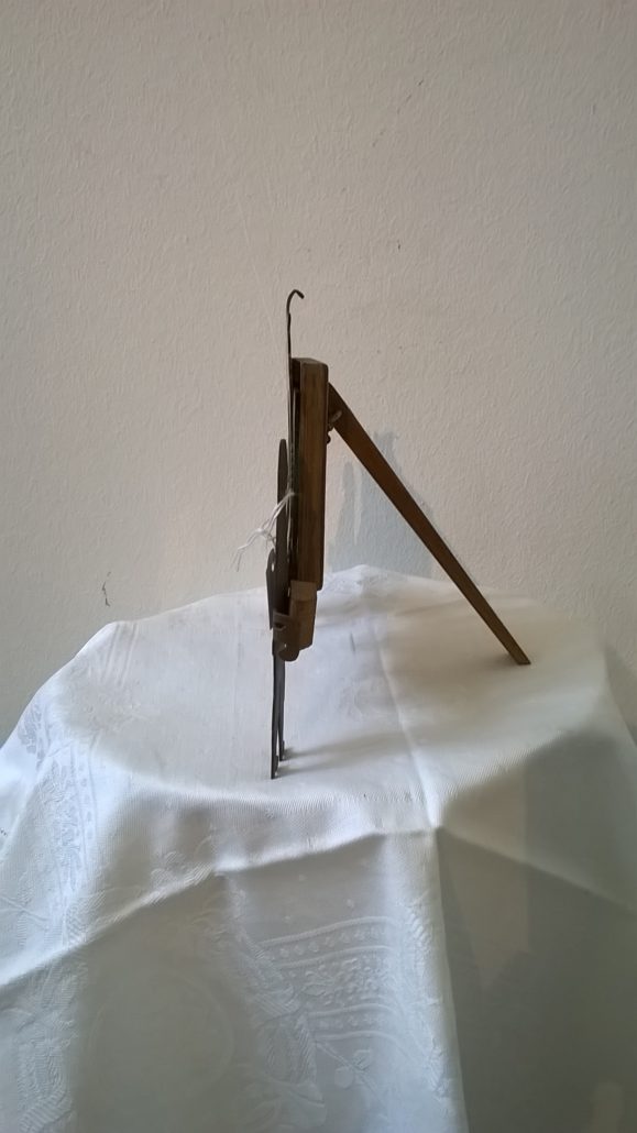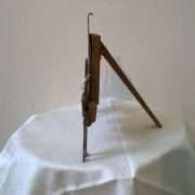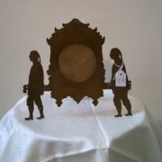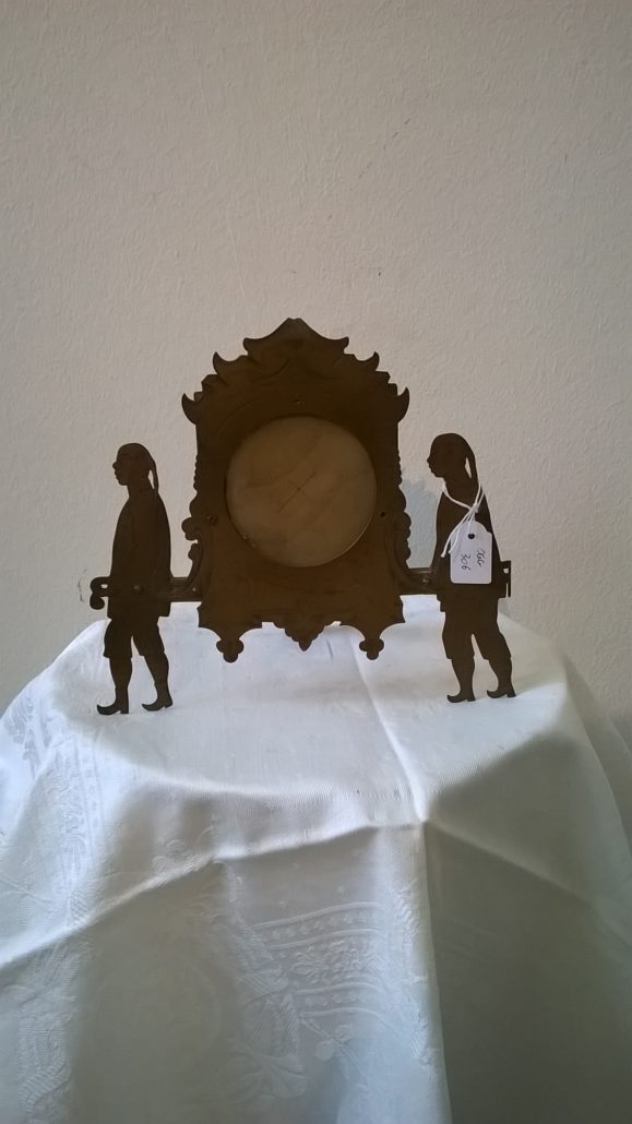 Portafoto in lamierino inciso a foggia di portantina con due cinesi.