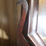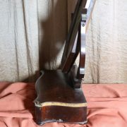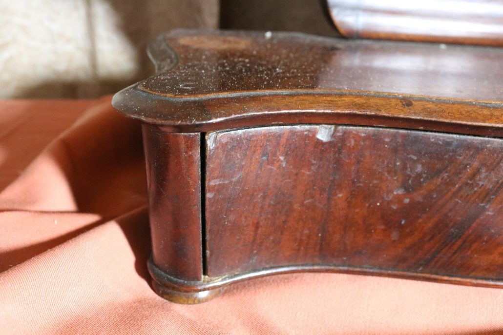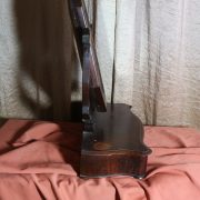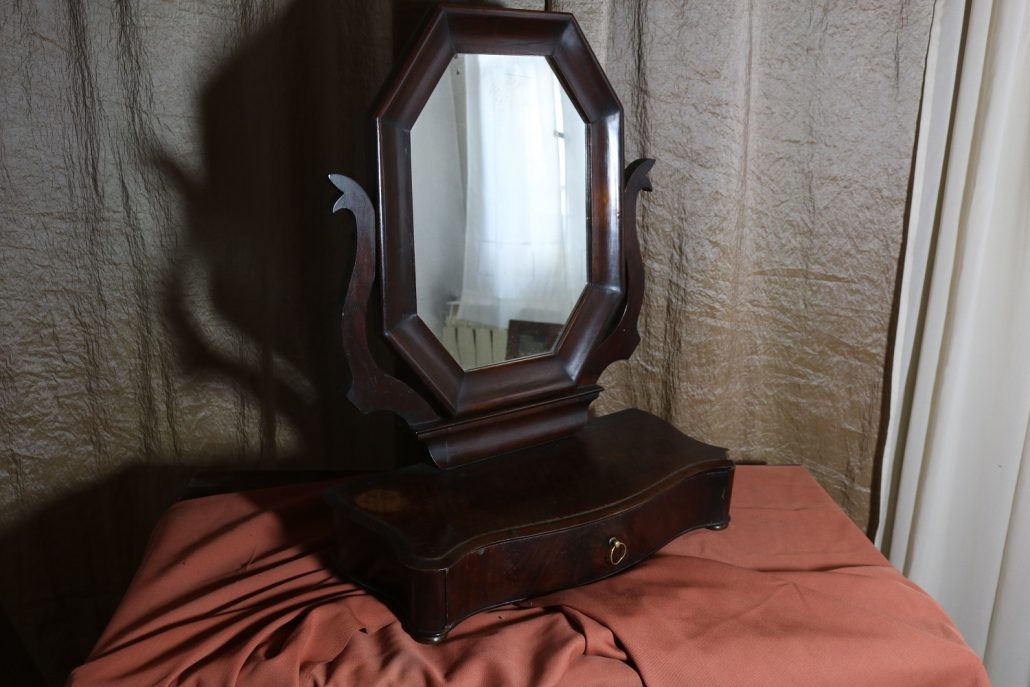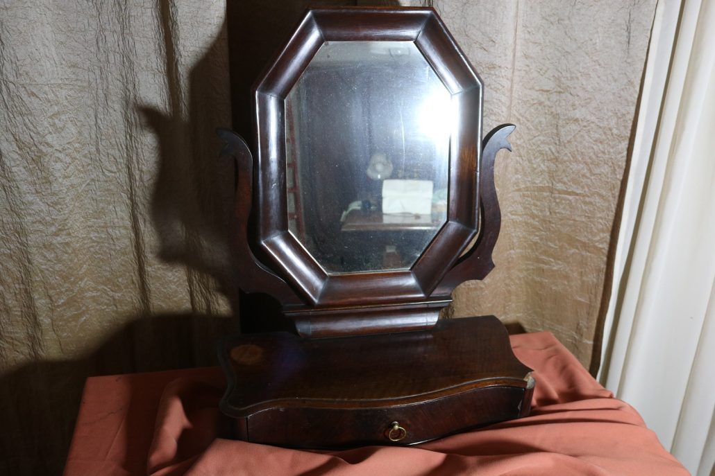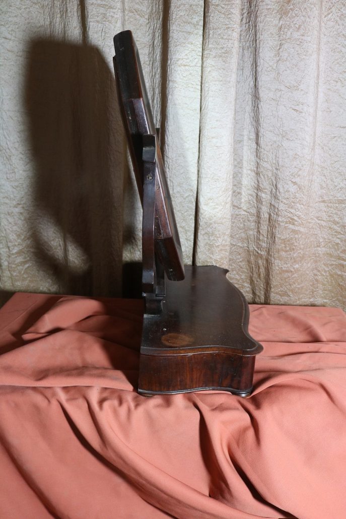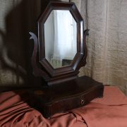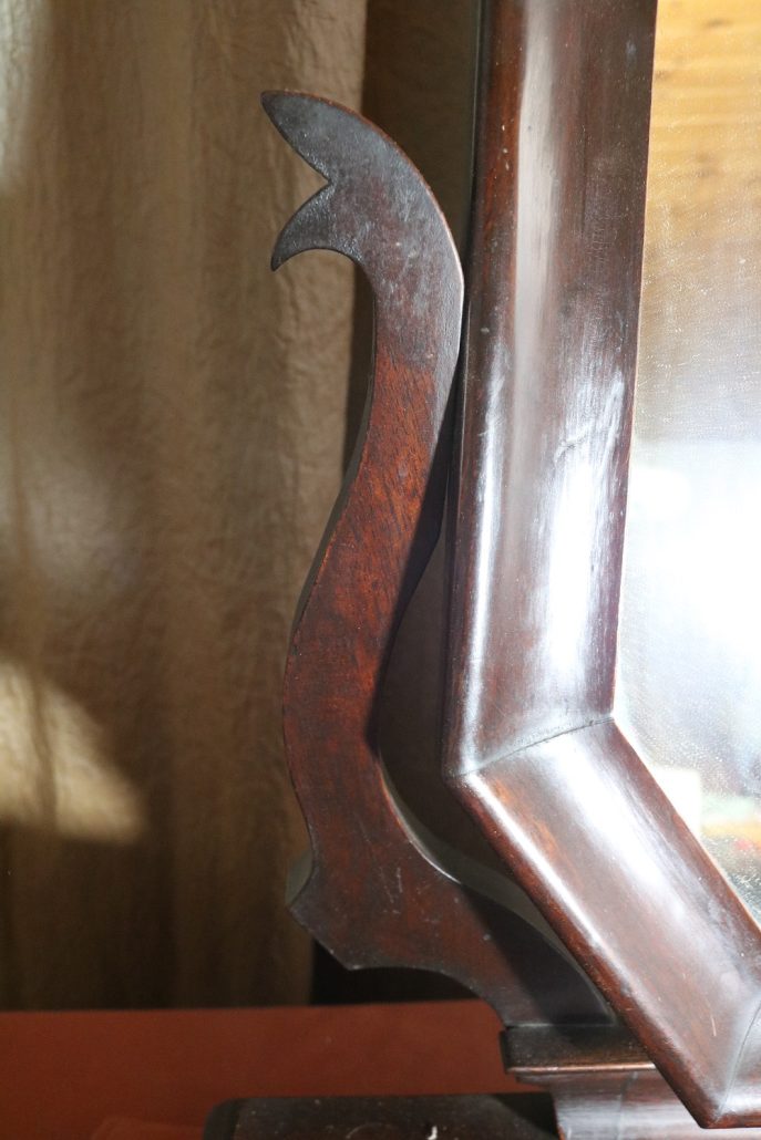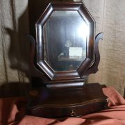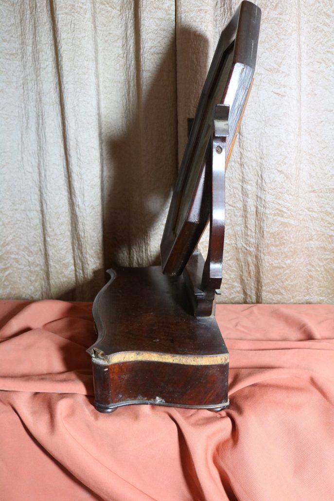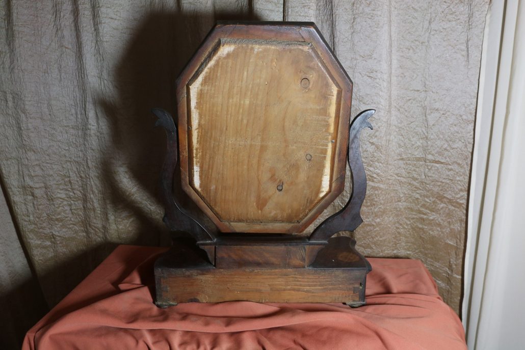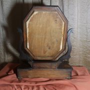 Uno specchio di forma ottagonale, con cornice di semplice foggia, leggermente incava, è montata su di un sostegno a racemi stilizzato composto da due elementi che, partendo da una base abbracciano verticalmente lo specchio innestandosi ad esso mediante due perni che ne consentono il movimento basculante.