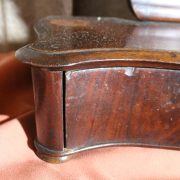 Alla base, una struttura a “scatola” di forma mossa, arricchita da una fine cornice e sostenuta da quattro piedini circolari, cela al suo interno un cassettino porta oggetti munito di una piccola presa ad anello.
