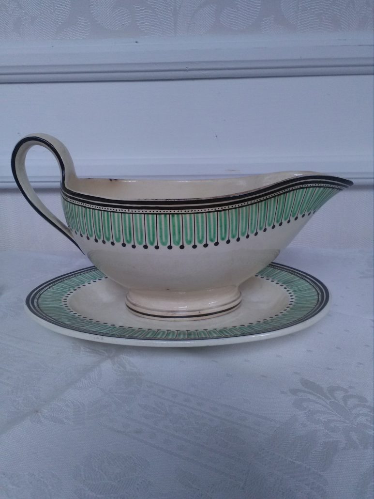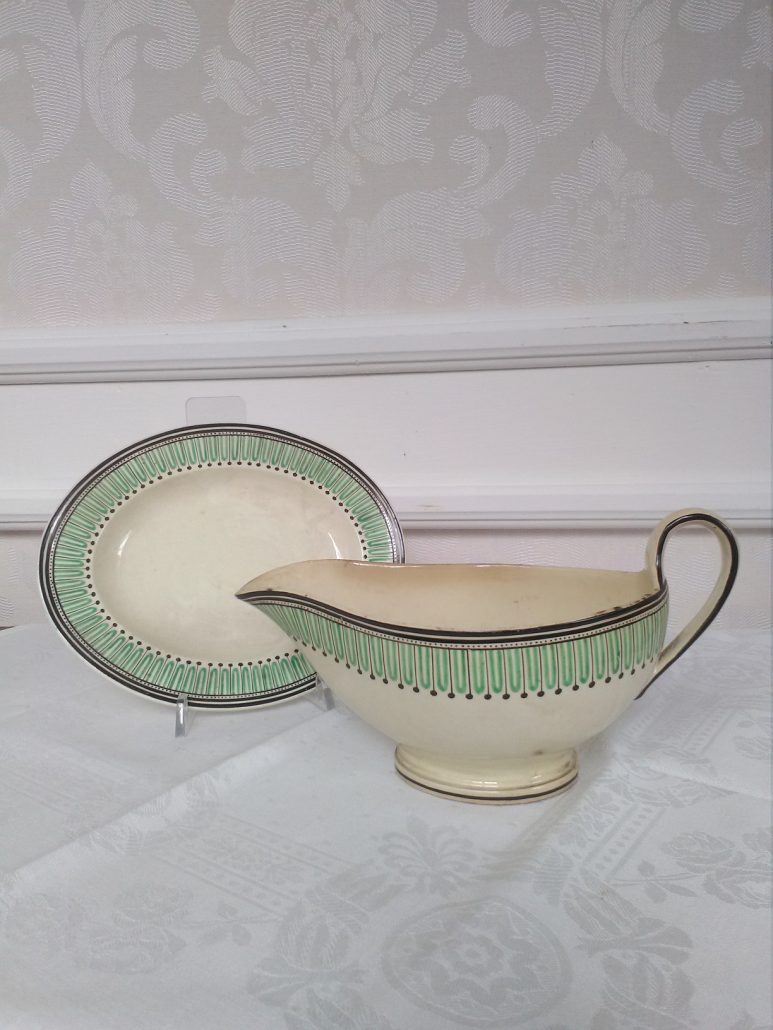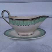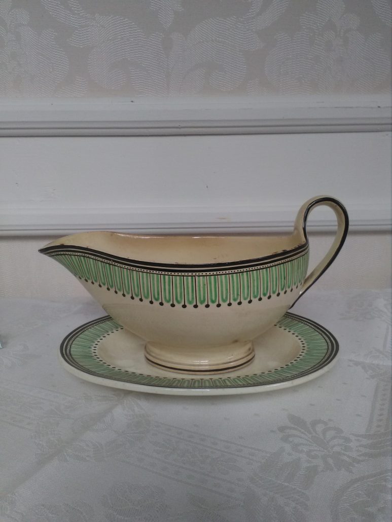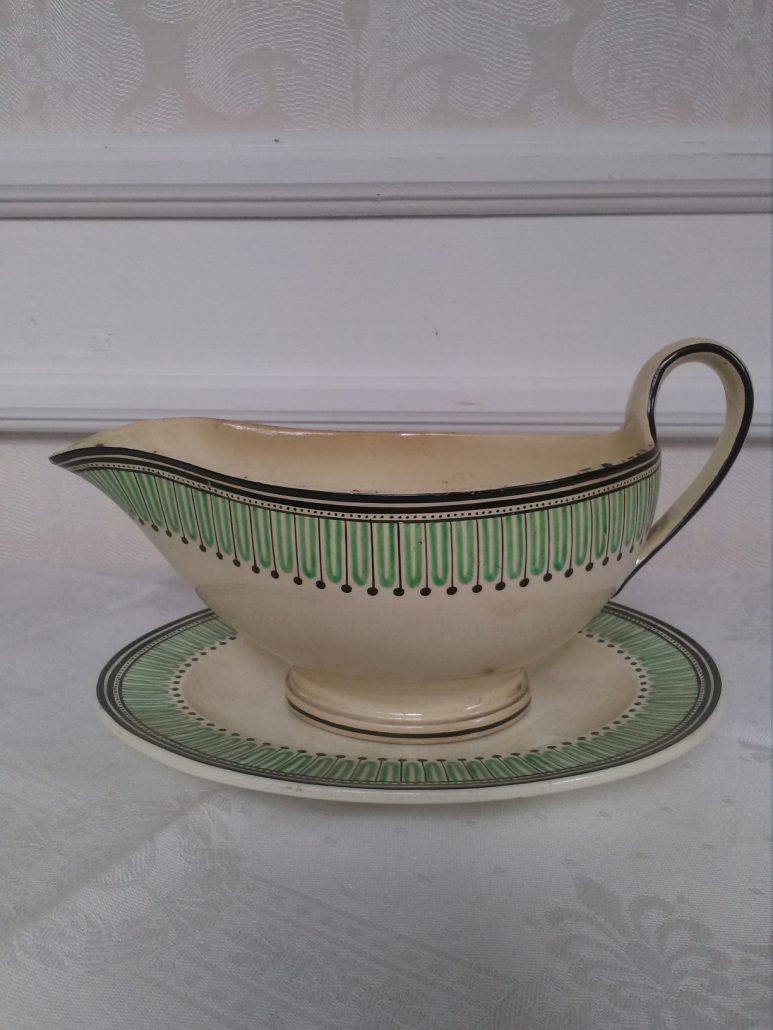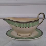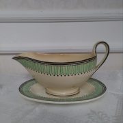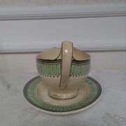 Salsiera in ceramica della manifattura di Wedgwood. Decorata a motivi geometrici concatenanti in verde, completati da piccole rifiniture in nero, l’0ggetto, di elegante fattura, era parte di un grande servizio da tavola. Completa di un piattino ovale decorato con i medesimi motivi.