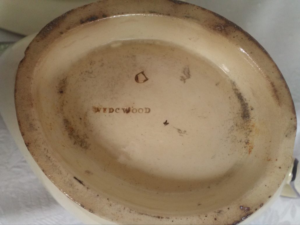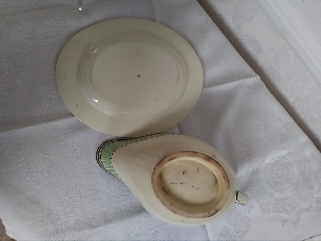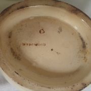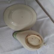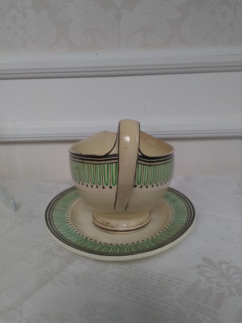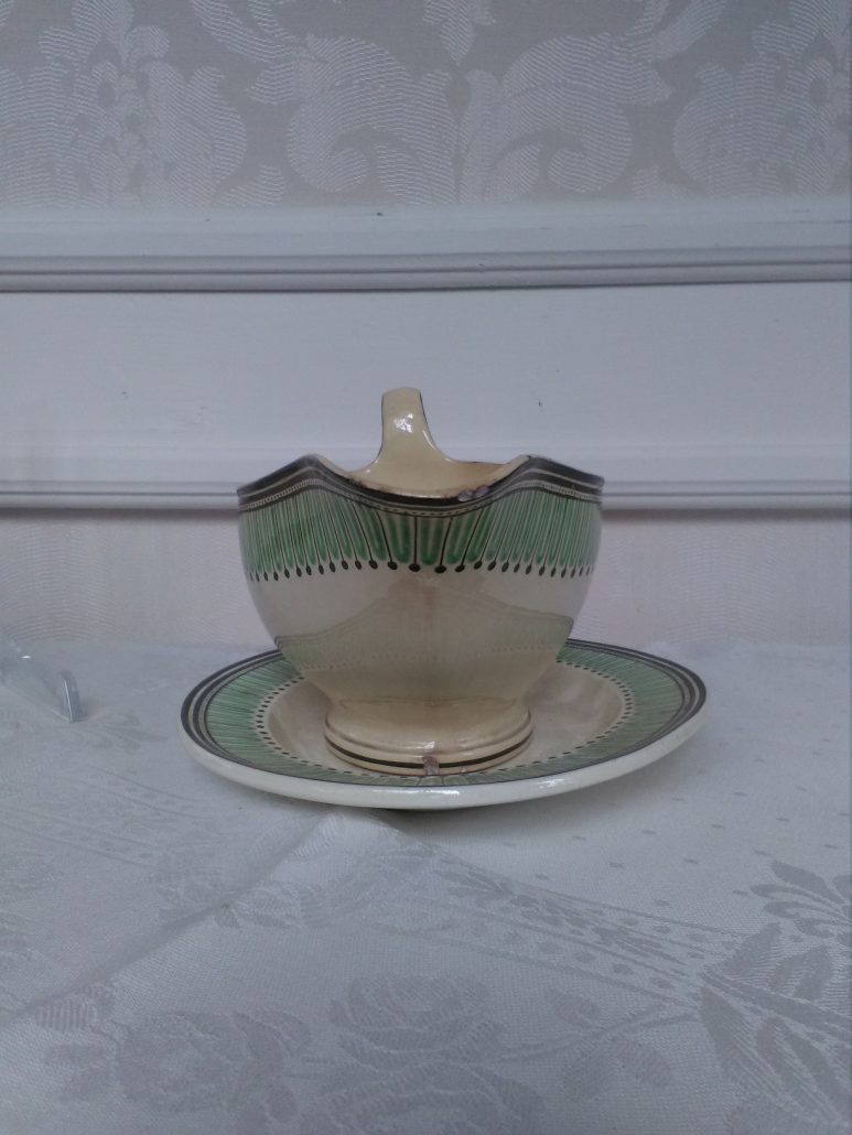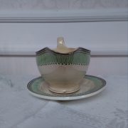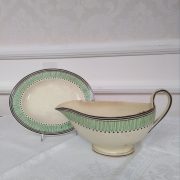 Salsiera in ceramica della manifattura di Wedgwood. Decorata a motivi geometrici concatenanti in verde, completati da piccole rifiniture in nero, l’0ggetto, di elegante fattura, era parte di un grande servizio da tavola. Completa di un piattino ovale decorato con i medesimi motivi.